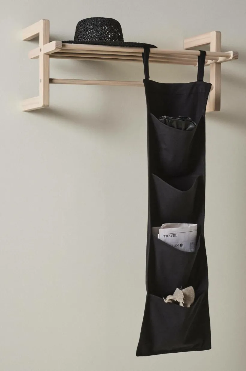 Hängande förvaring av bomull med fyra praktiska fickor. Upptill har förvaringen två hällor med kardborrelås, så du enkelt kan hänga upp den runt en klädstång, en galge eller en rundstav. De fyra fickorna har kartong invändigt för att göra dem extra stabila. Förvaringsfickorna är perfekta i hallen, i barnkammaren och överallt där du behöver lite extra förvaring.