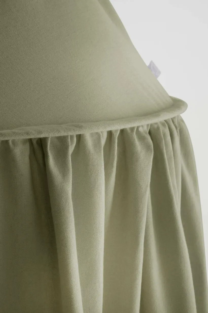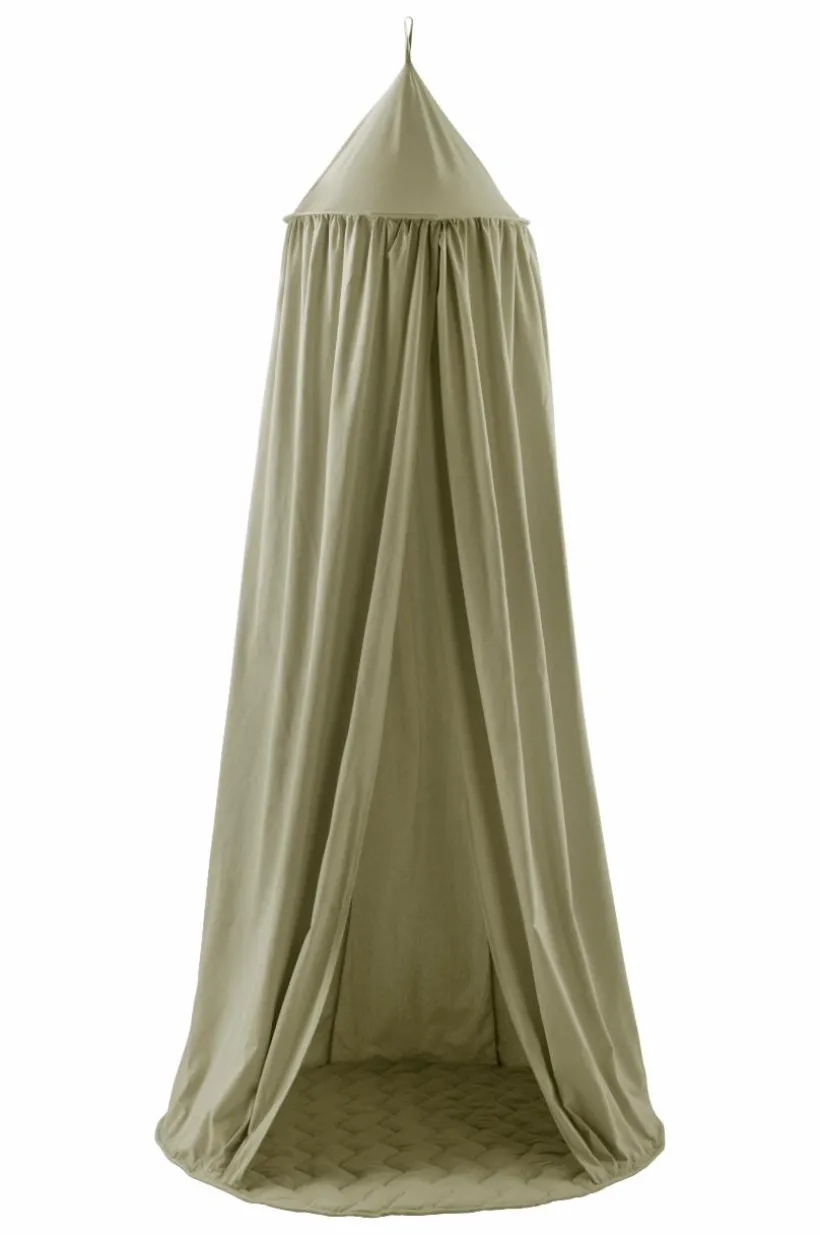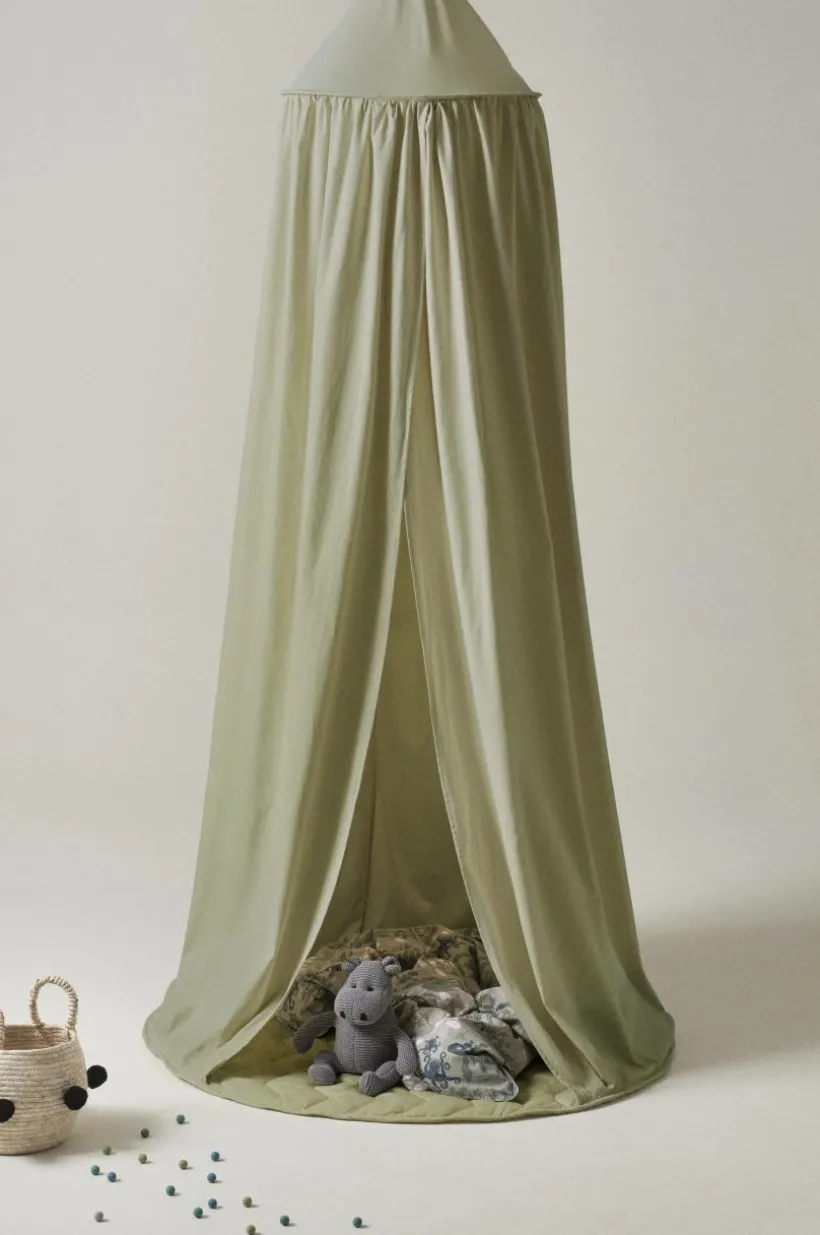 Runt tält av bomullstyg och tältet har vadderat golv som är quiltat så barnet sitter mjukt. Tältet håller formen tack vare en metallring som är insydd upptill i tältet. Du hänger upp det på en krok i taket och det faller sedan mot golvet och blir ett mysigt krypin i barnkammaren.