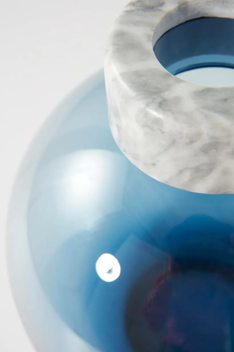 Klotrund glasvas med vacker marmorkant som extra detalj. Den smala öppningen gör det ofta lättare att få blommorna i en vacker bukett. Marmorringen upptill kan enkelt tas av.