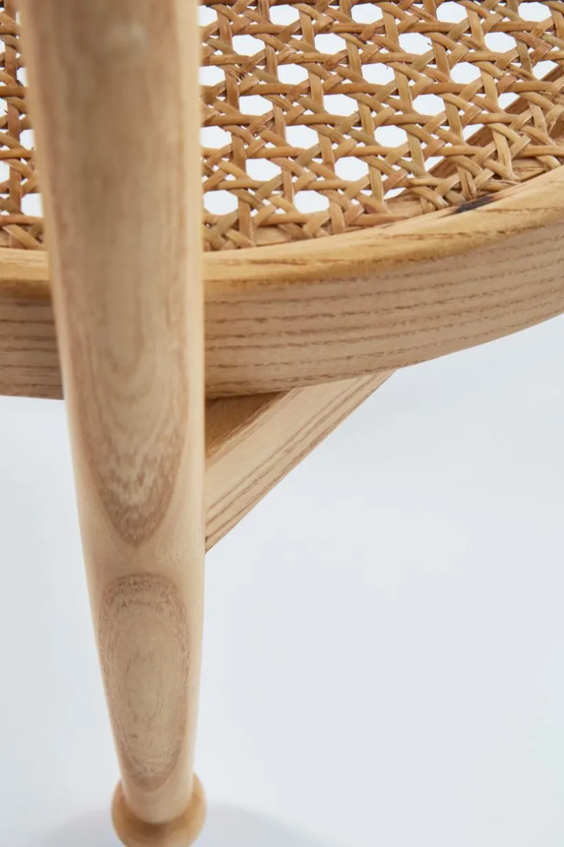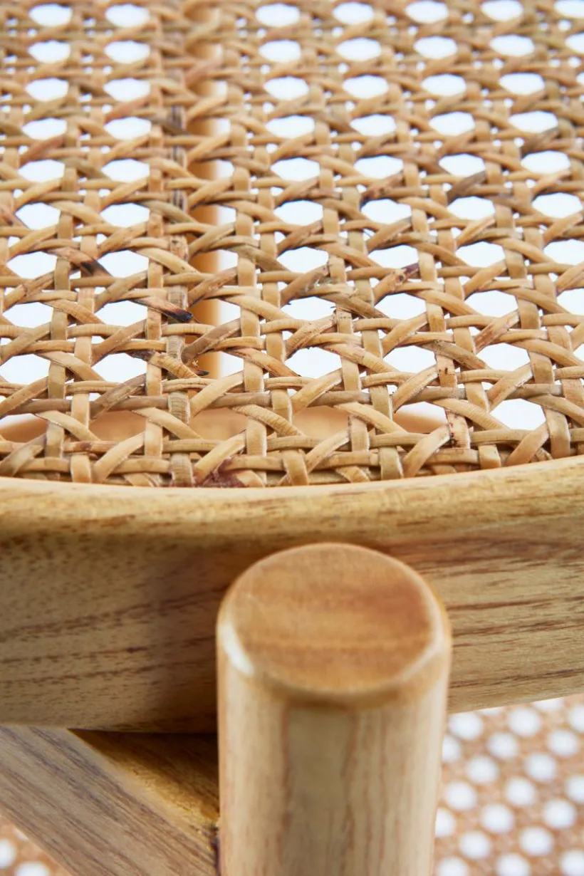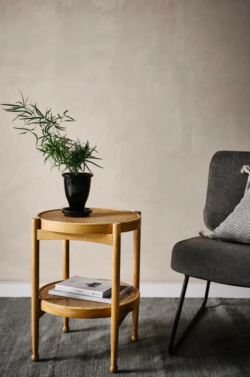 Litet, runt sidobord med bordsskiva av rotting. Ramen runt bordsskivan och benen är av ljust almträ eller svartmålad björk.