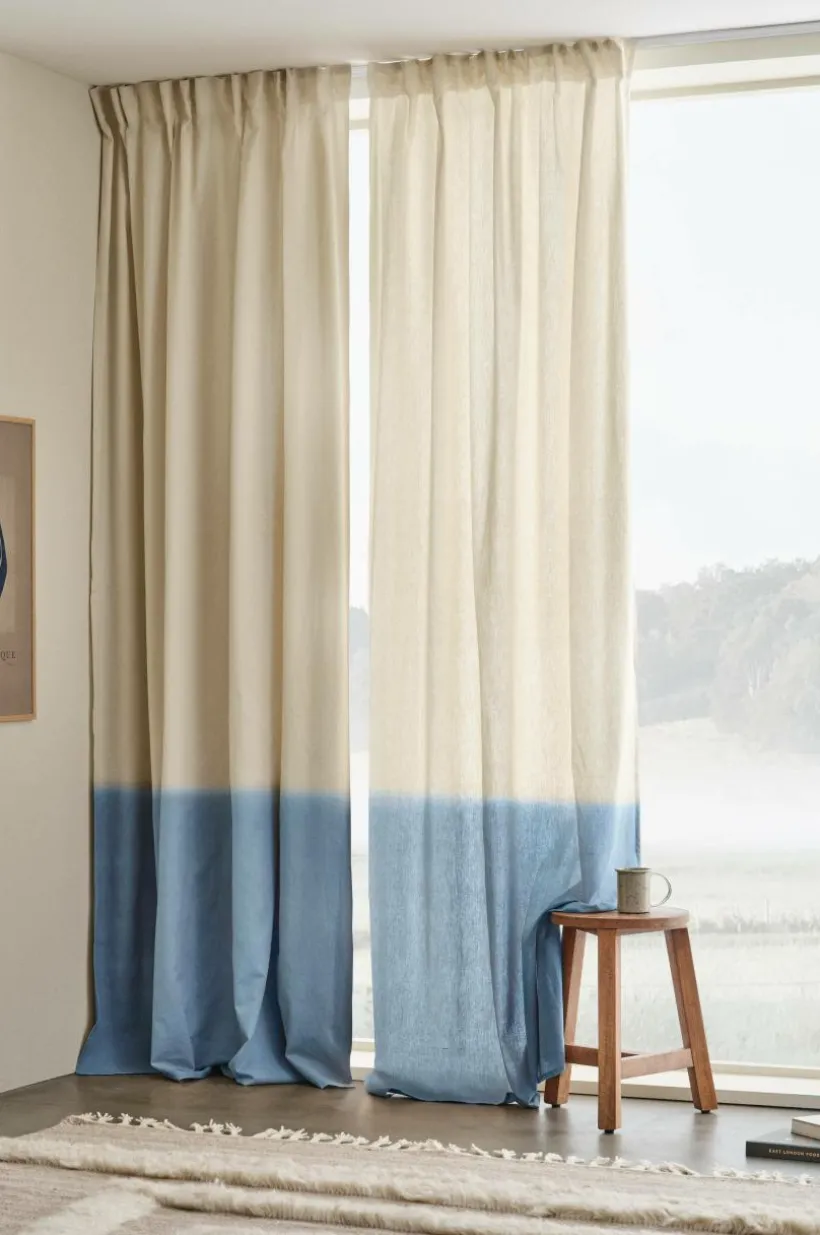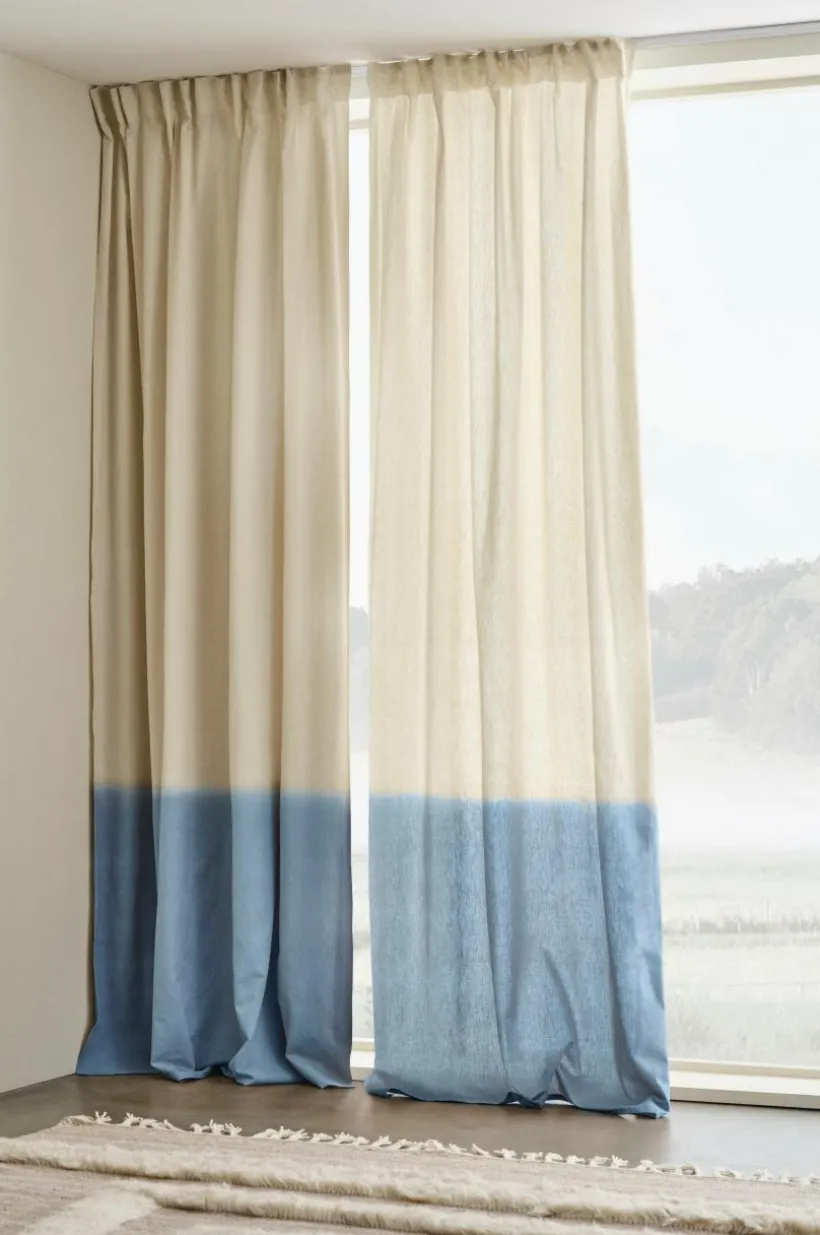 Två gardinlängder av bomull och lin i fin kombination, tyget har lätt linnestruktur. Gardinlängderna är härligt färgade med avvikande nyans nedtill, den diffusa övergången ger skön batikkänsla. Längderna har påsytt multifunktionsband. Gardinen kan hängas upp med fingerkrokar, kanal samt dold hälla.