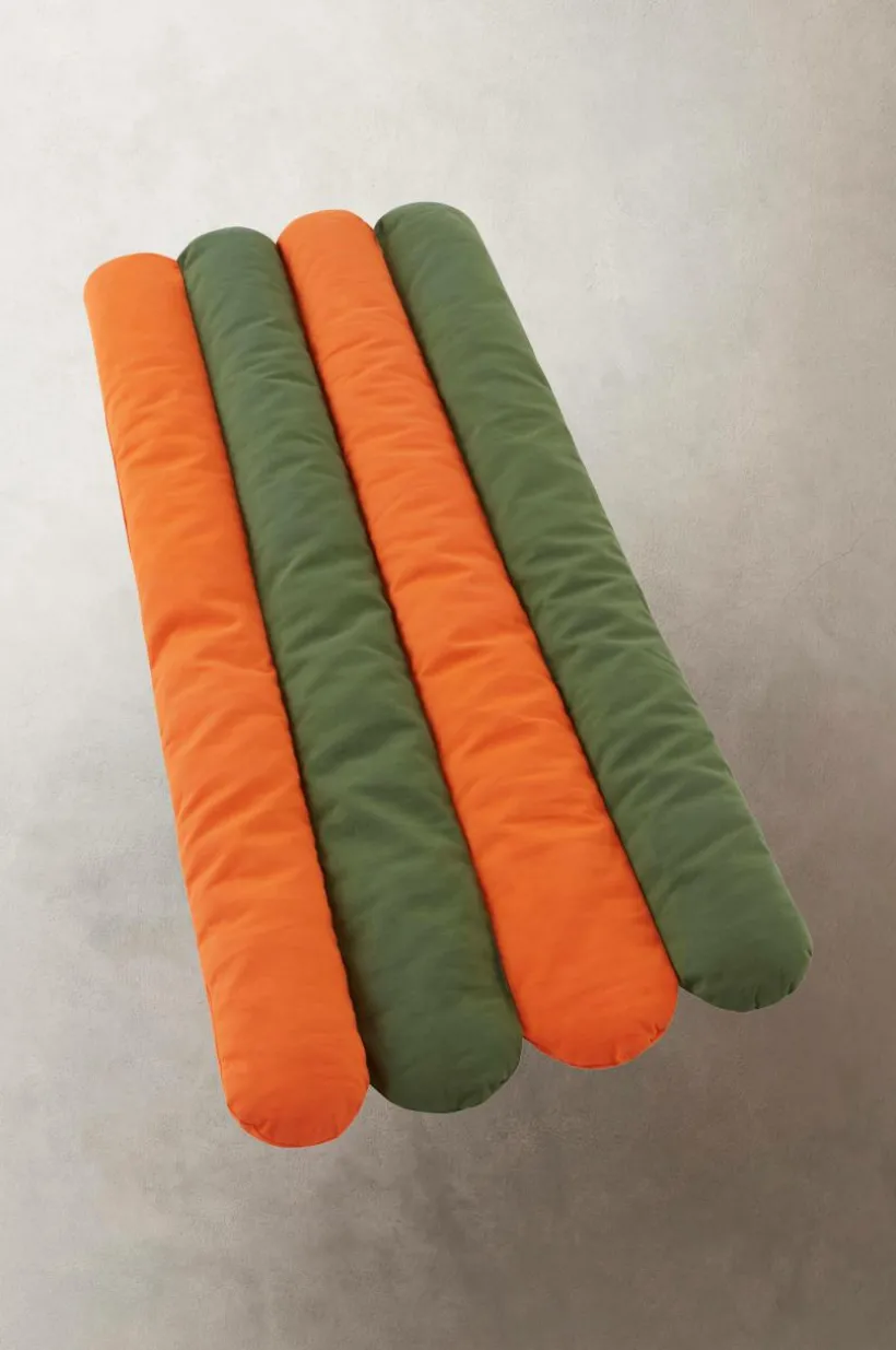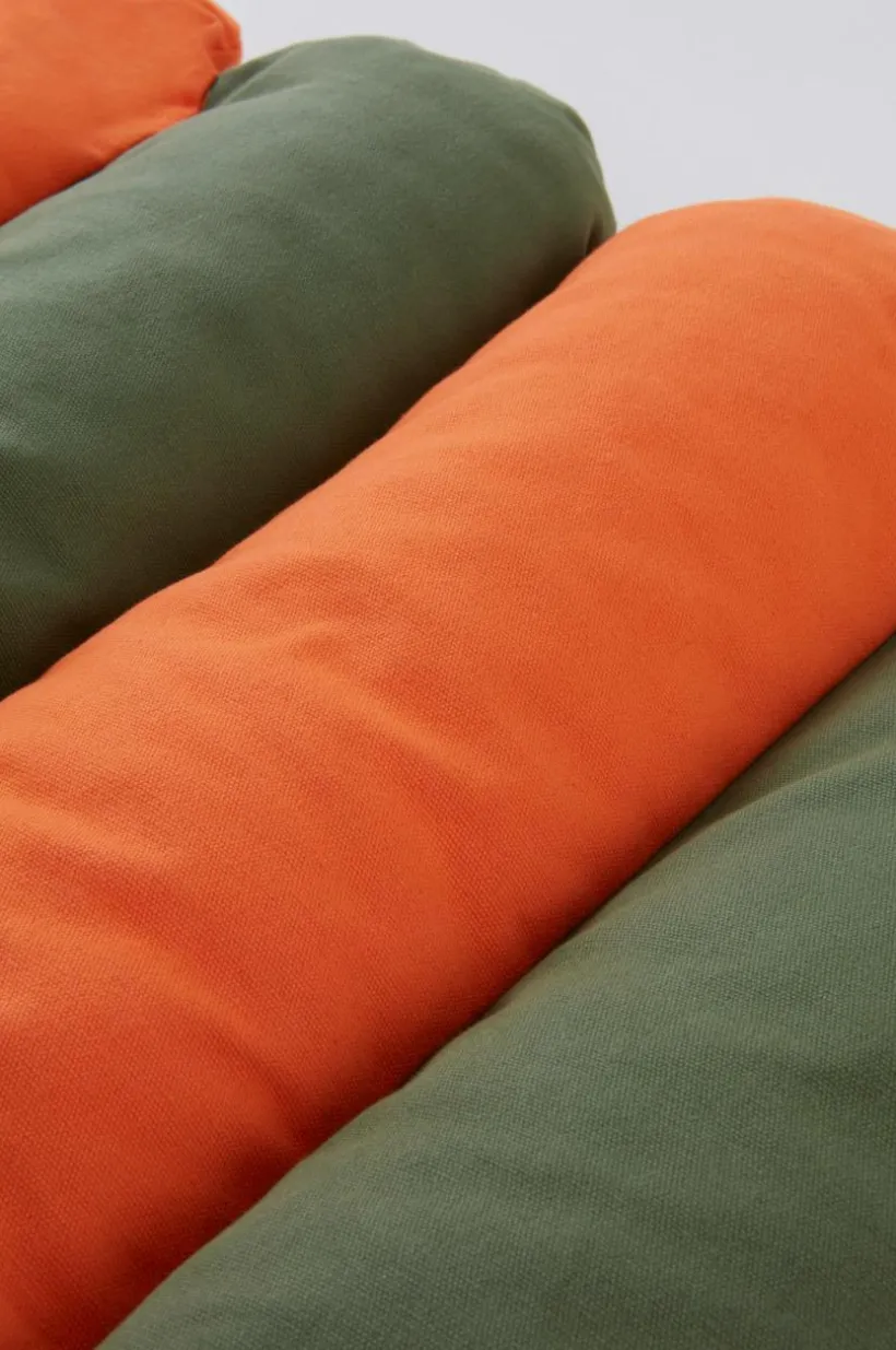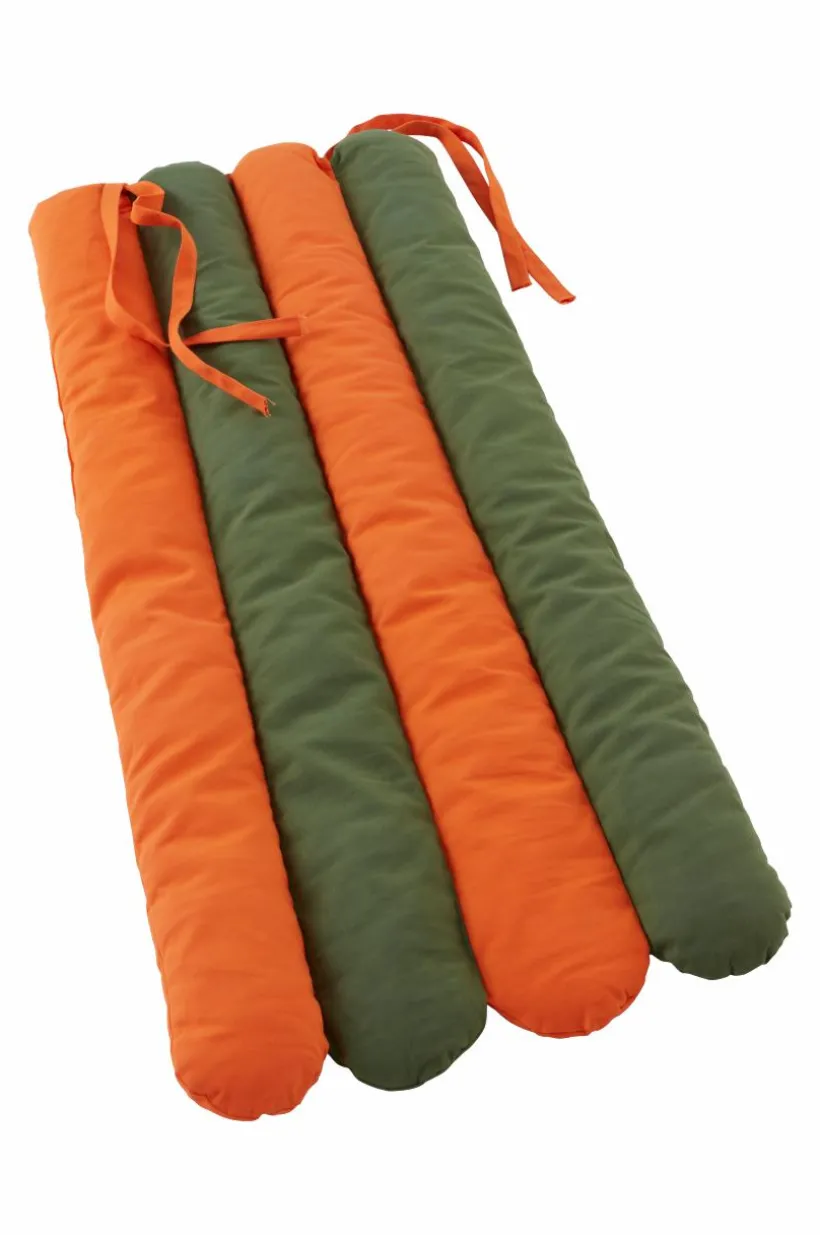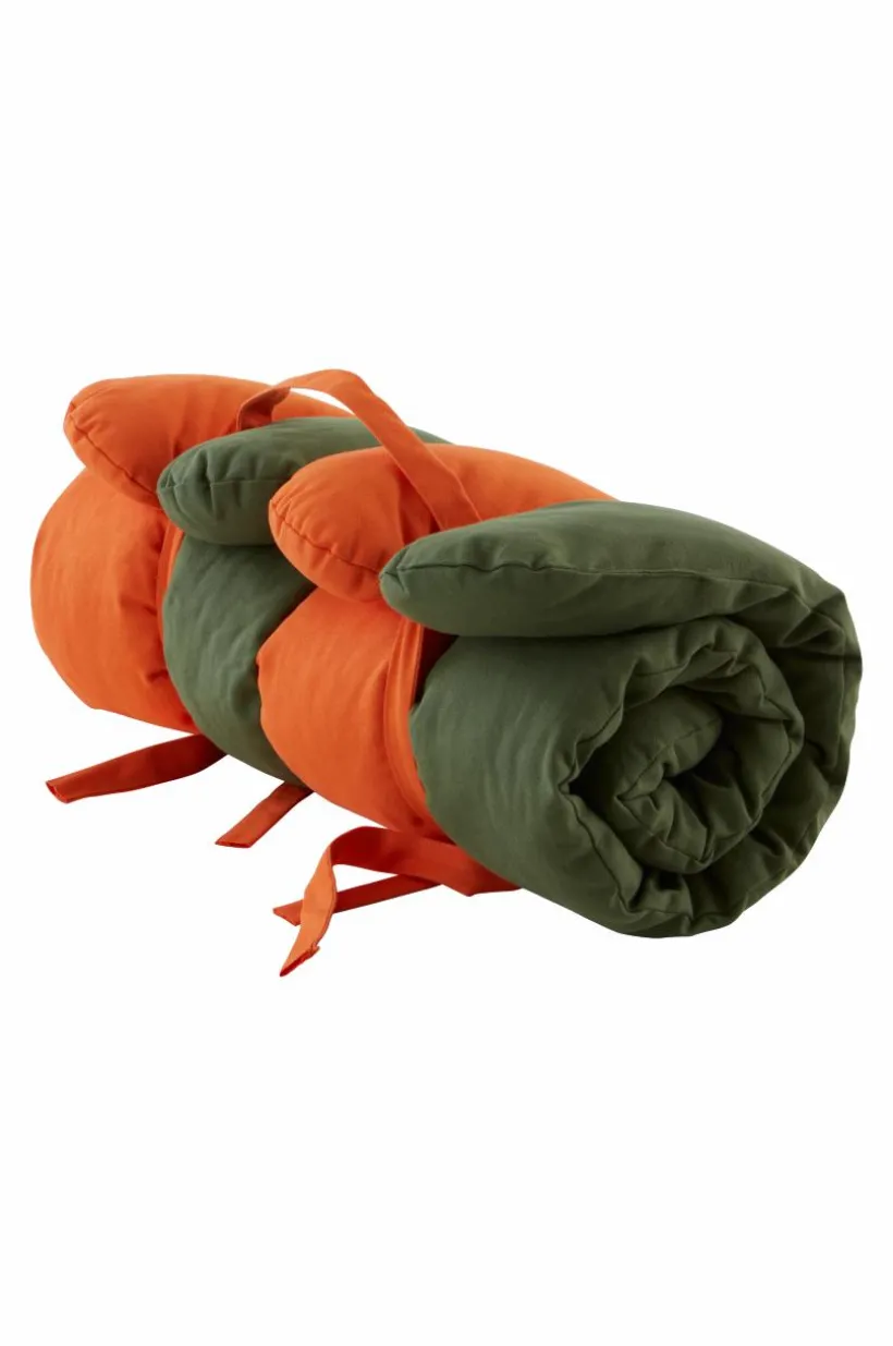 Färgglad strandmadrass för barn. Strandmadrassen är tvåfärgad i vävt yttertyg av bomullscanvas med mjuk fyllning av polyester. Madrassen är kanalsydd så att fyllningen sitter på plats. Med praktisk bärrem är den enkel att ta med till stranden eller ut i trädgården. Ihoprullad stängs den med knytband med kardborre.