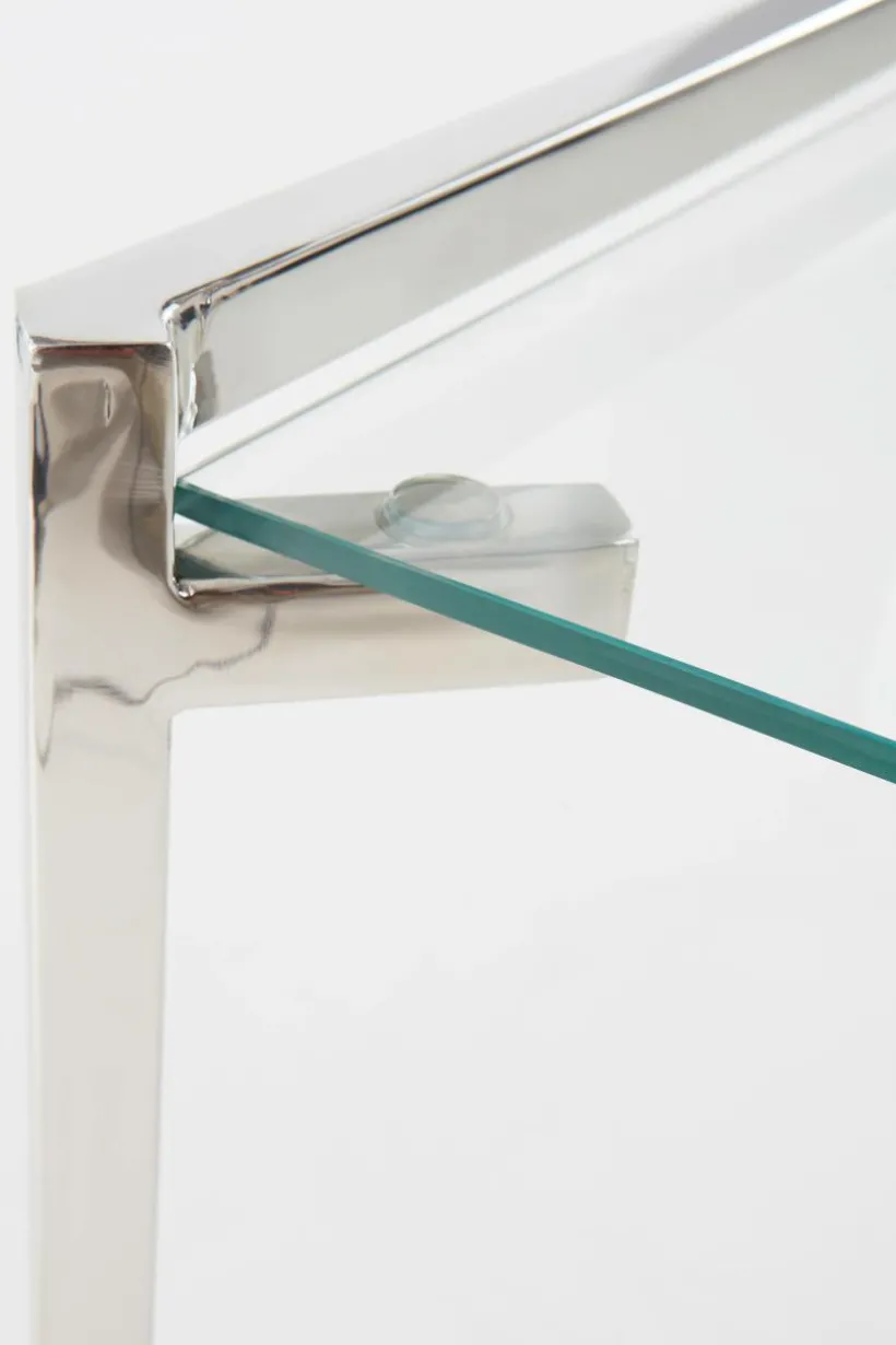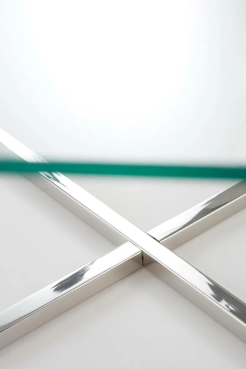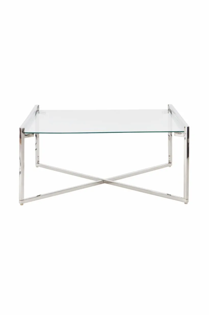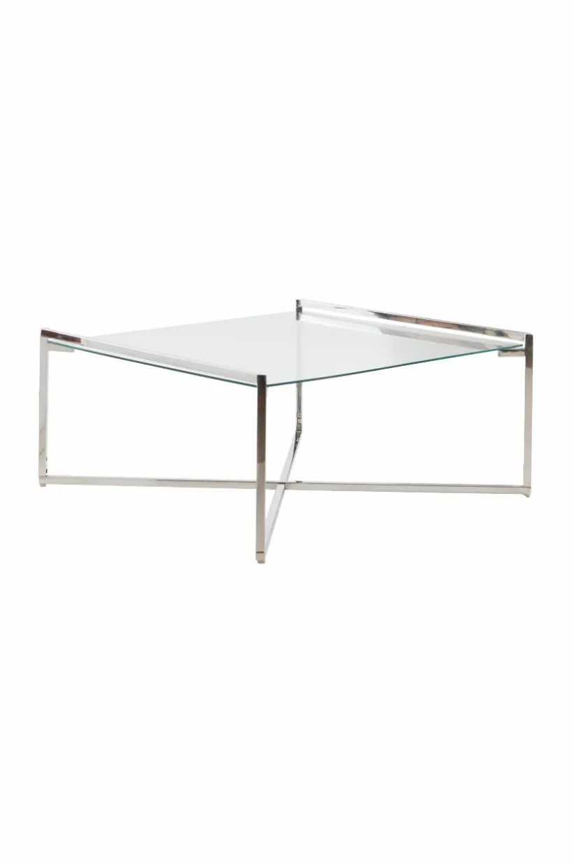 Fyrkantigt soffbord med bordsskiva av härdat klarglas och ben av stål med högblank yta. Glasskivan i kombination med att stålprofilen kommer upp ovanför bordsskivan på två sidor ger bordet speciell karaktär. Underredet har modern och stilren design som ger en lätt och fräsch känsla. Det är tillverkat av stålprofil som är fyrkantig med mjukt rundade kanter och bordsskivan vilar nedsänkt i benstativet. Viss montering krävs.