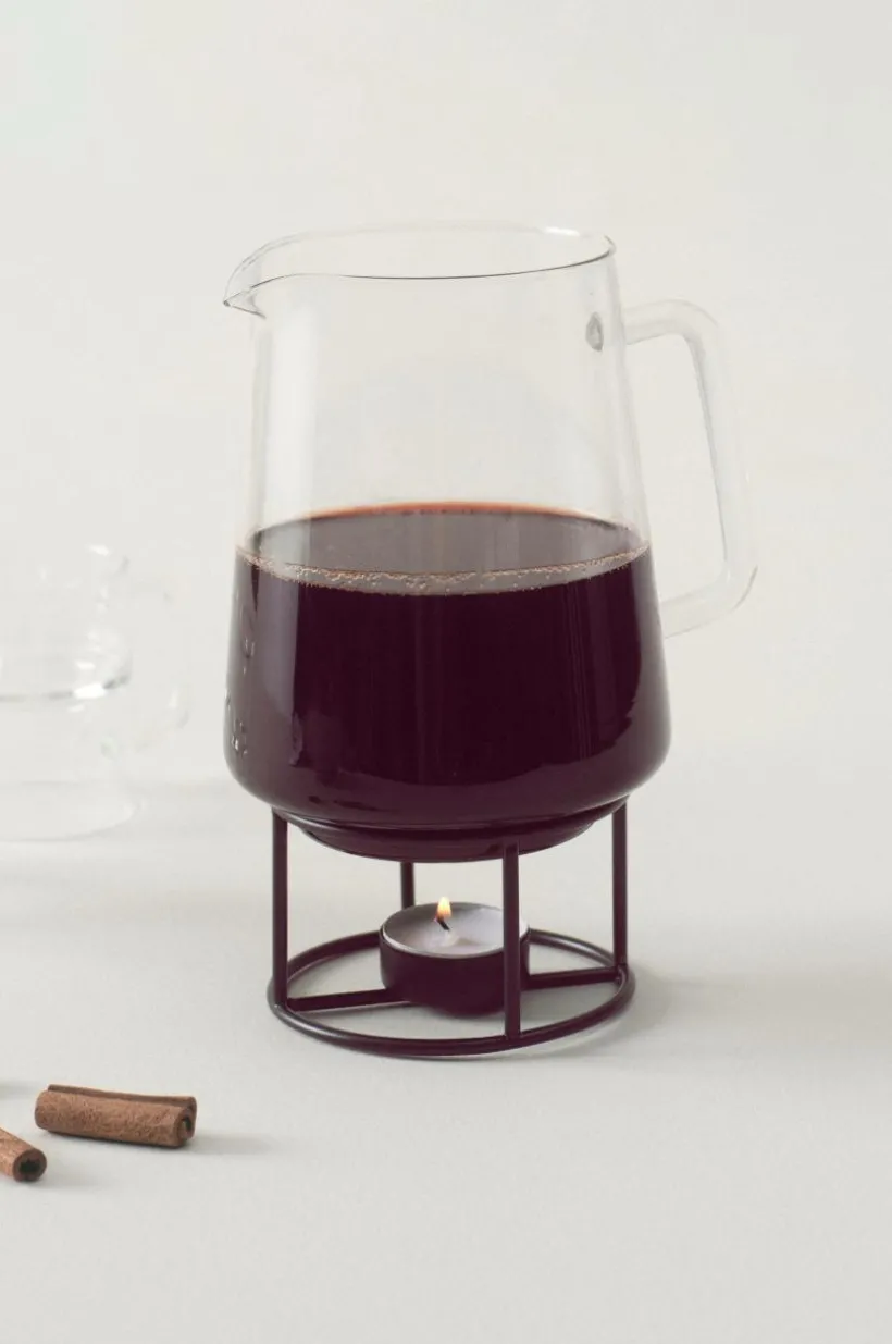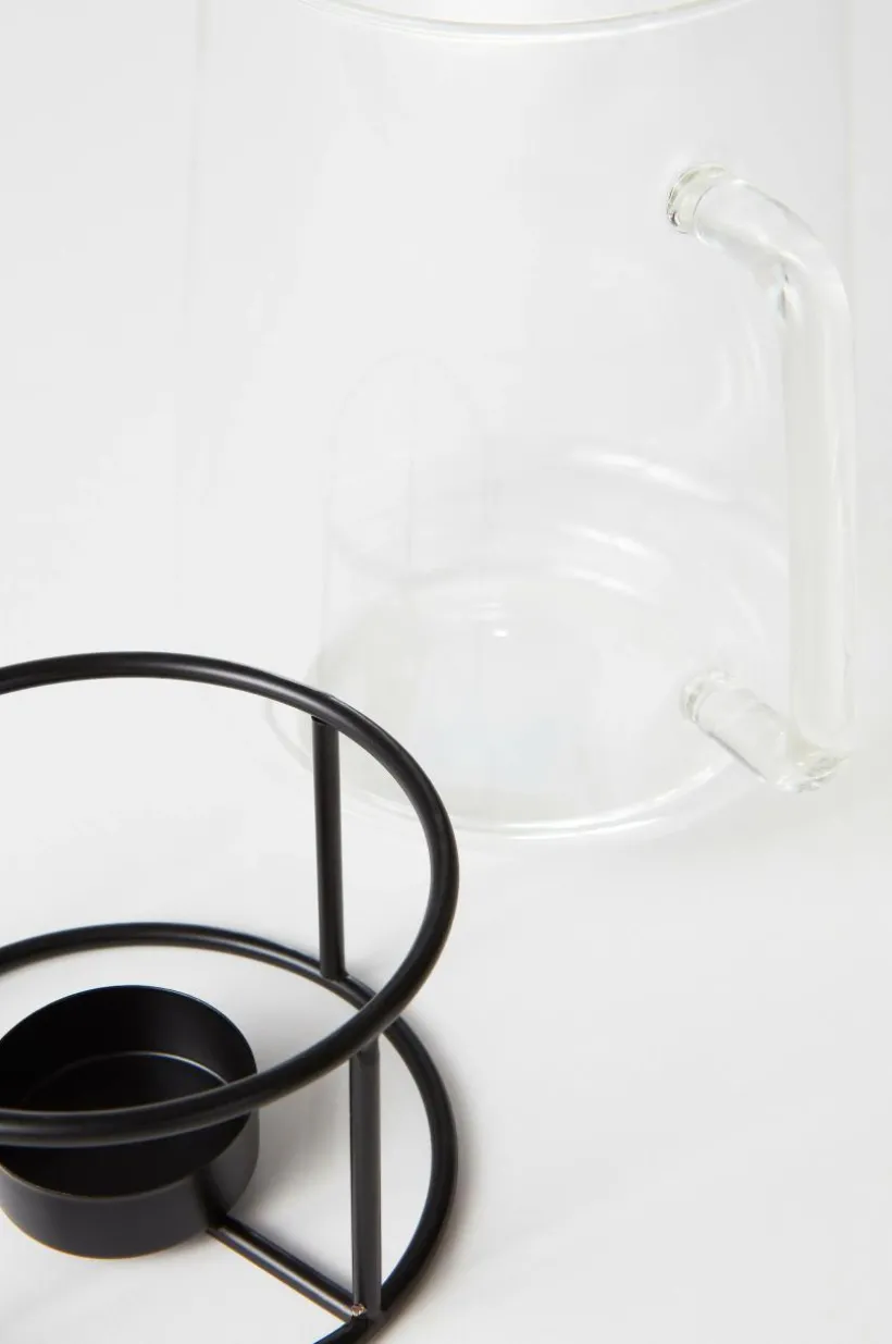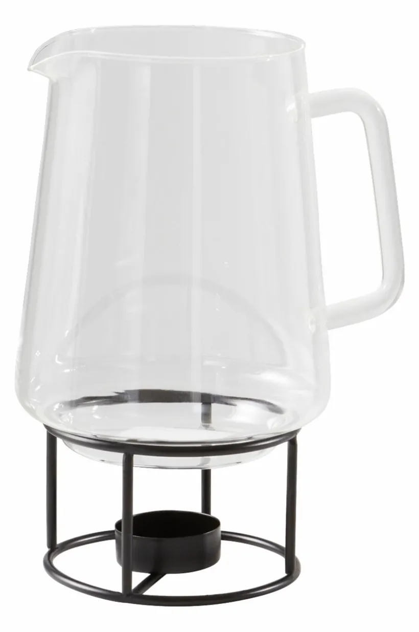 Karaff av klarglas med ställning av järn. Karaffen har lodräta ränder i glaset och ett praktiskt handtag. Ställningen har plats för värmeljus så du kan hålla drycken varm. Ställningen är svartlackerad.