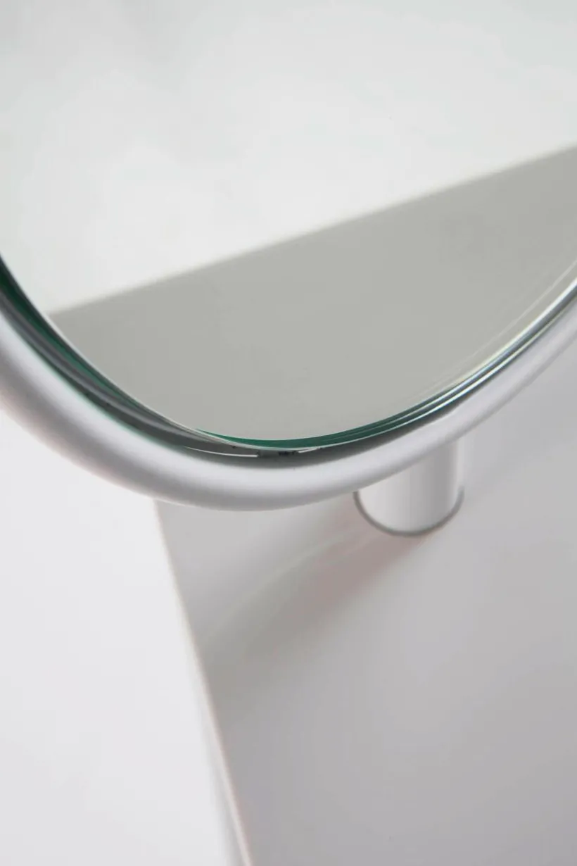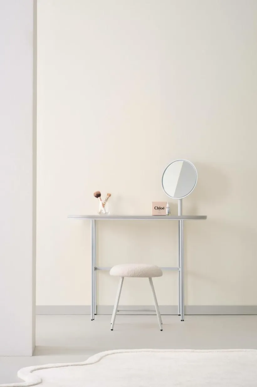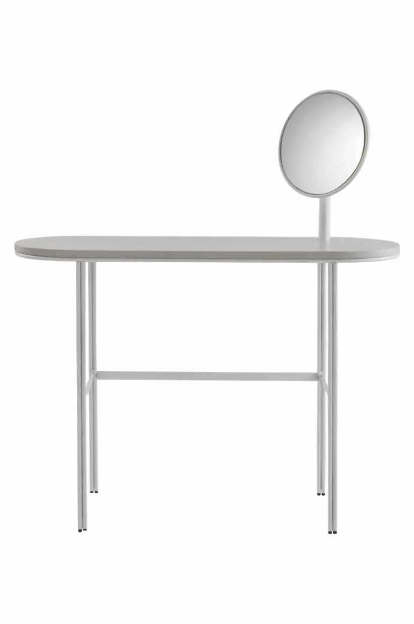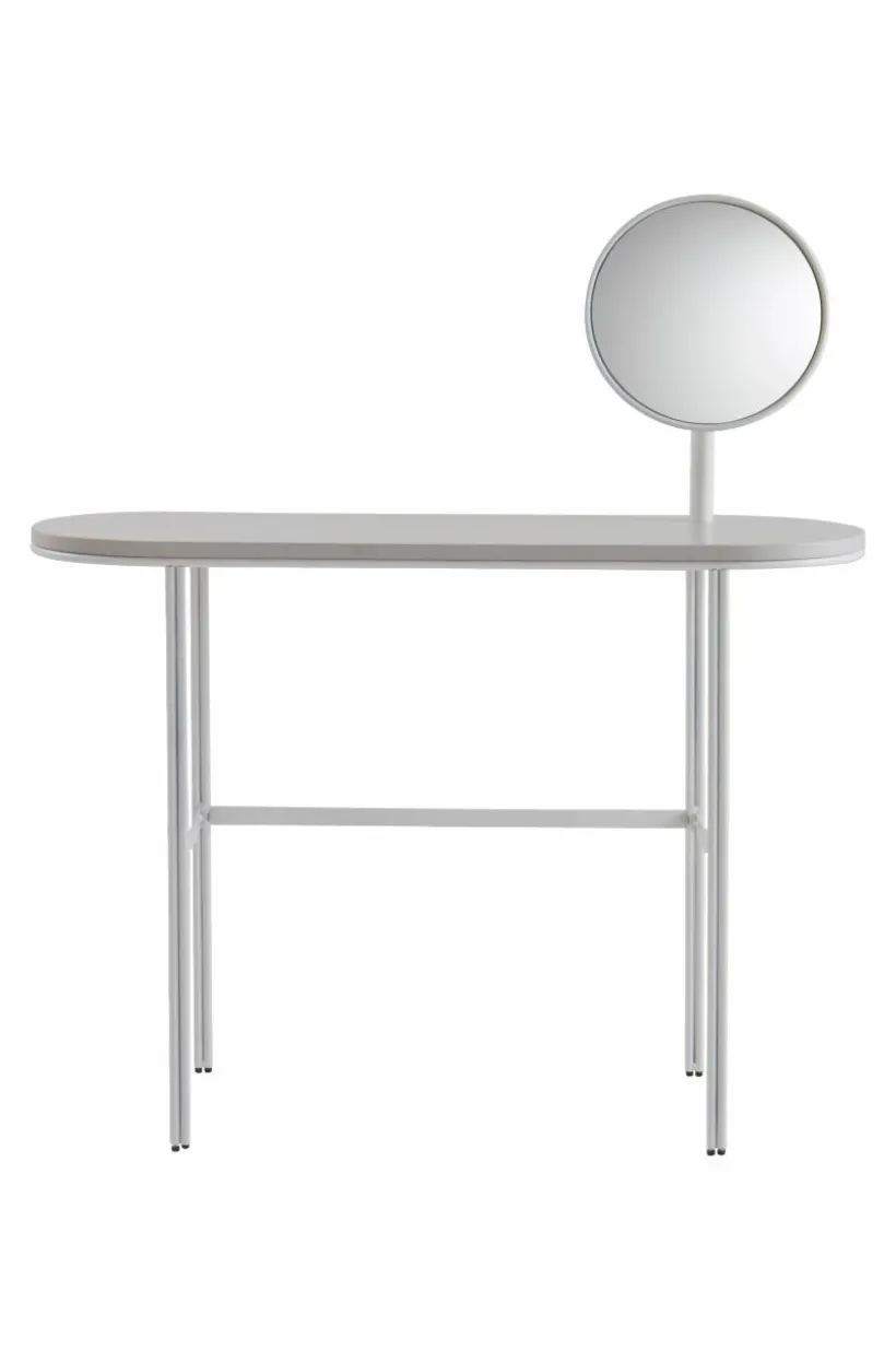 ISOLA sminkbord har en rund spegel, perfekt för din morgonrutin. Sminkbordet passar utmärkt i ett tonårsrum eller varför inte i en walk-in closet? Ben av järnrör med en elegant bordsskiva av MDF ger en modern touch. Förhöj din inredning med denna snygga och funktionella möbel.