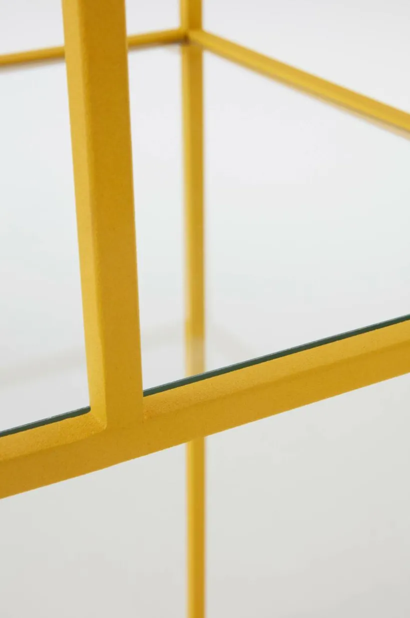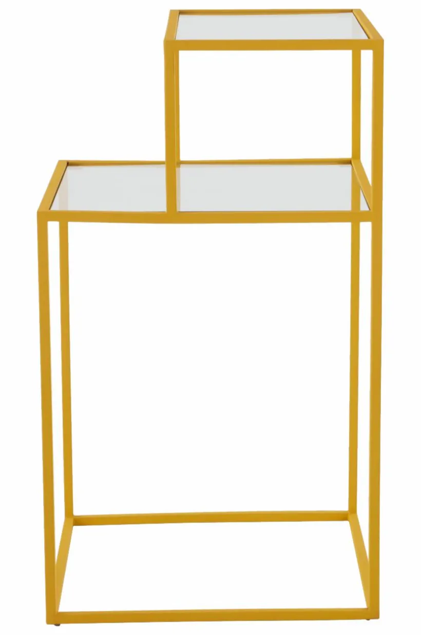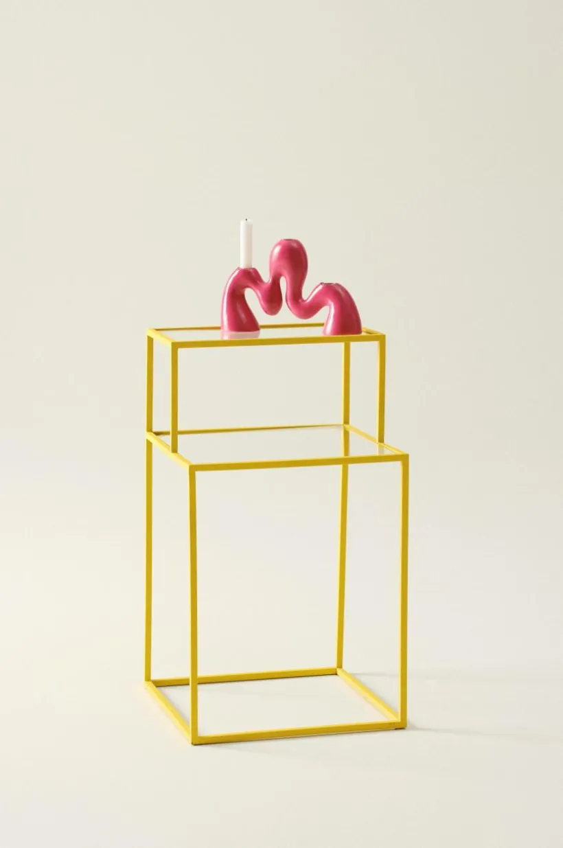 Sidobord av järn med två bordsskivor av glas som placerats på olika höjd, den ena lite större än den andra. Stommen är enfärgad och ytan har pulverlackerats med matt finish. Modellen inbjuder till många olika användningsområden och de glada färgerna piggar upp. Vill du göra ett mer stillsamt val så är det svarta bordet ett bra alternativ.