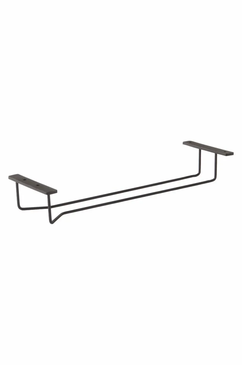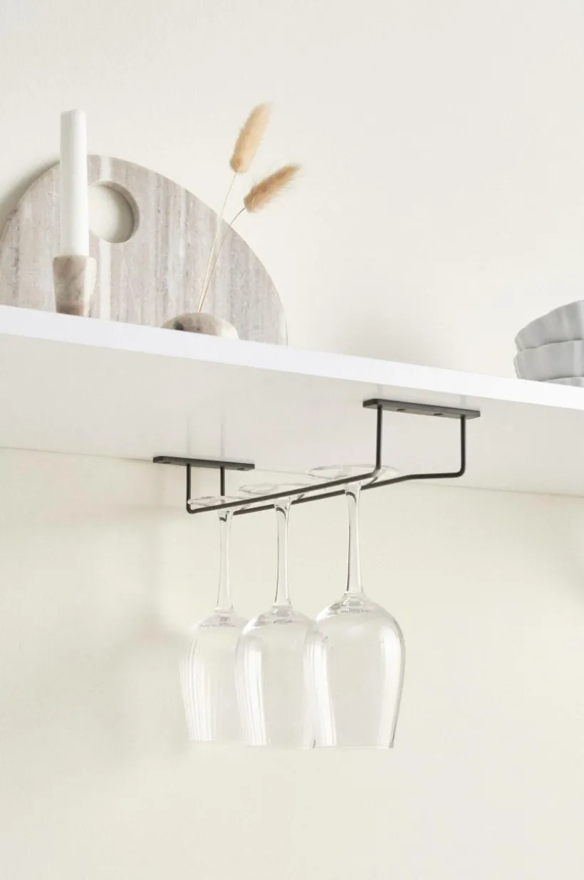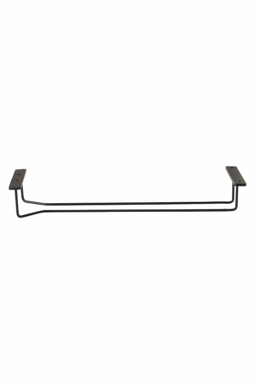 Vinglashållare av järn i rustik och samtidigt nätt modell. Hållaren har ett spår som du skjuter in glasens fot i så de hänger upp och ned. Hållaren skruvas upp under en hylla eller ett köksskåp och ger snygg, och lättåtkomlig, öppen förvaring av dina vinglas. Hållaren är målad i mattsvart färg.