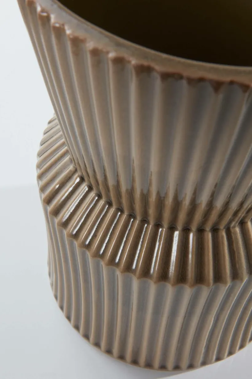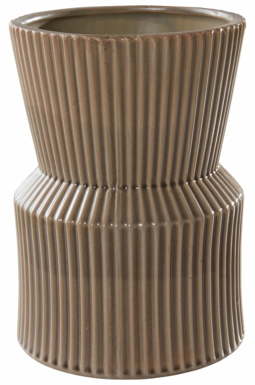 Handgjord keramikvas med randmönster i en naturlig nyans där glasyren har krackelerad yta. Vasens form samlar snittblommor som till exempel tulpaner i en vacker bukett. Även insidan är glaserad. Det fina hantverket gör varje vas unik. Tänk på att keramik kan släppa igenom fukt.