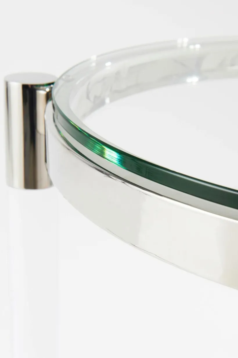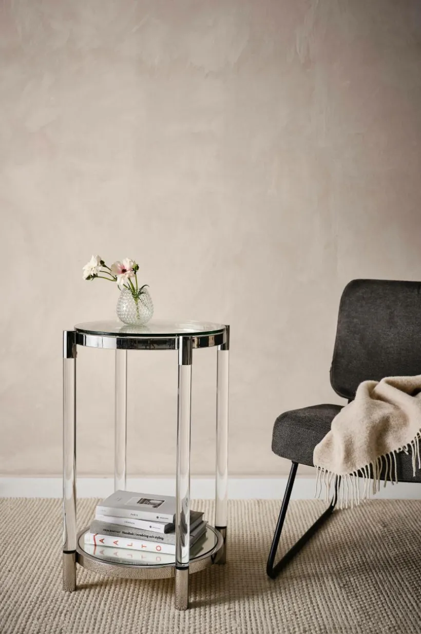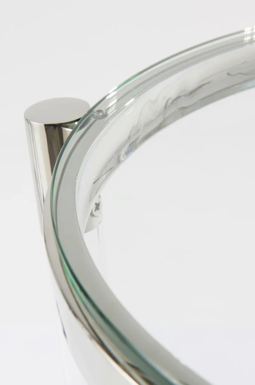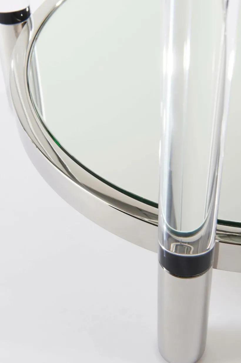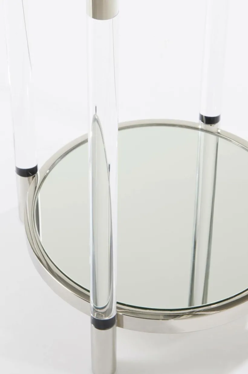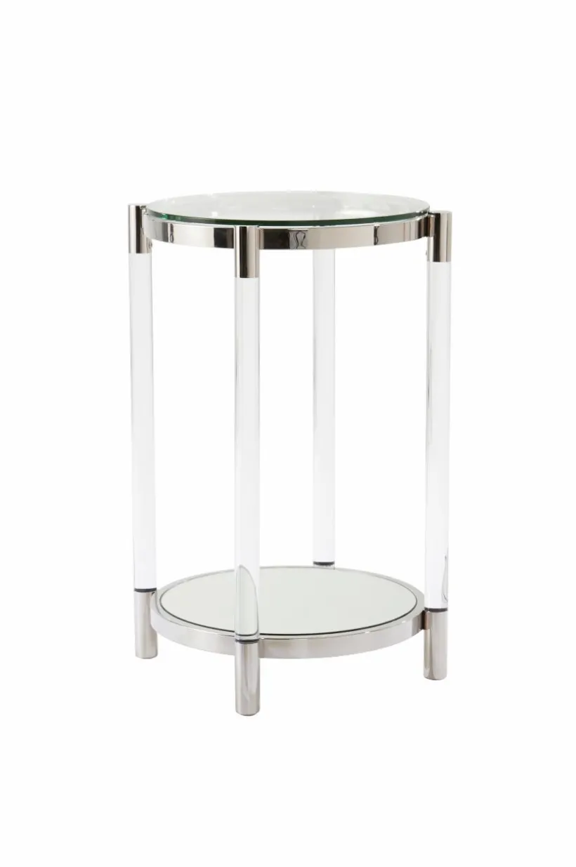 Runt sidobord av härdat glas, rostfritt stål, akrylglas och MDF. Bordet är lyxigt och glamouröst med bordsskivan av klarglas och avlastningsyta med spegelyta. Bordsbenen är akrylglas med silverfärgade detaljer. Bordet passar fint vid soffan och blir samtidigt en vacker solitär. Viss montering krävs. Monteringsanvisning medföljer.
