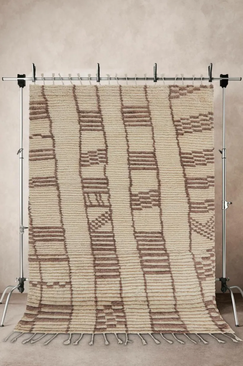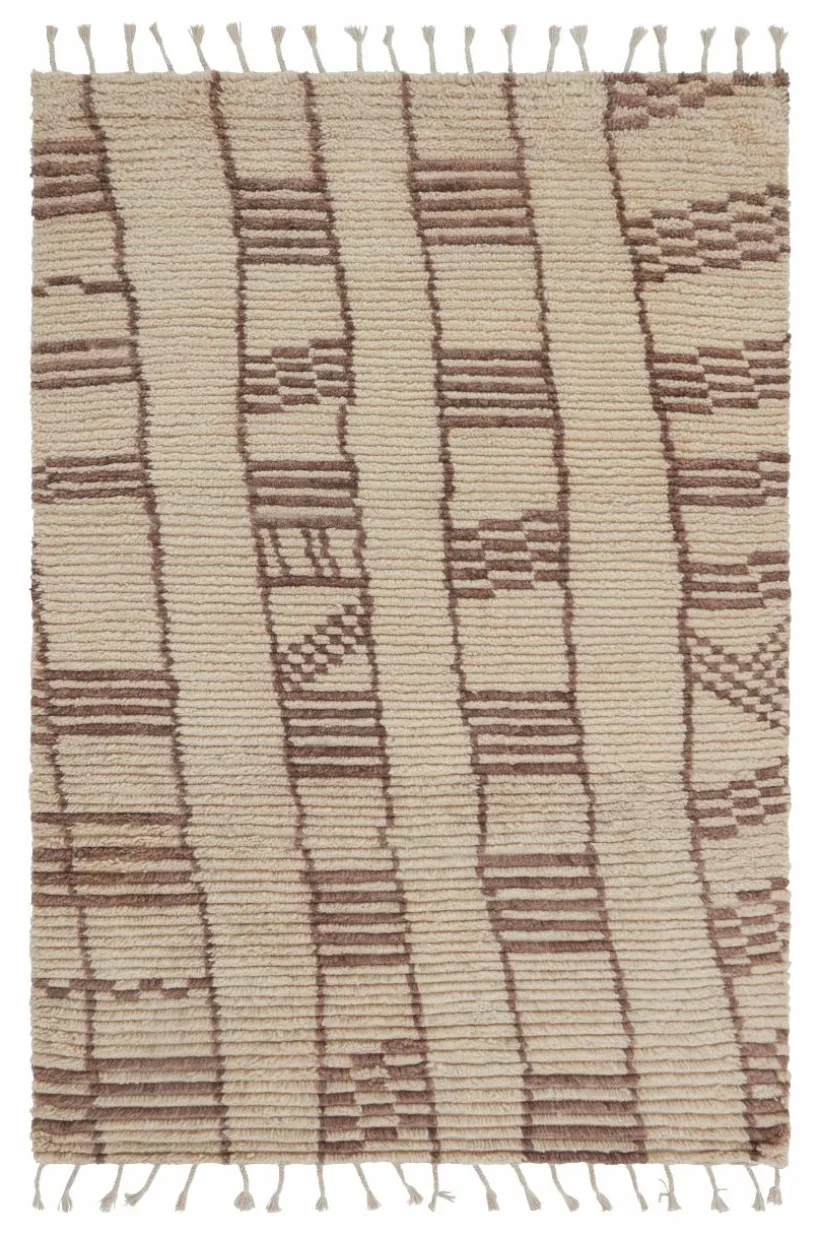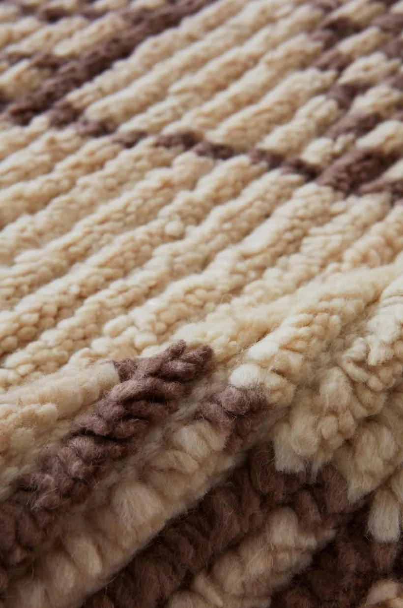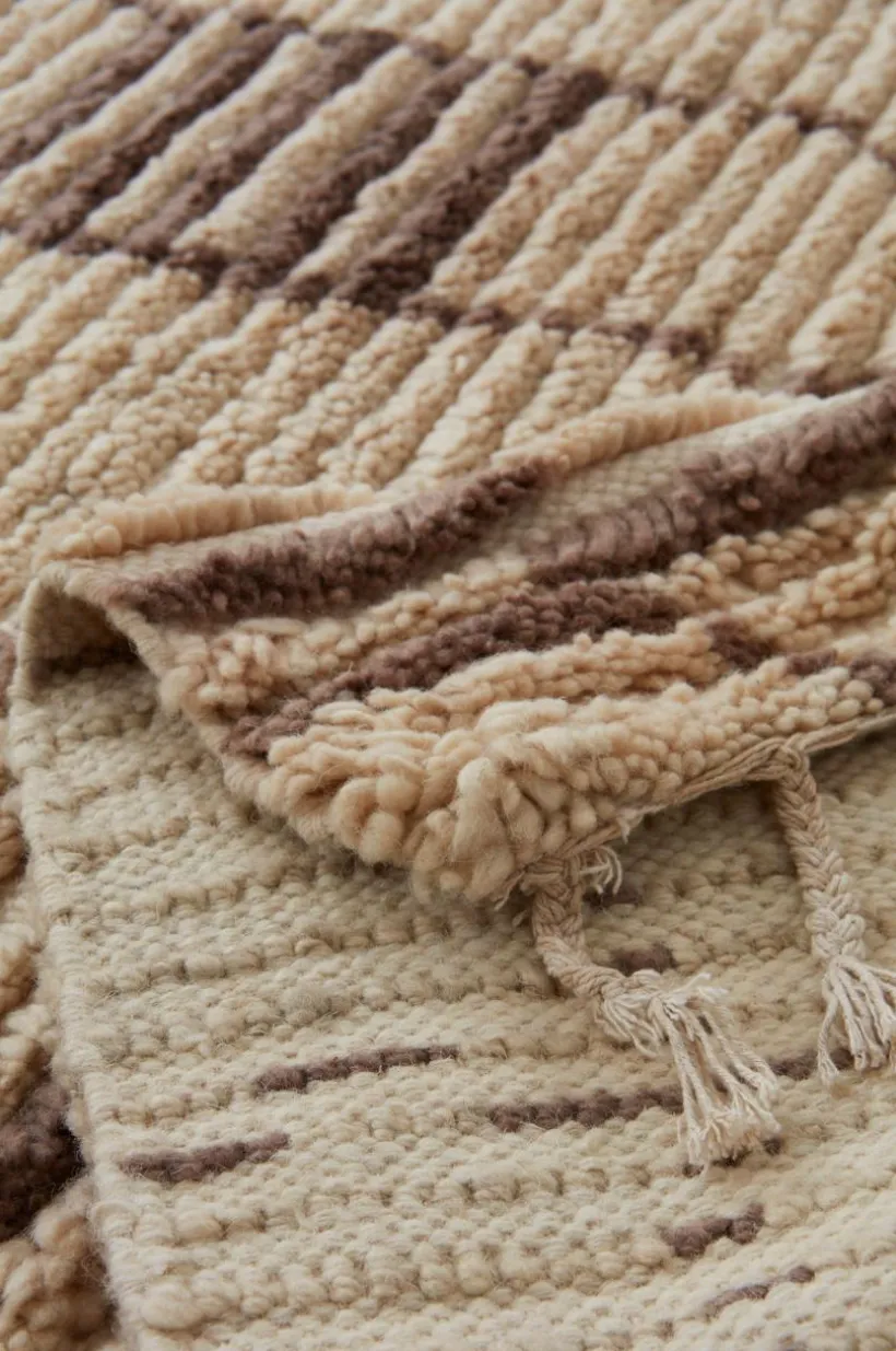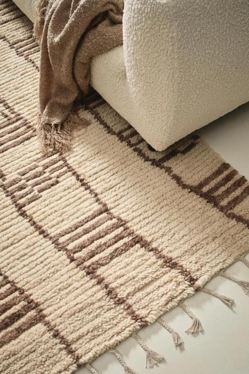 Handvävd matta i skön, varm ullkvalité med liten inblandning av bomull. JEEMA är marockansk i stilen med asymmetriskt randmönster som går i beige och bruna toner. Mattan har mjuk och skön lugg en fin franskant längs kortsidorna. Ull är ett naturligt material som värmer skönt och är helt perfekt för dig som har lite kalla golv hemma. Ull är dessutom ett praktiskt val då ullen är naturligt smutsavvisande. Det fina hantverket gör varje matta unik. Franslängd 10 cm. Lugghöjd 1,5 cm. Tjocklek 2,3 cm. 2300 g/m².