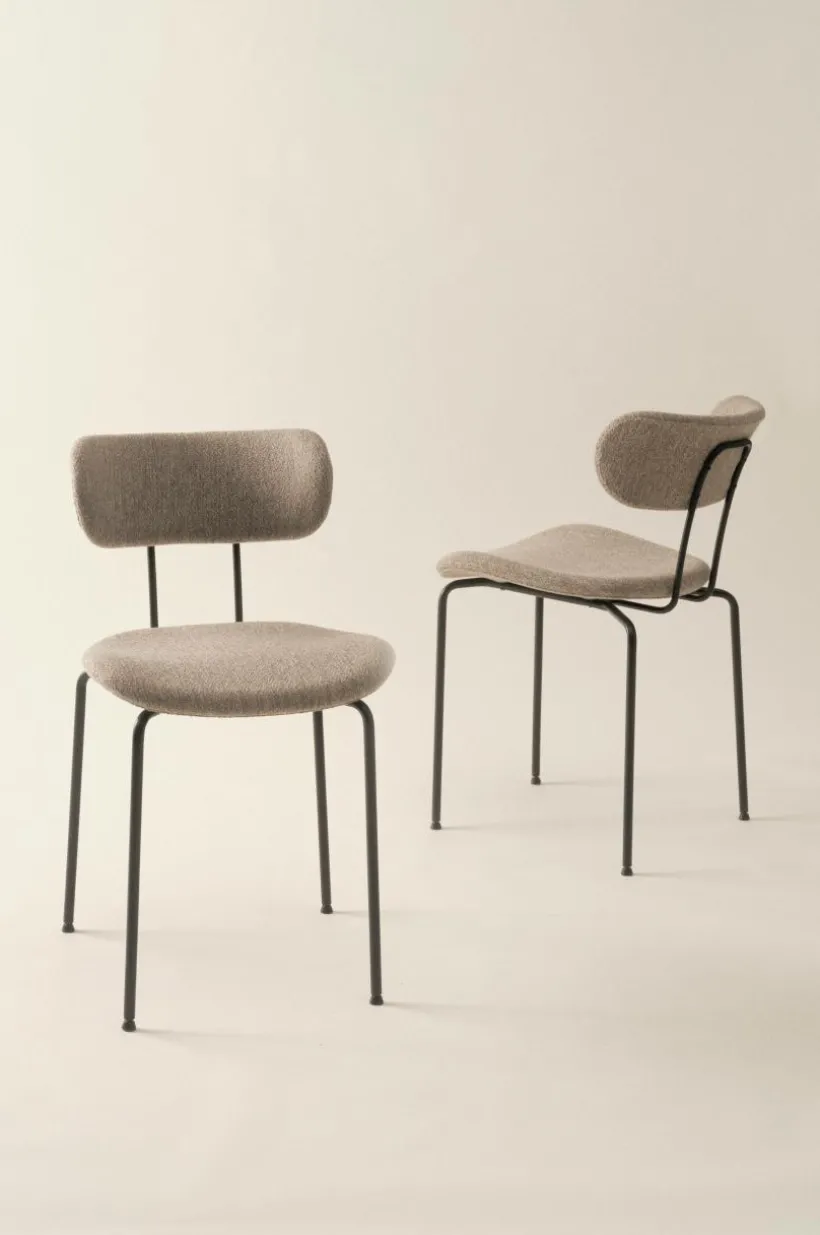 2-pack stolar med sits och ryggstöd som är lätt vadderade och textilklädda, benen är av pulverlackerad stål. Tyget är lätt melerat och har fin struktur. Det är mycket slitstarkt med Martindale på 40000. Med smalt, skålat ryggstöd blir stolen nätt och lättplacerad. Viss montering krävs. Monteringsanvisning medföljer.