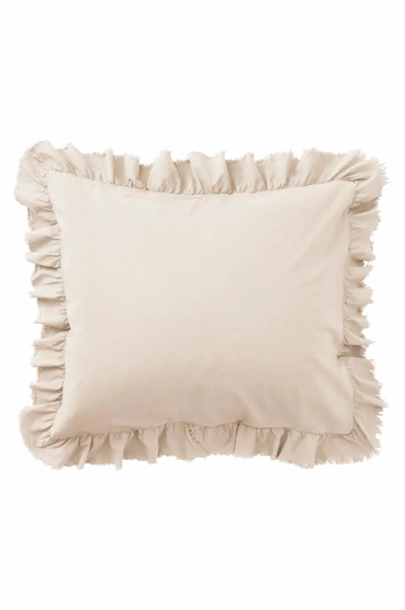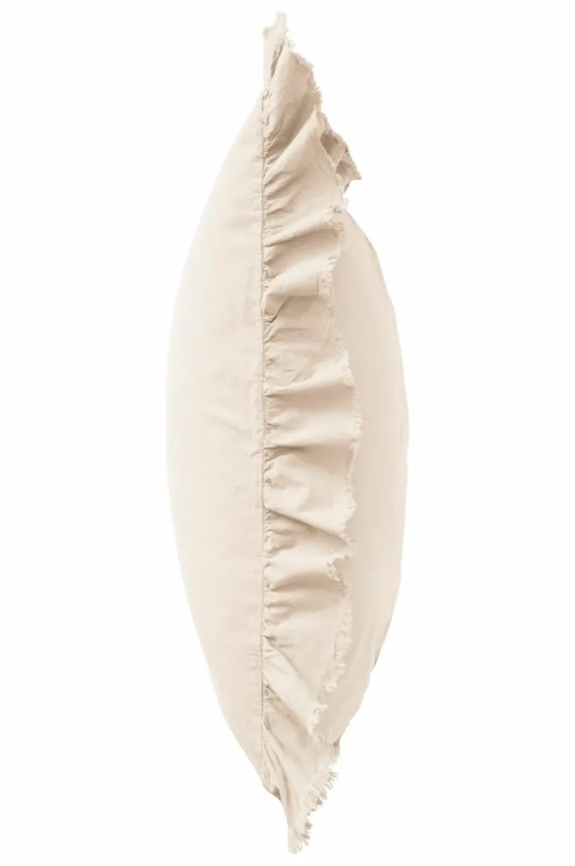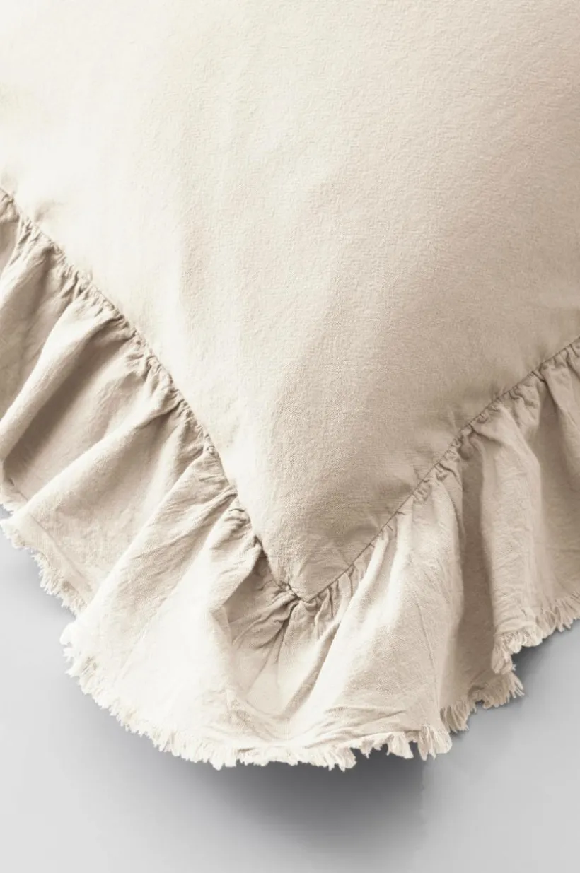 Örngott av tvättad bomull med mjuk känsla. Bomull är behagligt att bädda med och upplevs svalt och skönt mot huden. JINN har en lätt fransig volangkant runt om. Trådtäthet på 144 tc. (Trådtätheten talar om antalet trådar, thread counts, per kvadrattum i ett tyg. Ju högre trådtäthet desto högre kvalité.)
