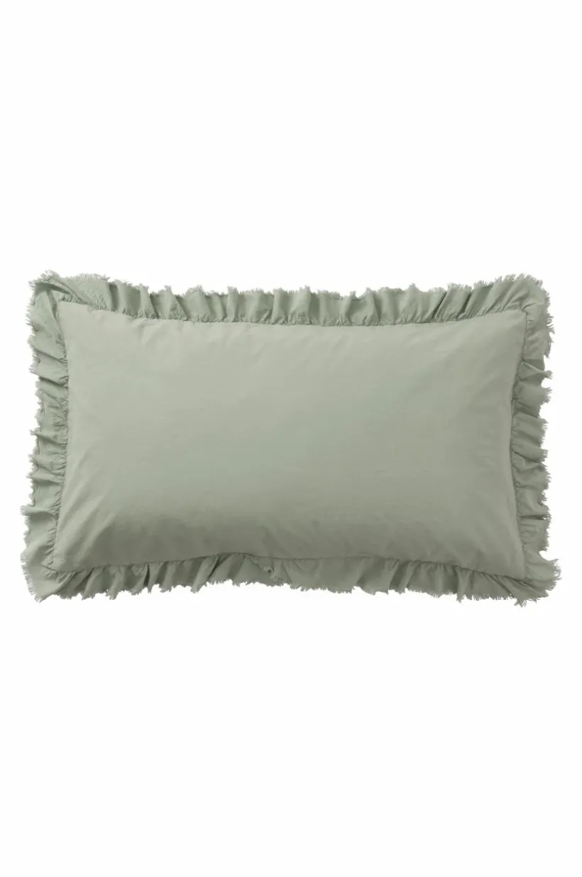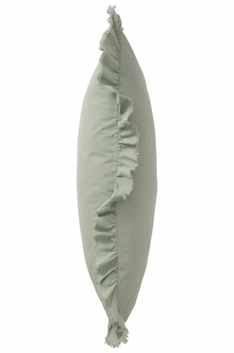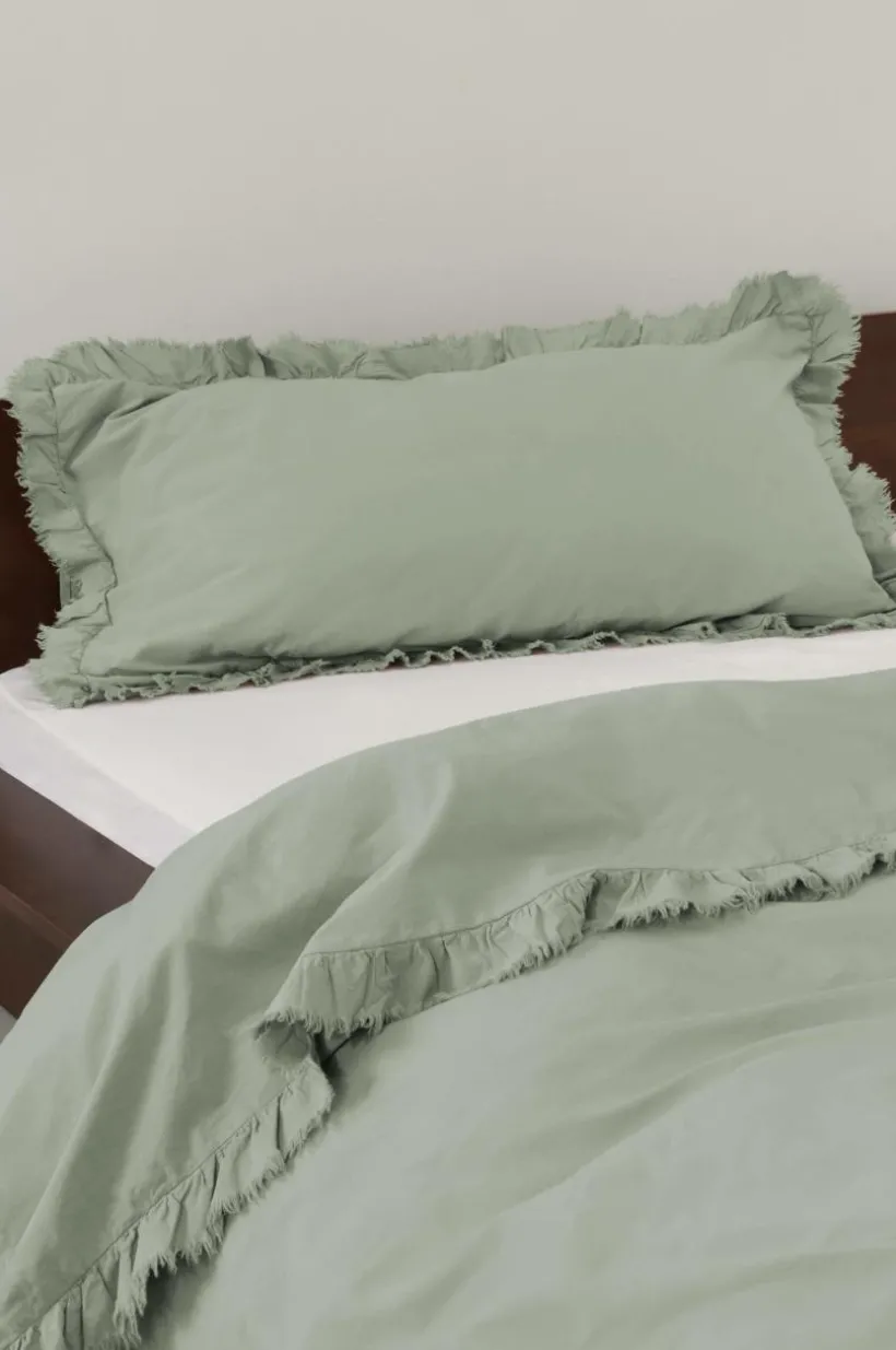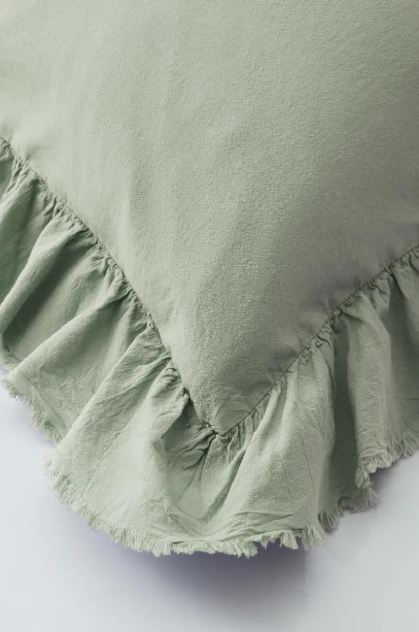 Örngott av tvättad bomull med mjuk känsla. Bomull är behagligt att bädda med och upplevs svalt och skönt mot huden. JINN har en lätt fransig volangkant runt om. Trådtäthet på 144 tc. (Trådtätheten talar om antalet trådar, thread counts, per kvadrattum i ett tyg. Ju högre trådtäthet desto högre kvalité.)