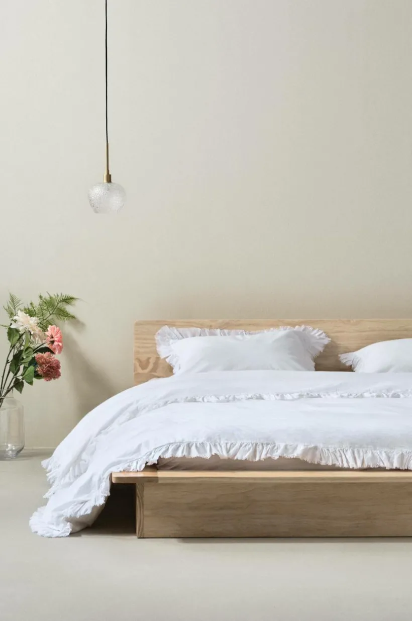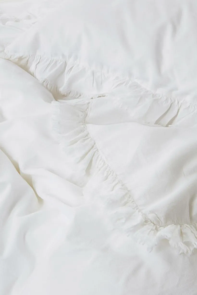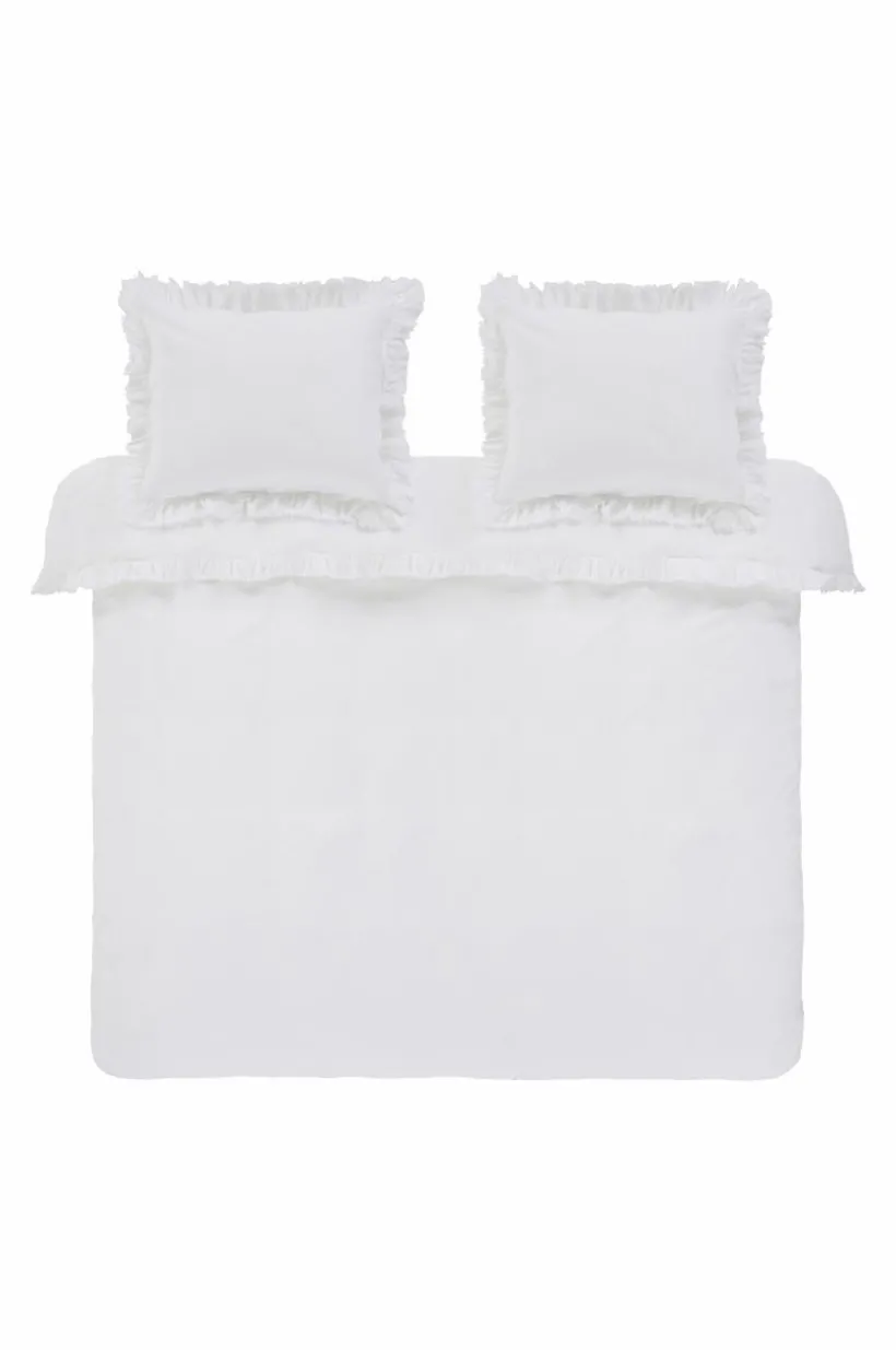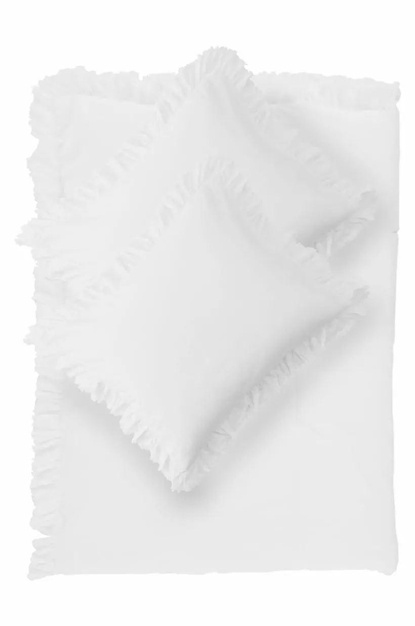 Påslakanset i tre delar, ett extra brett påslakan och två örngott av tvättad bomull med mjuk känsla. Bomull är behagligt att bädda med och upplevs svalt och skönt mot huden. JINN har en lätt fransig volangkant runt om. Tryckknappar för tillslutning i öppningen på påslakanet. Trådtäthet på 144 tc. (Trådtätheten talar om antalet trådar, thread counts, per kvadrattum i ett tyg. Ju högre trådtäthet desto högre kvalité.)