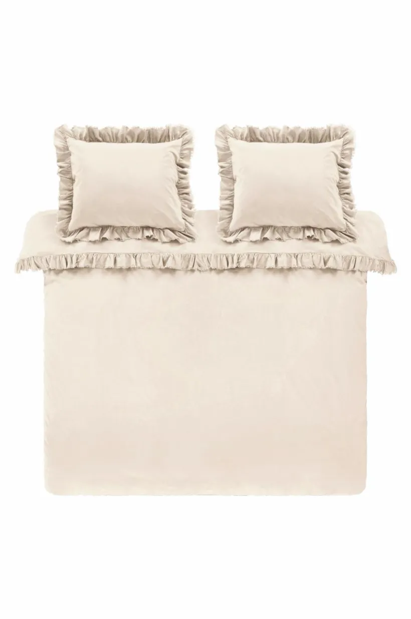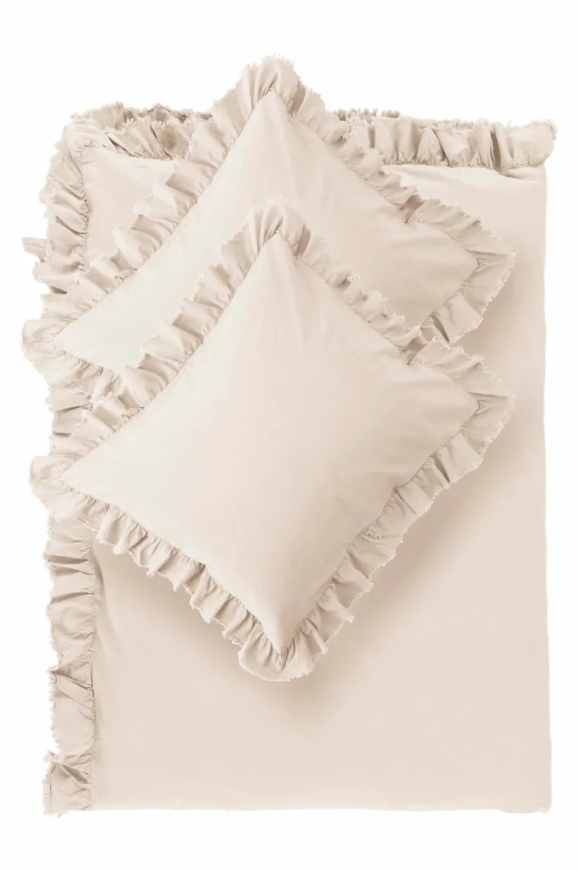 Påslakanset i tre delar, ett extra brett påslakan och två örngott av tvättad bomull med mjuk känsla. Bomull är behagligt att bädda med och upplevs svalt och skönt mot huden. JINN har en lätt fransig volangkant runt om. Tryckknappar för tillslutning i öppningen på påslakanet. Trådtäthet på 144 tc. (Trådtätheten talar om antalet trådar, thread counts, per kvadrattum i ett tyg. Ju högre trådtäthet desto högre kvalité.)