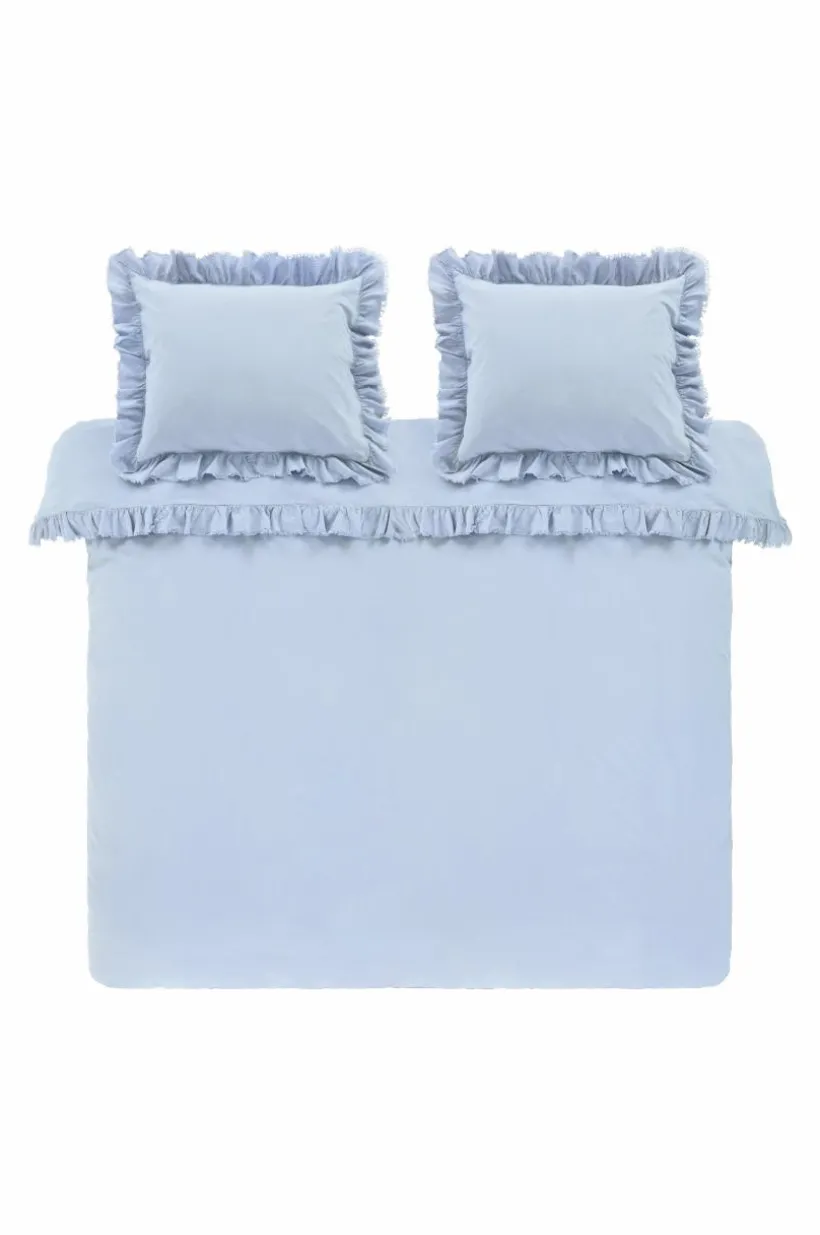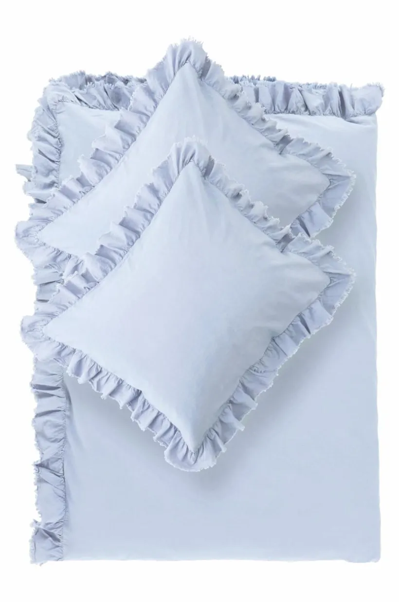 Påslakanset i tre delar, ett extra brett påslakan och två örngott av tvättad bomull med mjuk känsla. Bomull är behagligt att bädda med och upplevs svalt och skönt mot huden. JINN har en lätt fransig volangkant runt om. Tryckknappar för tillslutning i öppningen på påslakanet. Trådtäthet på 144 tc. (Trådtätheten talar om antalet trådar, thread counts, per kvadrattum i ett tyg. Ju högre trådtäthet desto högre kvalité.)