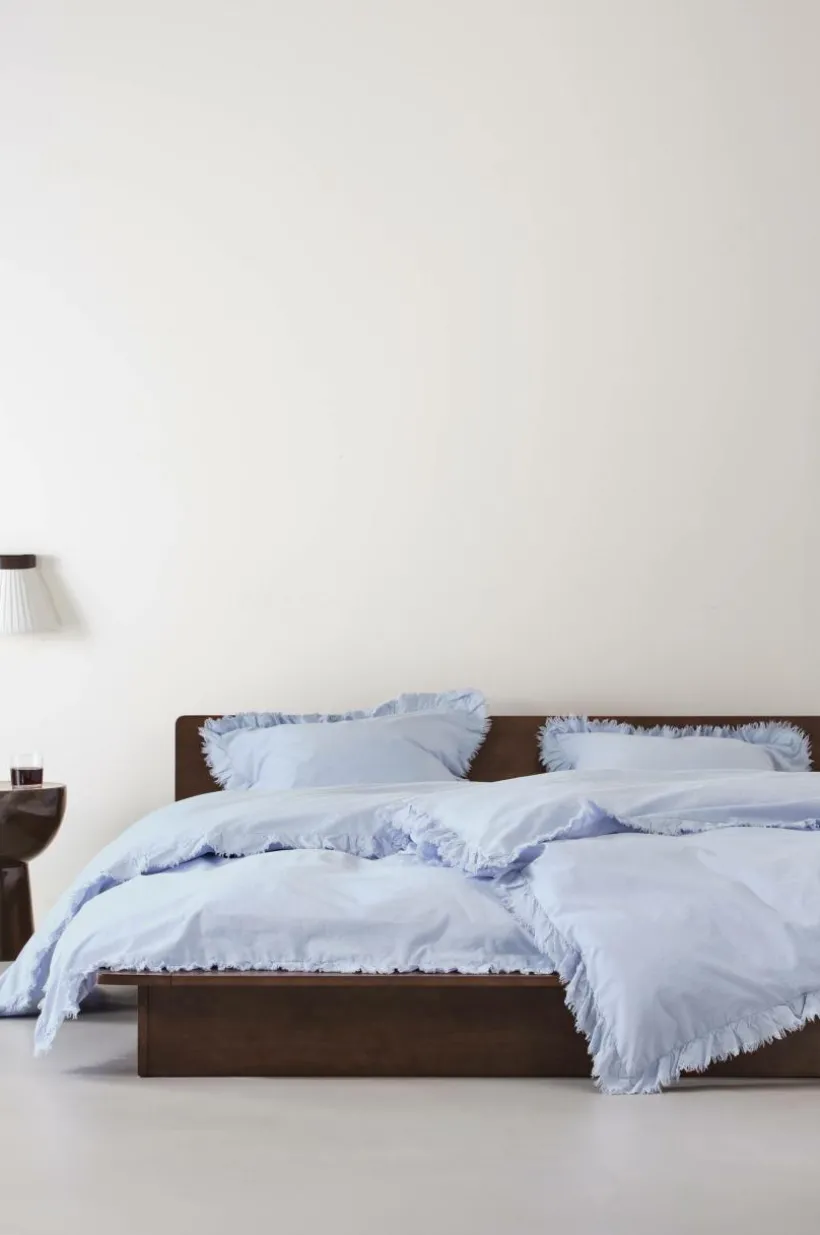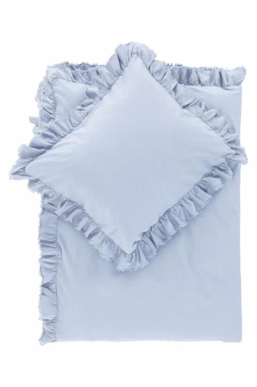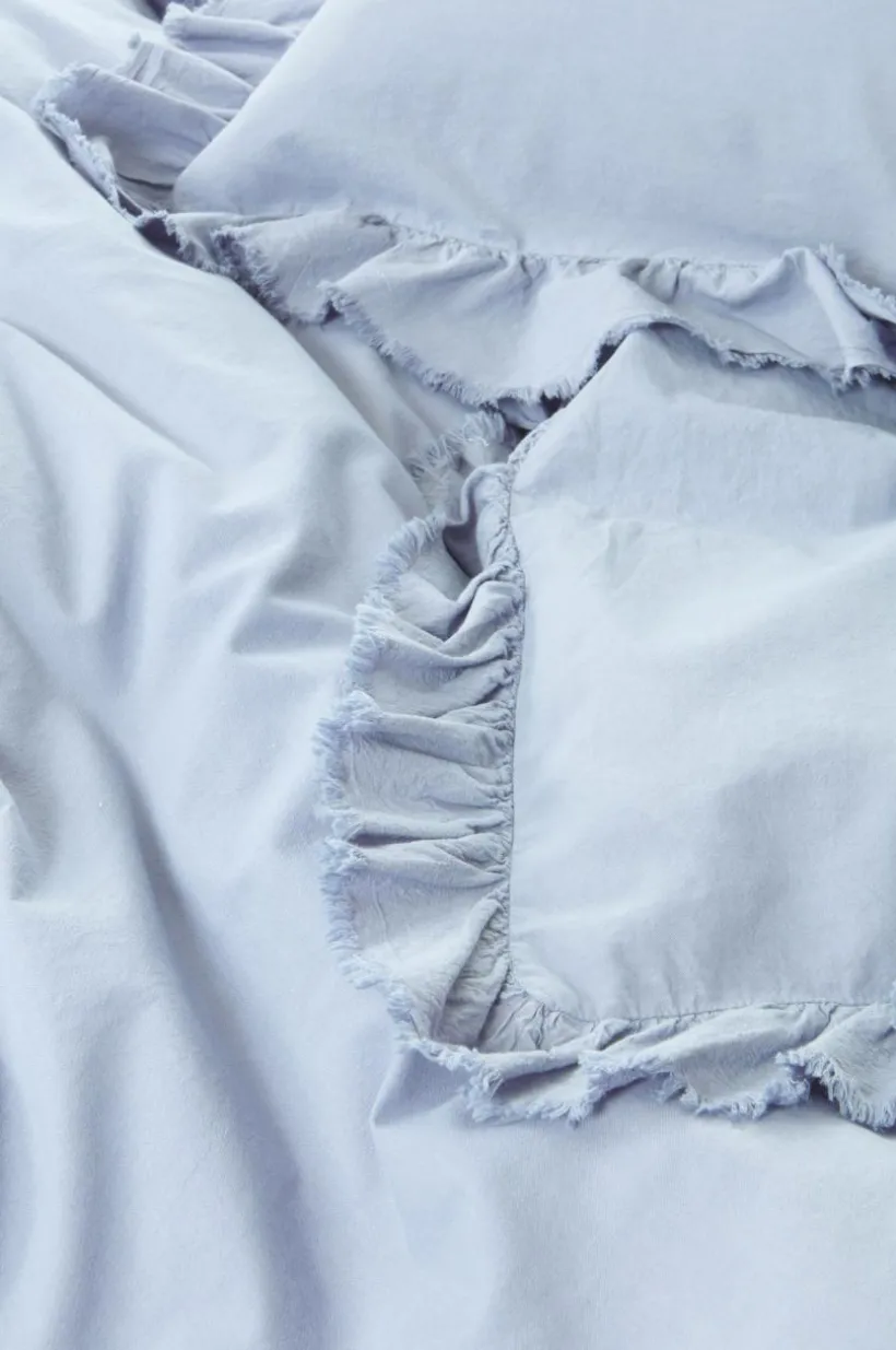 Påslakanset i två delar, ett påslakan och ett örngott av tvättad bomull med mjuk känsla. Bomull är behagligt att bädda med och upplevs svalt och skönt mot huden. JINN har en lätt fransig volangkant runt om. Tryckknappar för tillslutning i öppningen på påslakanet. Trådtäthet på 144 tc. (Trådtätheten talar om antalet trådar, thread counts, per kvadrattum i ett tyg. Ju högre trådtäthet desto högre kvalité.)