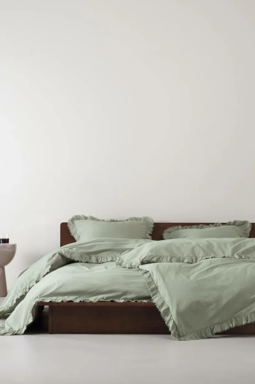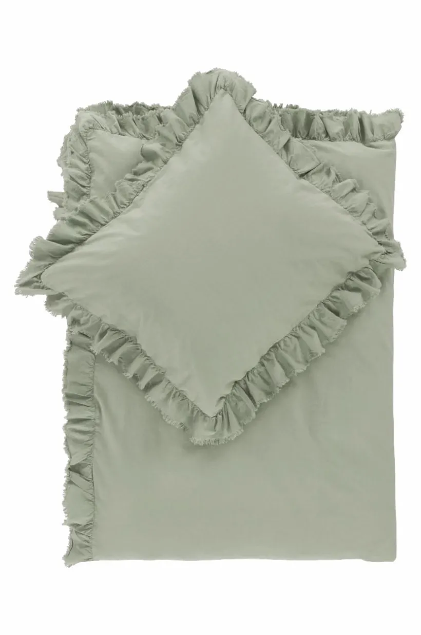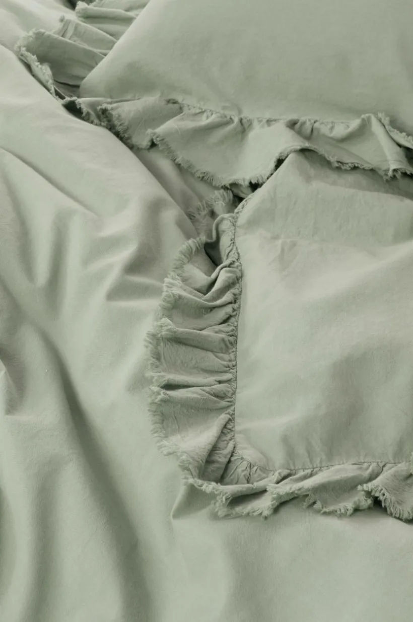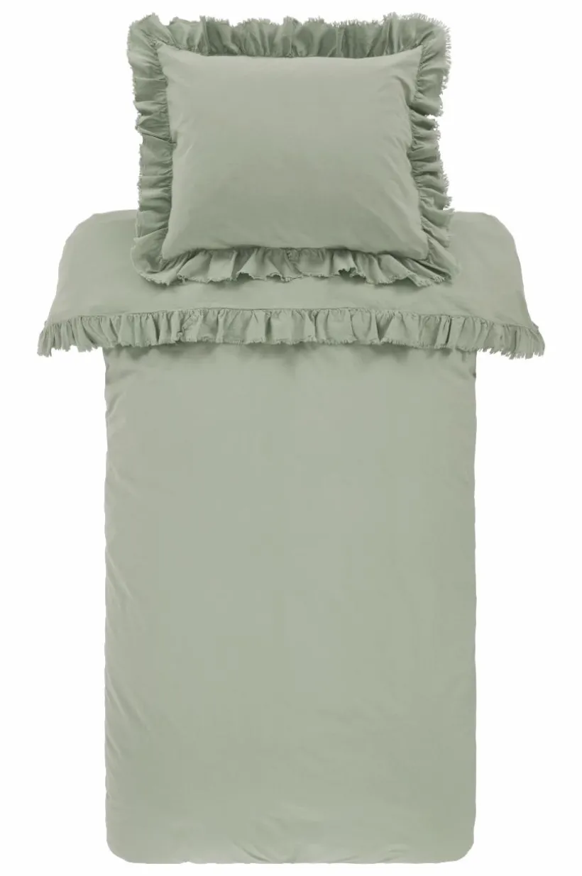 Påslakanset i två delar, ett påslakan och ett örngott av tvättad bomull med mjuk känsla. Bomull är behagligt att bädda med och upplevs svalt och skönt mot huden. JINN har en lätt fransig volangkant runt om. Tryckknappar för tillslutning i öppningen på påslakanet. Trådtäthet på 144 tc. (Trådtätheten talar om antalet trådar, thread counts, per kvadrattum i ett tyg. Ju högre trådtäthet desto högre kvalité.)