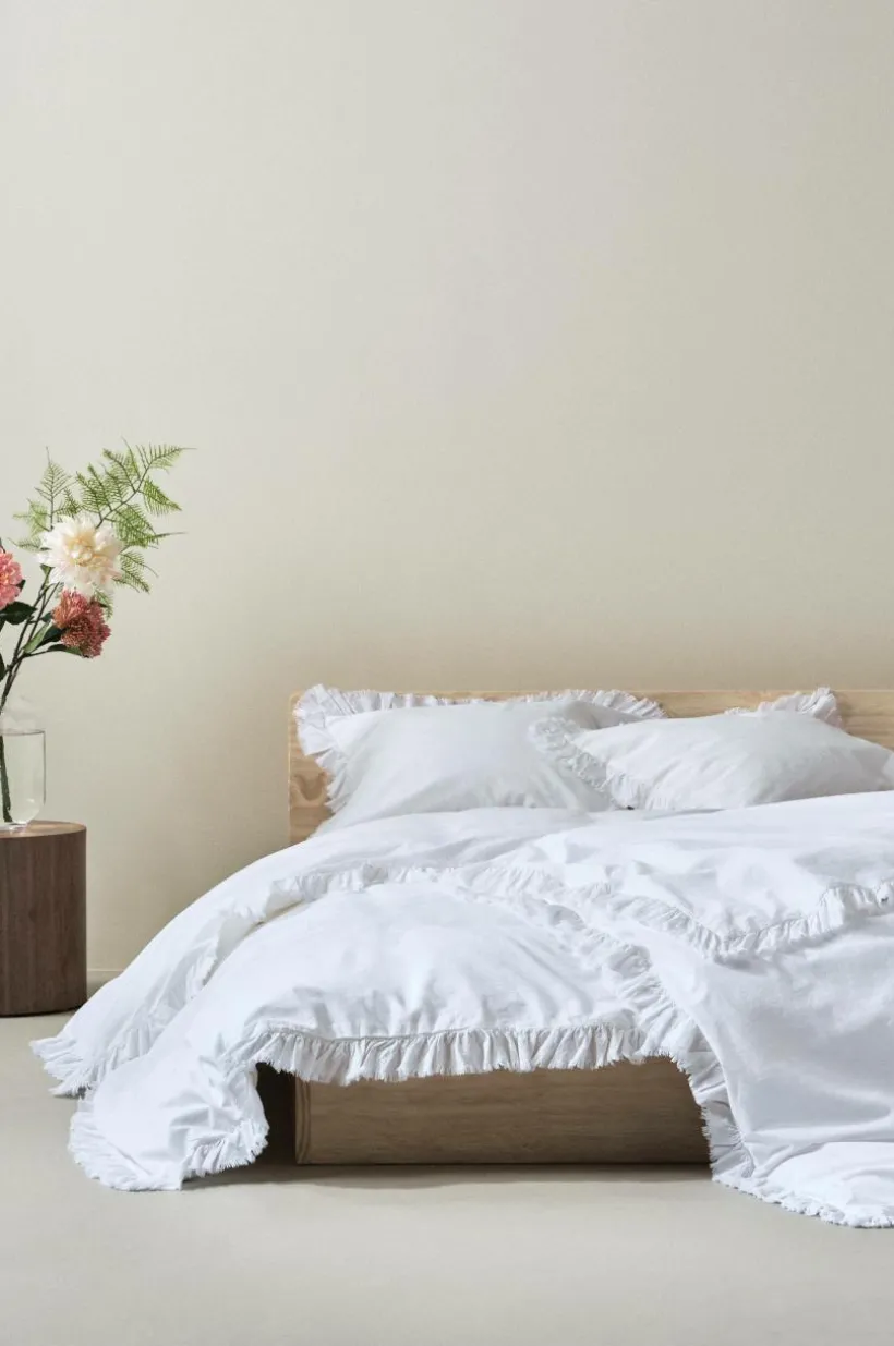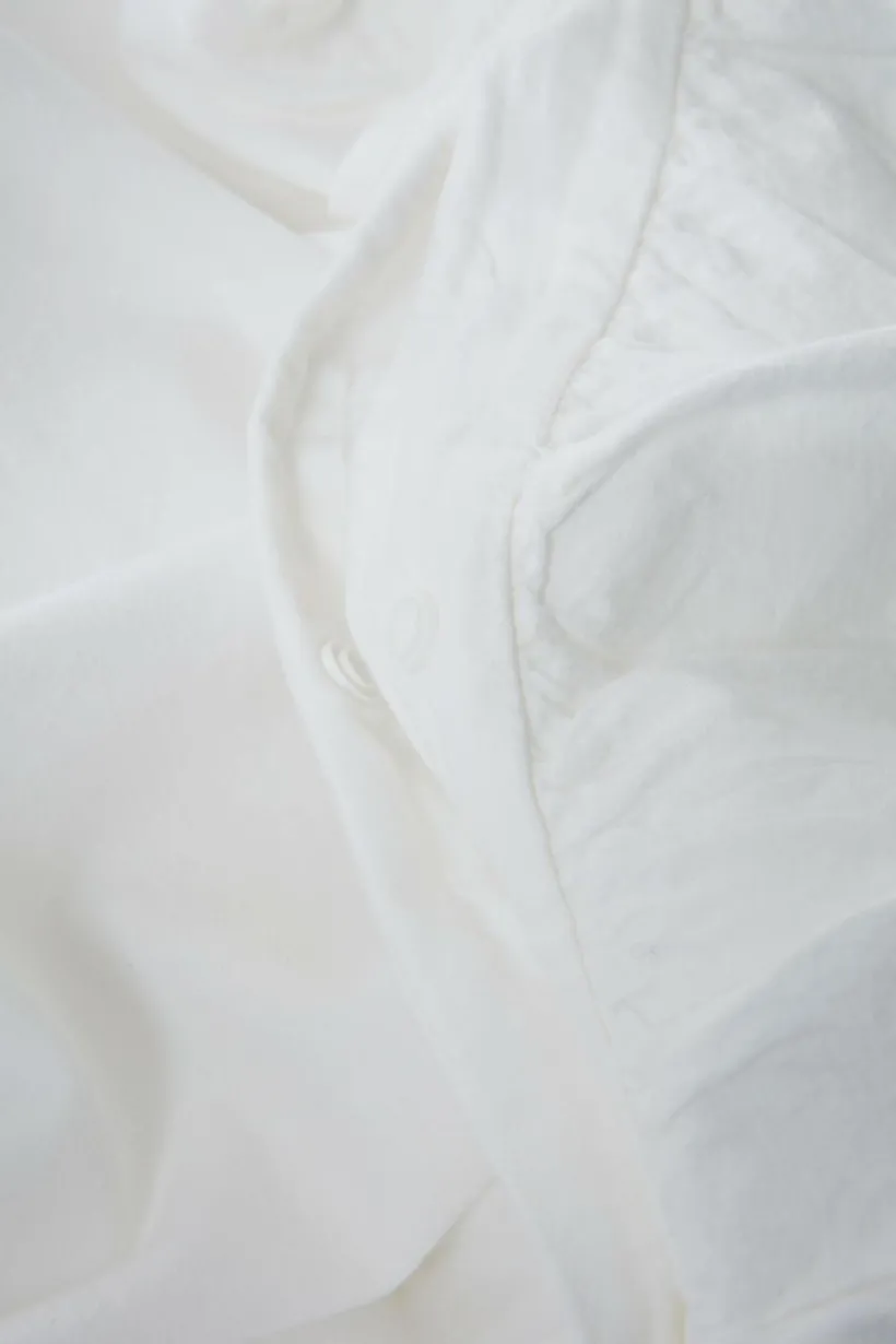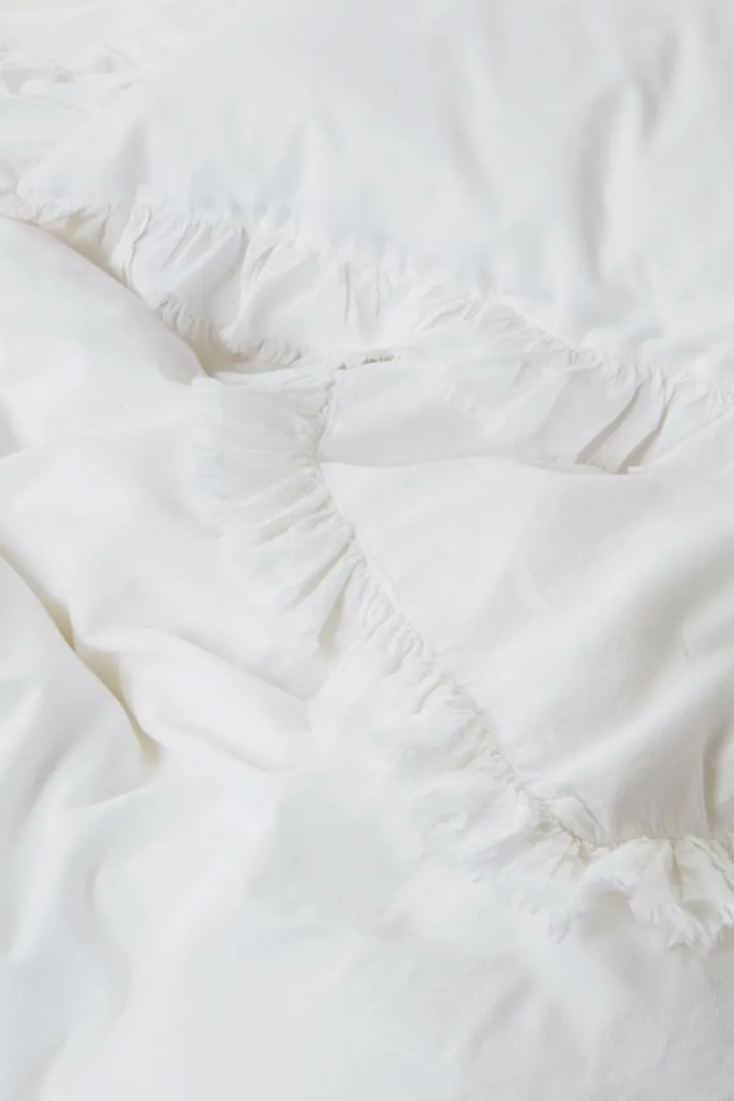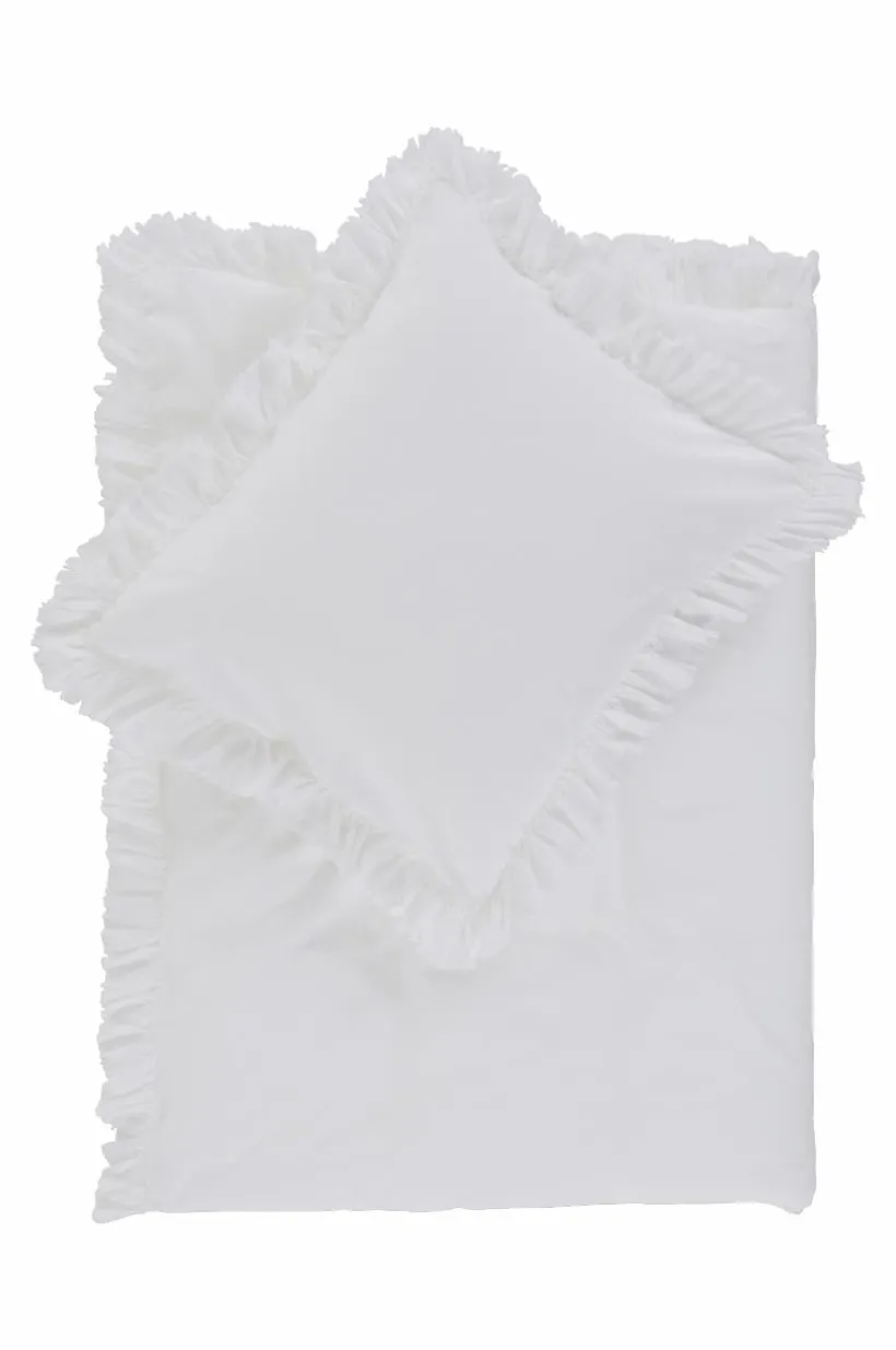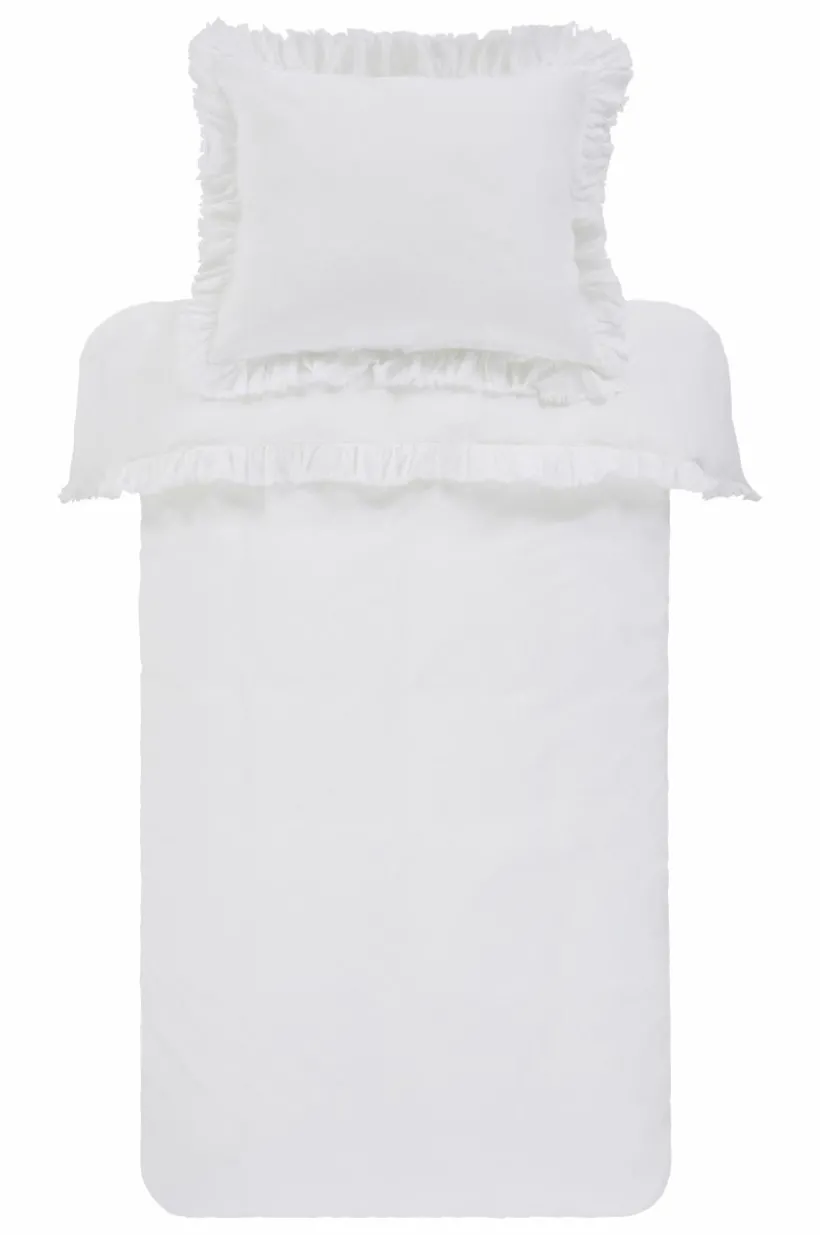 Påslakanset i två delar, ett påslakan och ett örngott av tvättad bomull med mjuk känsla. Bomull är behagligt att bädda med och upplevs svalt och skönt mot huden. JINN har en lätt fransig volangkant runt om. Tryckknappar för tillslutning i öppningen på påslakanet. Trådtäthet på 144 tc. (Trådtätheten talar om antalet trådar, thread counts, per kvadrattum i ett tyg. Ju högre trådtäthet desto högre kvalité.)