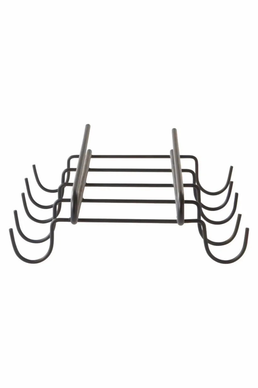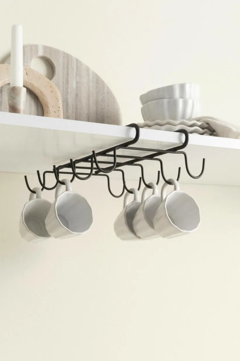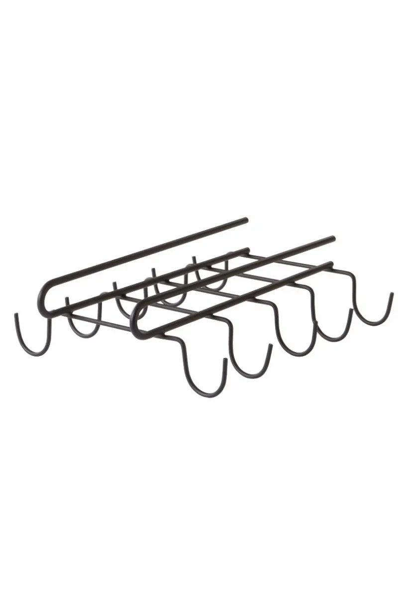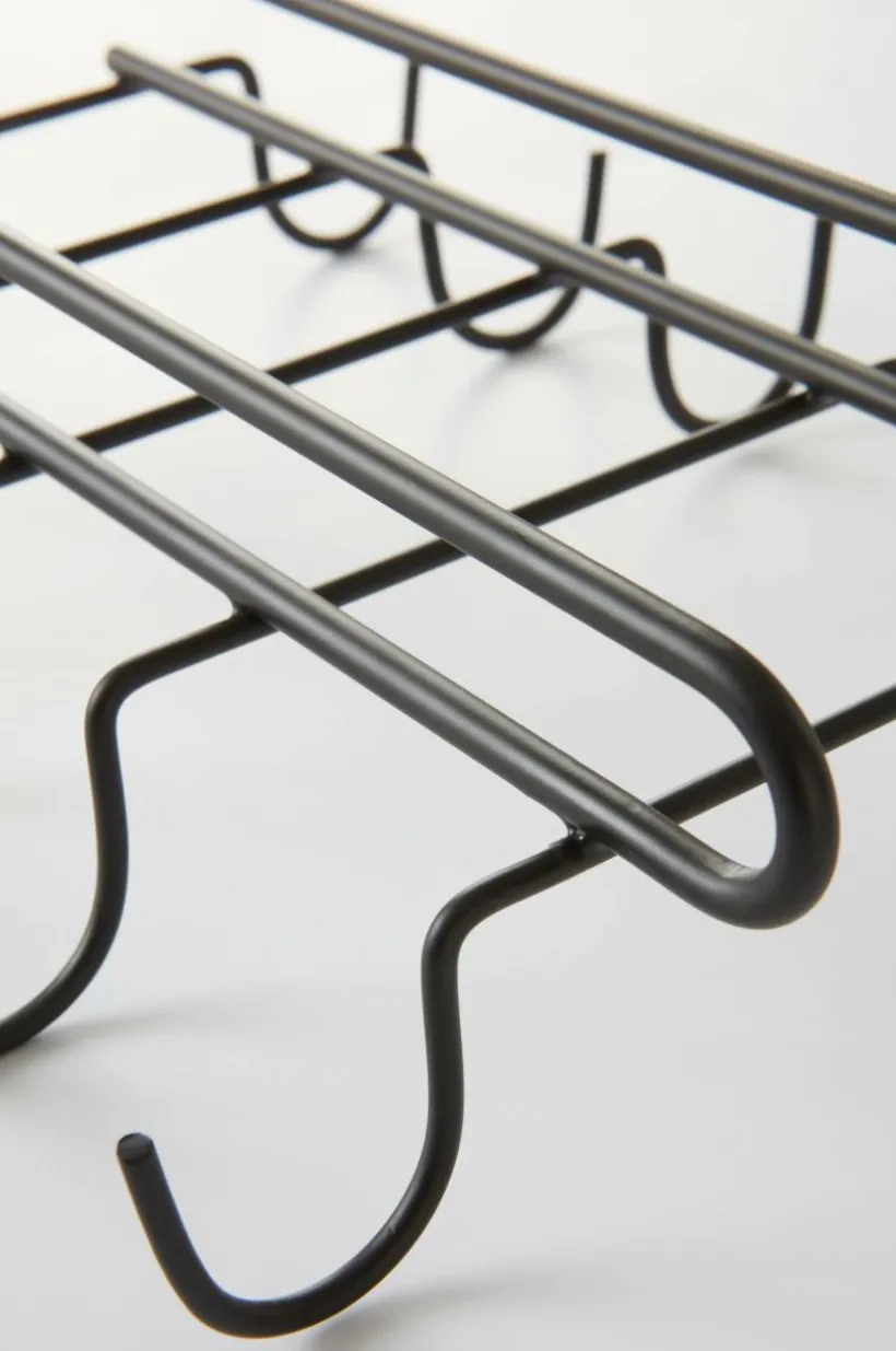 Mugghållare av järn, som du enkelt sätter på hyllkanten. Hållaren har fem krokar på varje sida, så du kan hänga upp tio muggar i örat. Den passar perfekt på öppna hyllor och du har muggar nära till hands. Hållaren är målad i mattsvart färg.