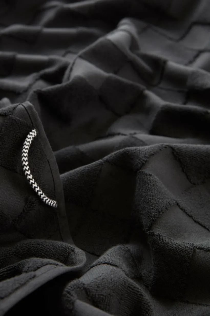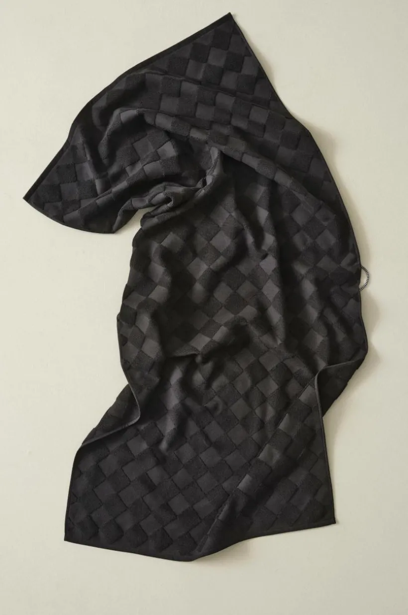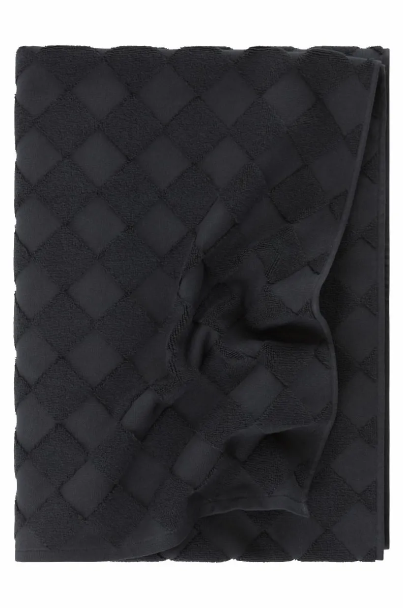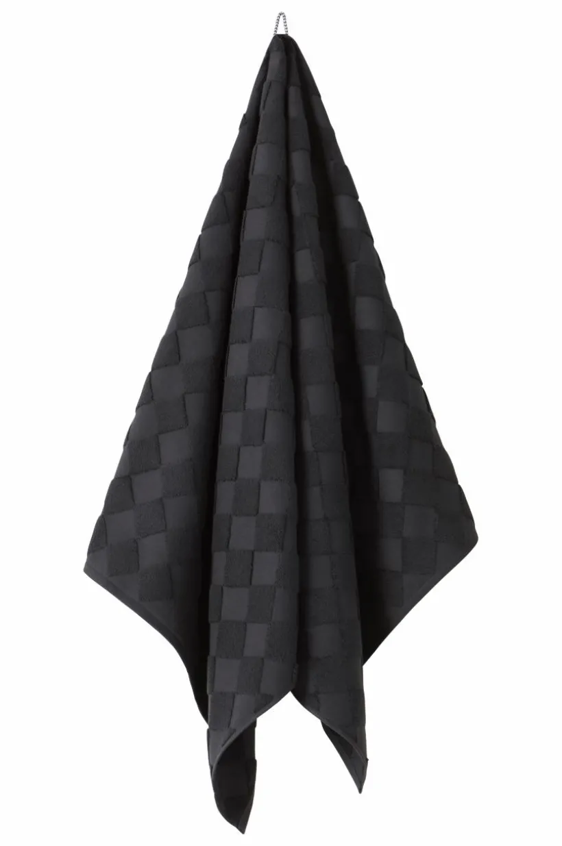 1-pack badhandduk i lyxig och snygg, enfärgad bomullsfrotté som är jacquardvävd. Det vävda rutmönstret är diagonalställt med slätvävda rutor och rutor vävda med öglor. Mönstret är motsatt på andra sidan. Den är dessutom vävd med dubbelgarn vilket ger exklusiv, kraftig känsla. Den lyxiga känslan förstärks av den snygga hängaren av svartvitt bomullsrep på långsidan. Frottén har bra uppsugningsförmåga och blir härligare ju mer den tvättas. Tillverkad i Portugal. Gramvikt 500 g/m².