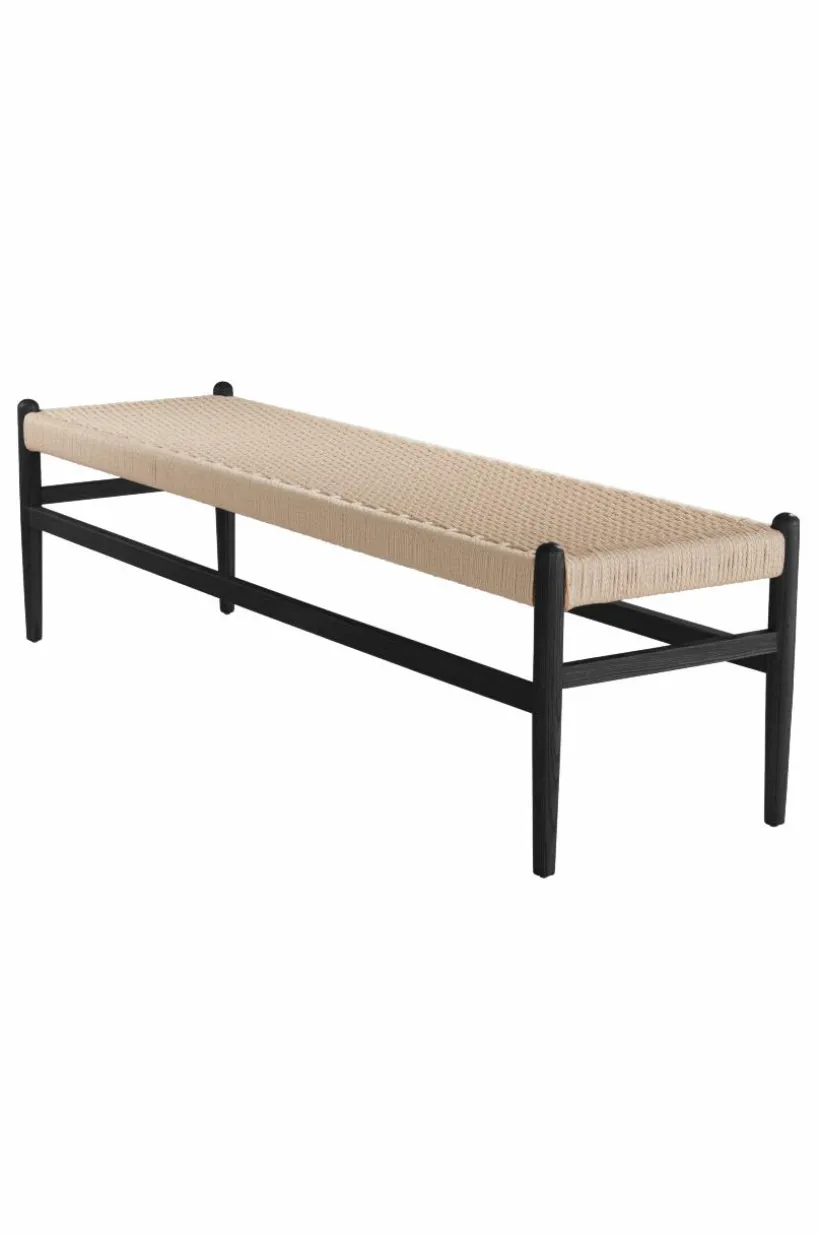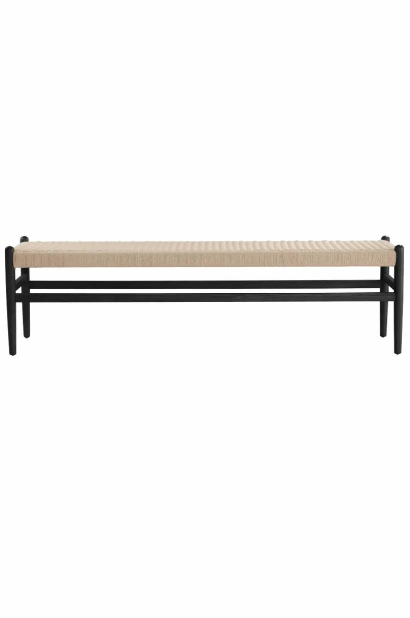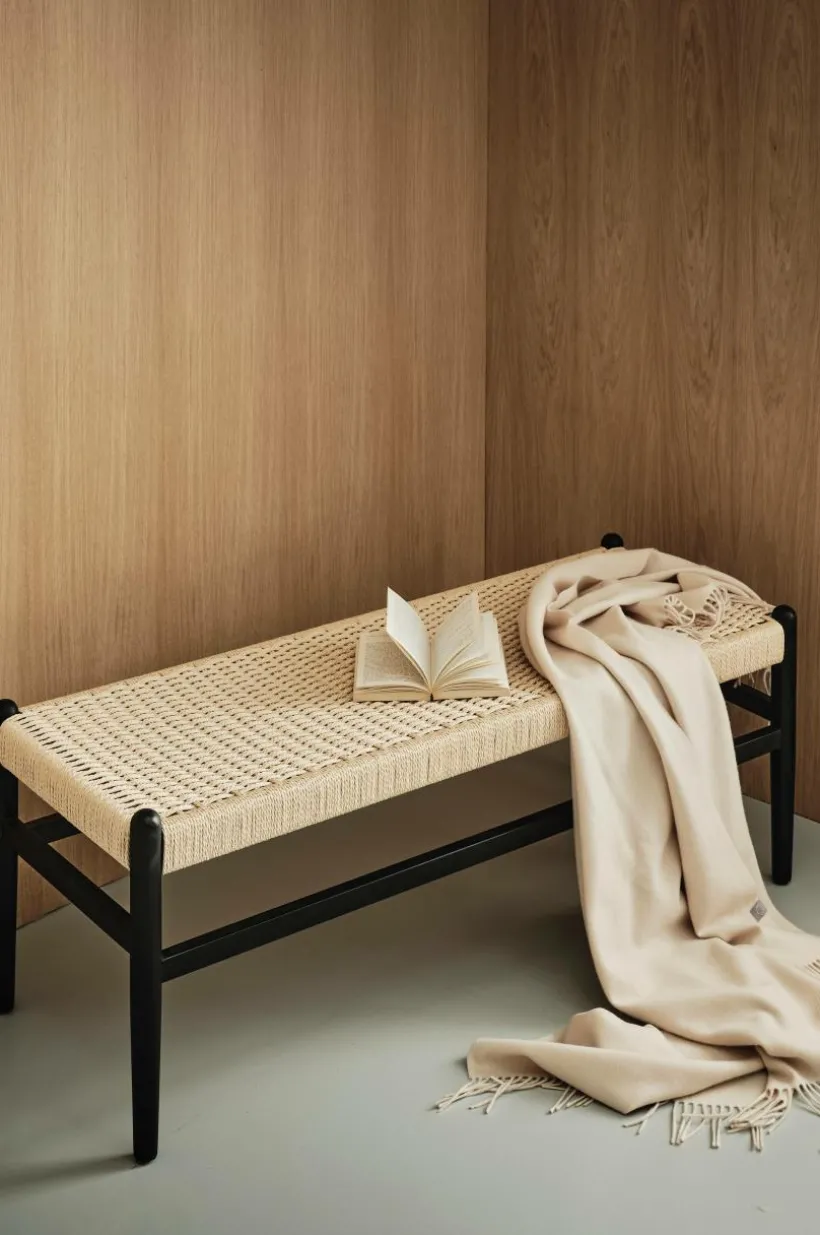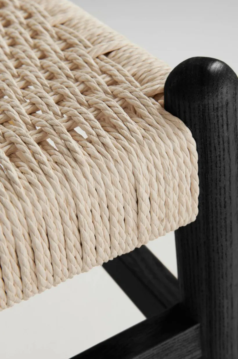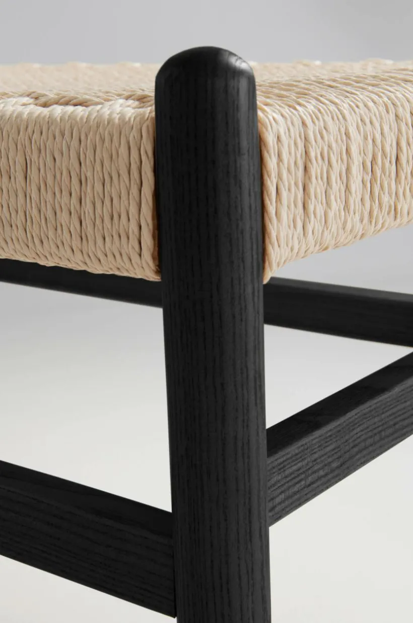 Bänk i massiv björk med sits av papperssnören som flätats. Kontrasten mellan papperssnöre och trä blir effektfull och sitsen ger bra sittkomfort.