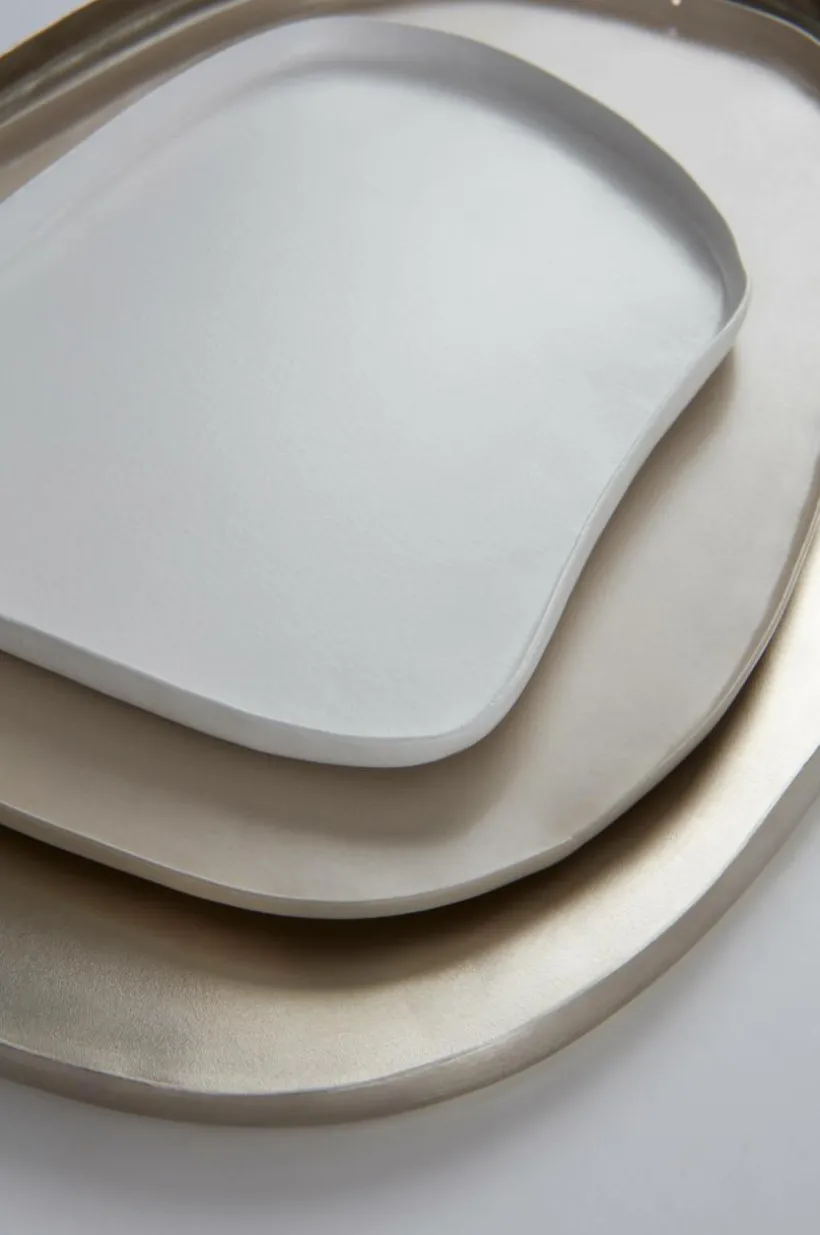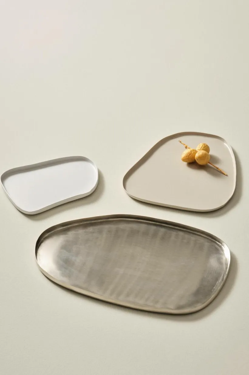 3-pack serveringsfat av järn i oregelbundna, organiska former. Faten är vackra för uppläggning och de har olika färg och form som skapar en fin helhet tillsammans. Den färgade faten har pulverlackerad, matt yta, det silverfärgade fatet är blankare.