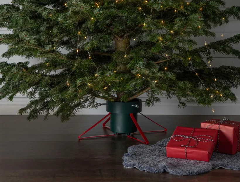 Julgranfot med en grön plastbehållare och röda metall ben. För granar med en basdiameter mellan 5,5-14 cm och en höjd upp till 250 cm. Vattenbehållaren rymmer ca 2,8 L. Höjd 21 cm och diameter 57 cm.