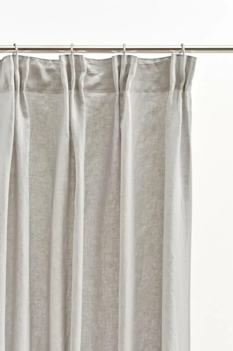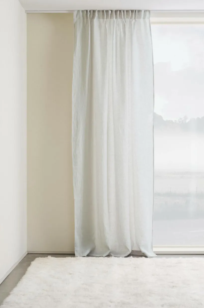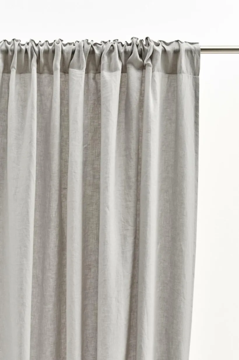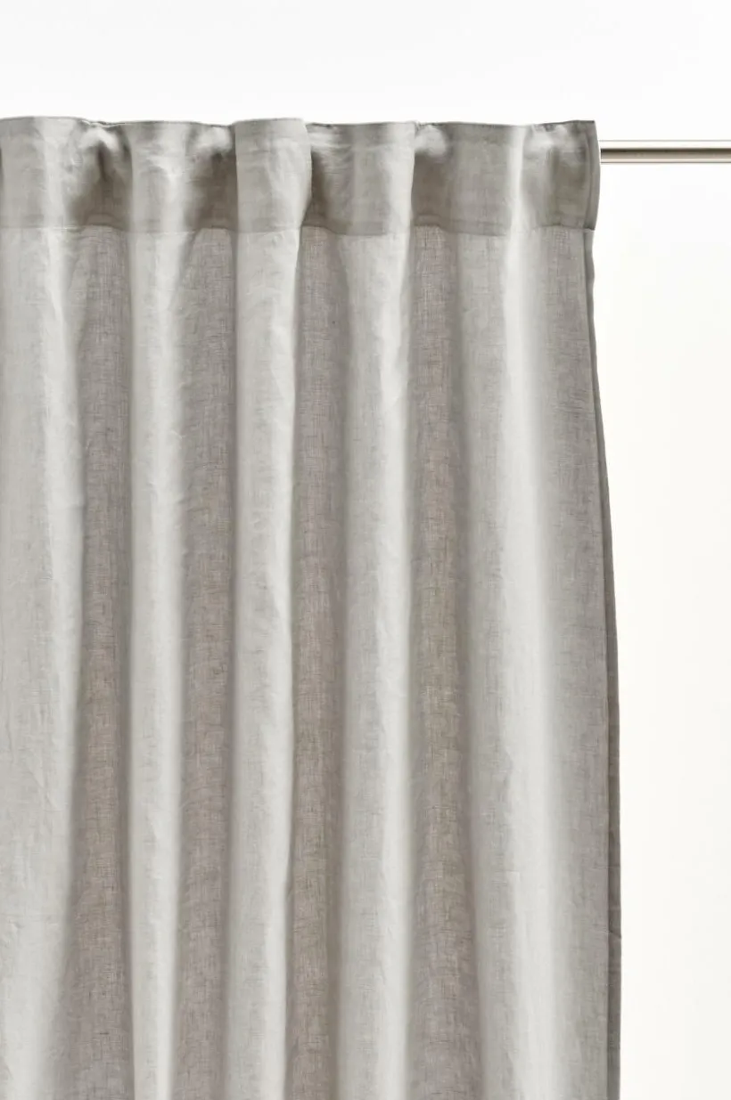En gardinlängd i mjuk, smidig linkvalité som tillsammans med linets fina egenskaper samtidigt är vattenavvisande. Linet är certifierat med European Flax. En akrylatbehandling som varken syns eller känns ger tyget den vattenavvisande egenskapen vilket ger ett bredare användningsområde, ute som inne. Längderna har påsytt multifunktionsband och kan hängas upp med fingerkrokar, kanal eller dold hälla.
