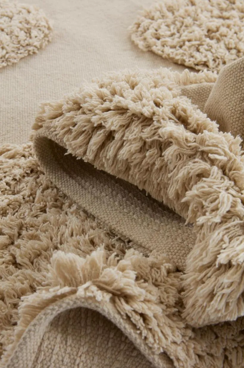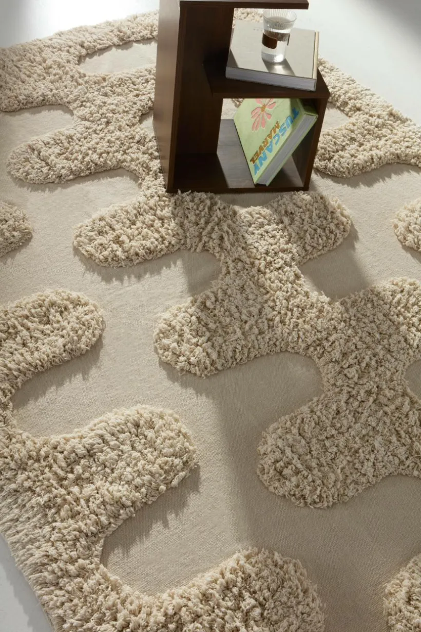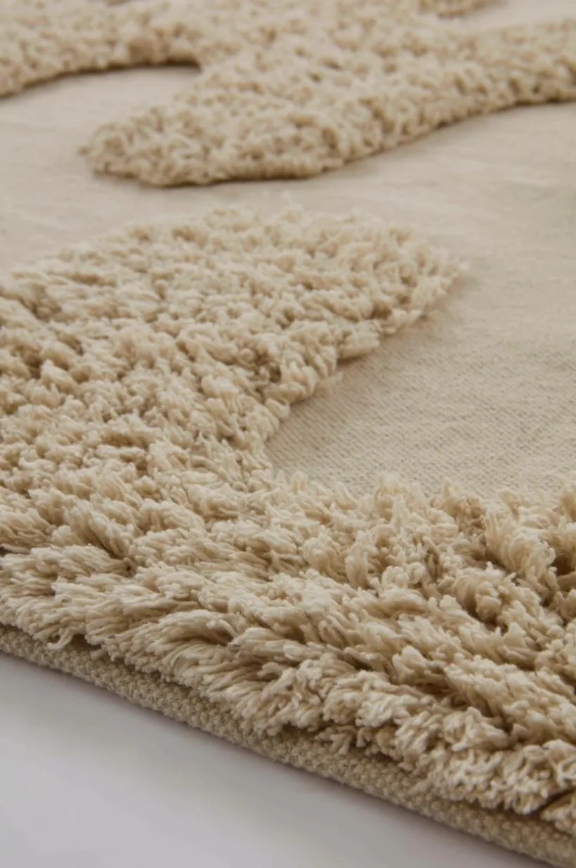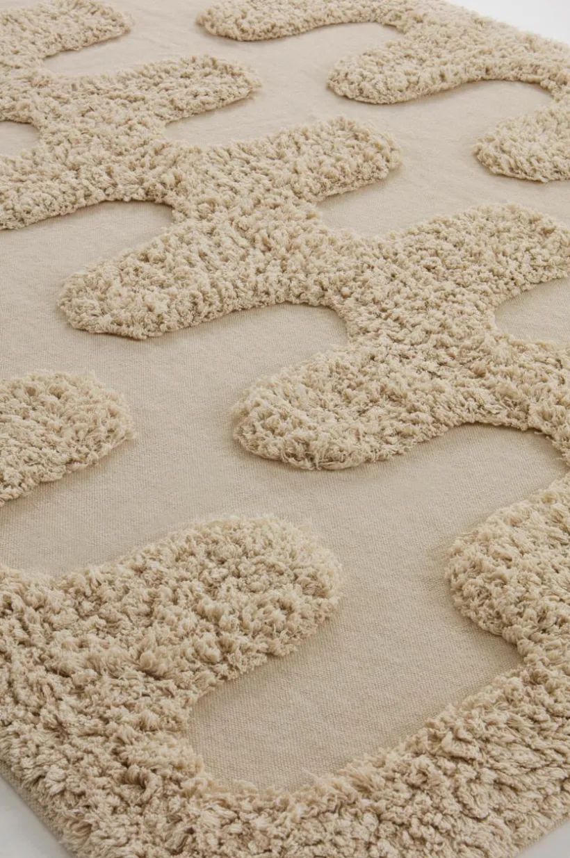 KALEI-mattan förvandlar vardagsrummet eller sovrummet till en mysig vrå med sitt bomullstuftade hantverk. De vågiga mönstren, som skapas genom variationer i lugghöjden, inbjuder fötterna att njuta av komfort och tillför värme till ditt vardagsrum.