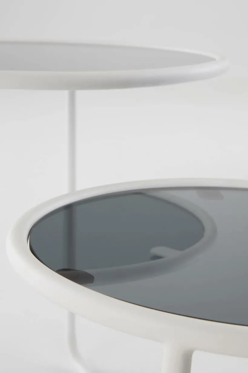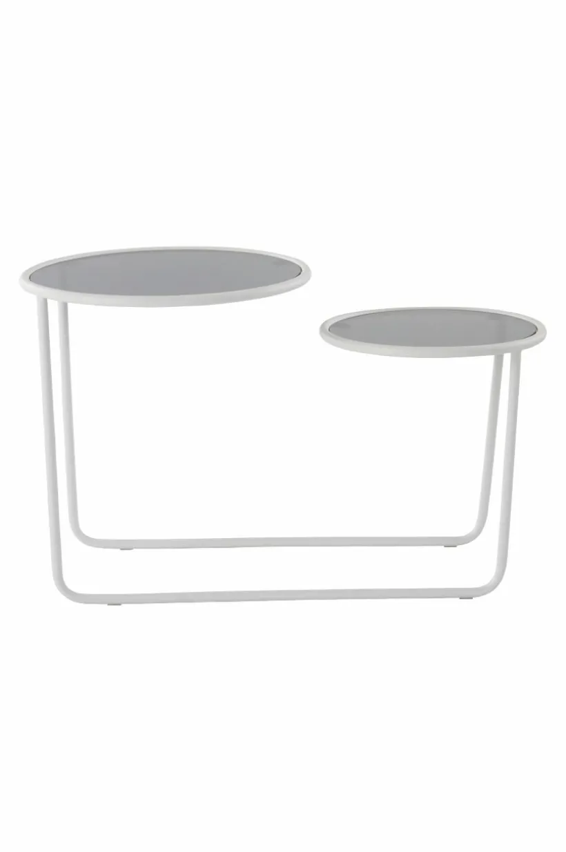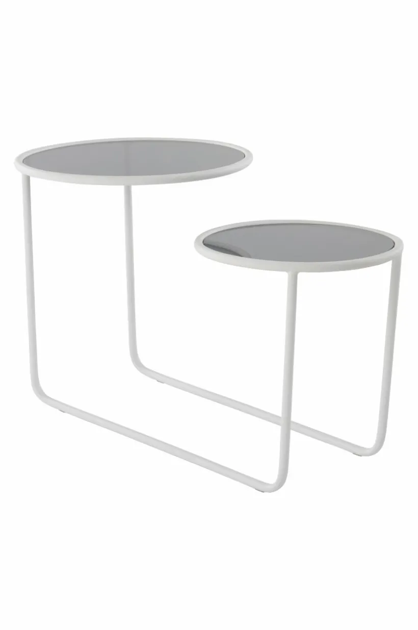 KALLO är ett dubbelt sidobord i spännande design. De runda bordsskivorna är av rökfärgat glas och stommen är av järnrör som pulverlackerats. Bordet kommer alltid att vara på samma plats i förhållande till varandra och sidobordet kan fungera bra som soffbord vid en mindre soffa.