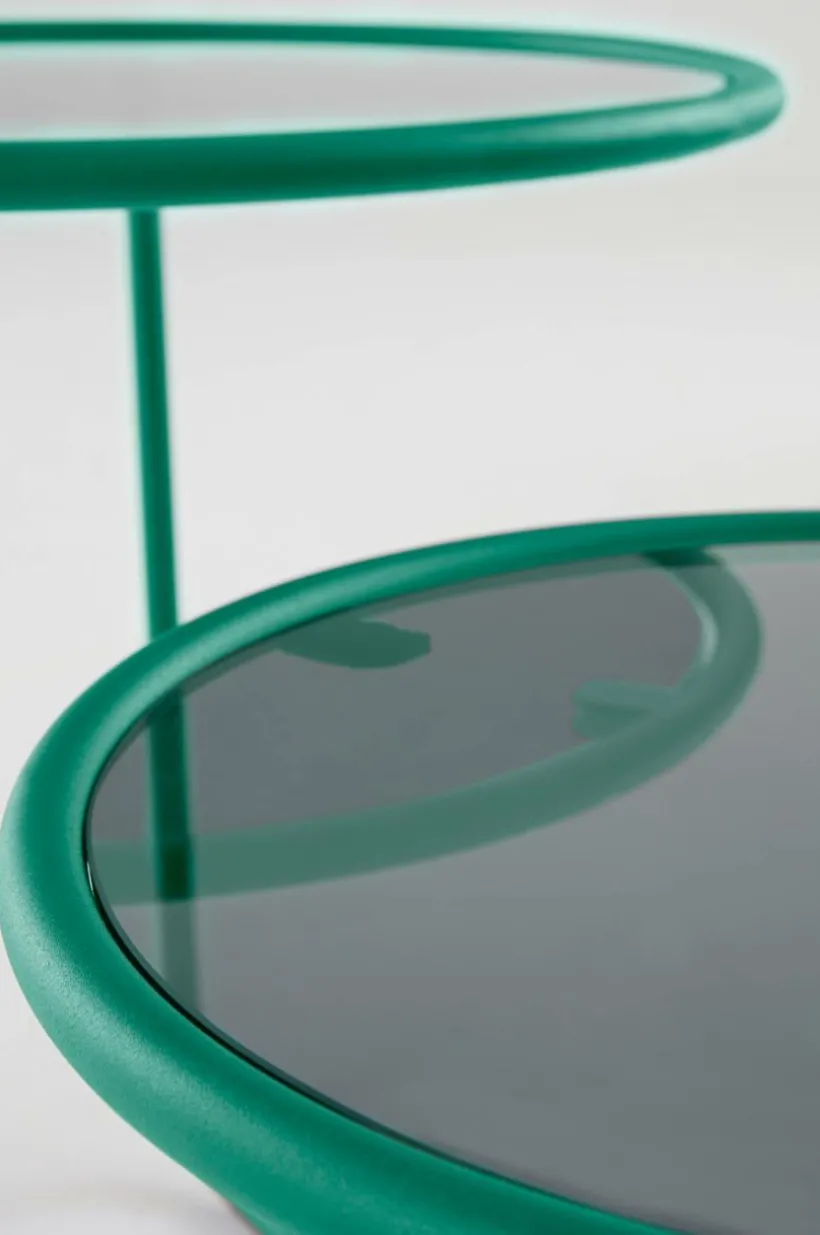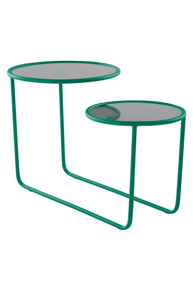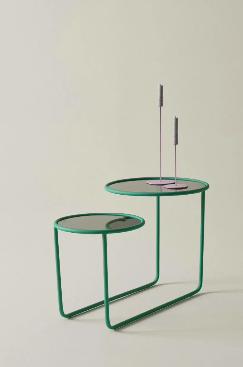 KALLO är ett dubbelt sidobord i spännande design. De runda bordsskivorna är av rökfärgat glas och stommen är av järnrör som pulverlackerats. Bordet kommer alltid att vara på samma plats i förhållande till varandra och sidobordet kan fungera bra som soffbord vid en mindre soffa.