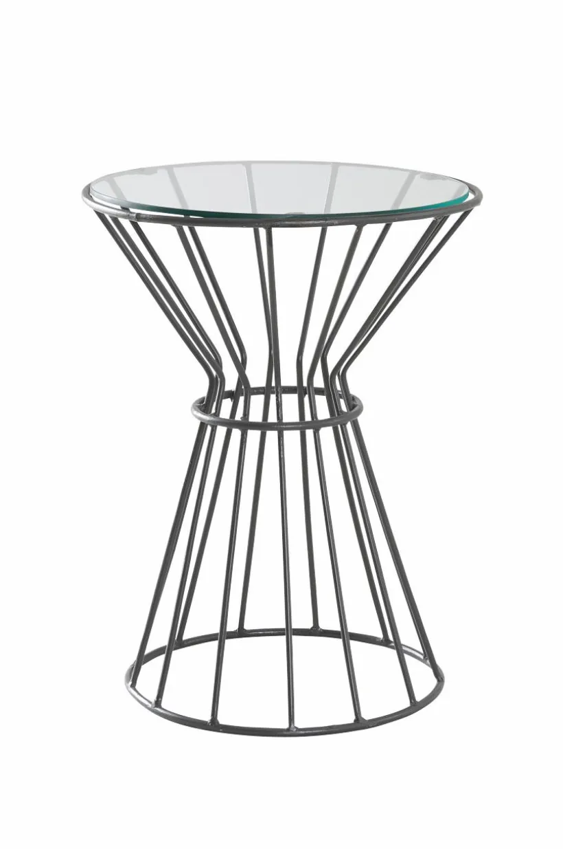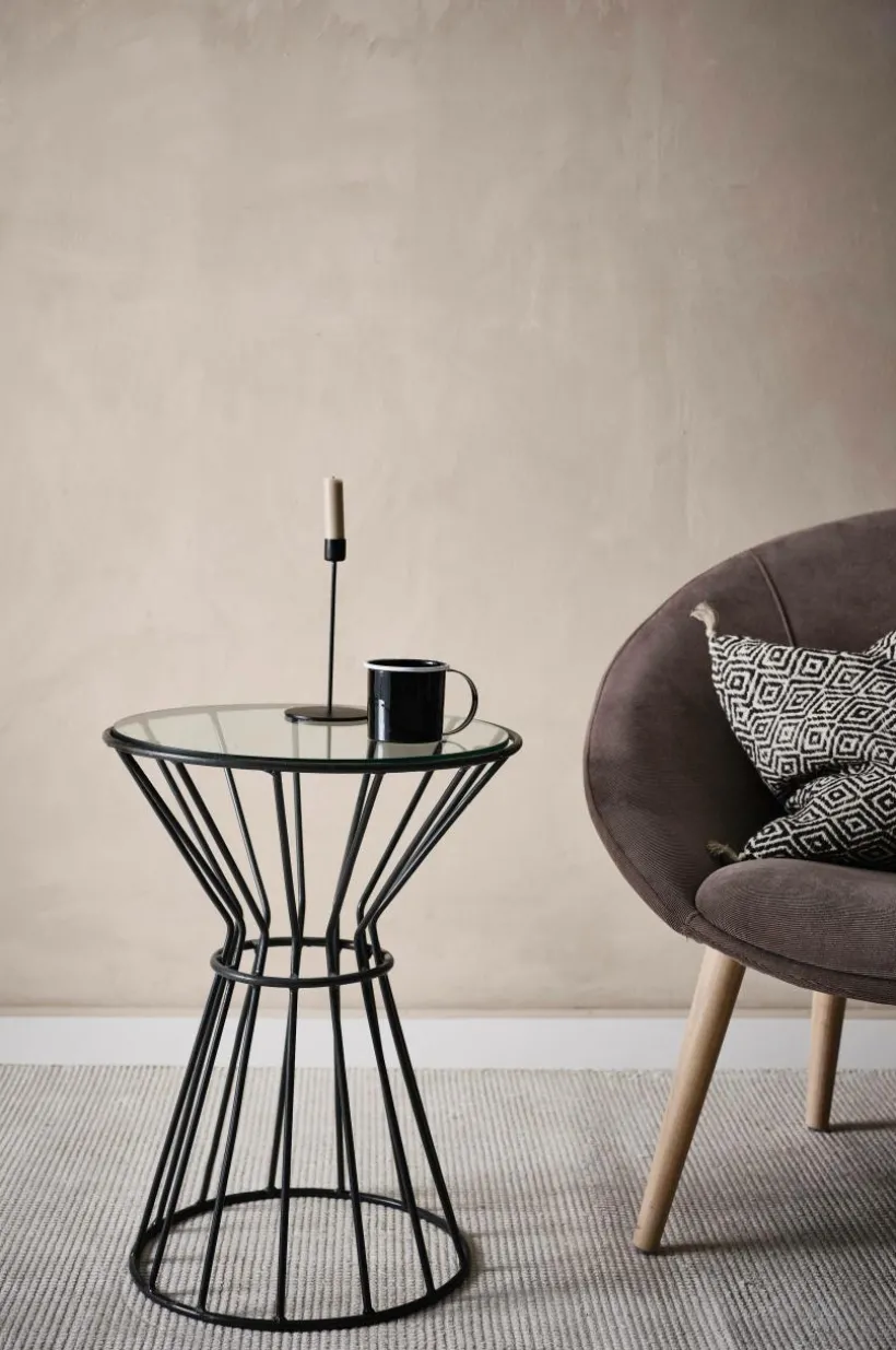 Runt soffbord med stomme i pulverlackad metall och bordsskiva av glas. Ett timglasformat soffbord som ger en rustik men samtidigt modern känsla till inredningen.