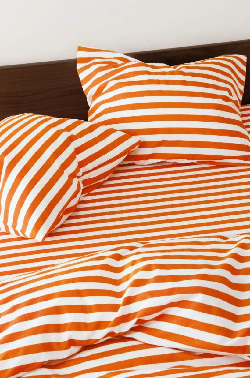 2-pack örngott av randig bomull. Den tvärgående randningen är tryckt i fräscha, somriga färger och på båda sidor av örngotten. Bomull är en mjuk och behaglig kvalité som känns sval mot huden. Trådtäthet på 144 tc. (Trådtätheten talar om antalet trådar, thread counts, per kvadrattum i ett tyg. Ju högre trådtäthet desto högre kvalité. Med undantag för linne som ofta vävs glesare för att få den rätta känslan.)