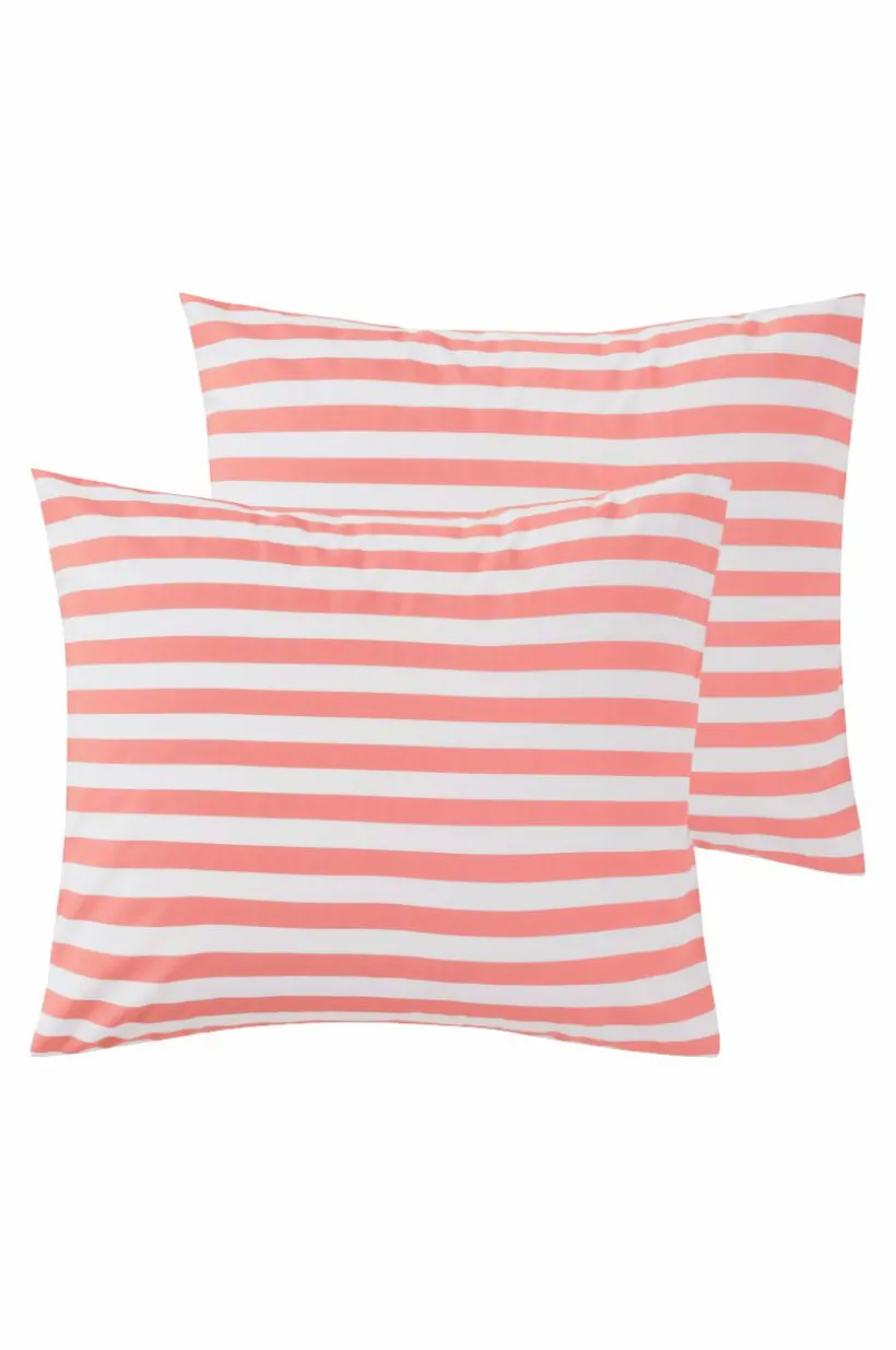 2-pack örngott av randig bomull. Den tvärgående randningen är tryckt i fräscha, somriga färger och på båda sidor av örngotten. Bomull är en mjuk och behaglig kvalité som känns sval mot huden. Trådtäthet på 144 tc. (Trådtätheten talar om antalet trådar, thread counts, per kvadrattum i ett tyg. Ju högre trådtäthet desto högre kvalité. Med undantag för linne som ofta vävs glesare för att få den rätta känslan.)