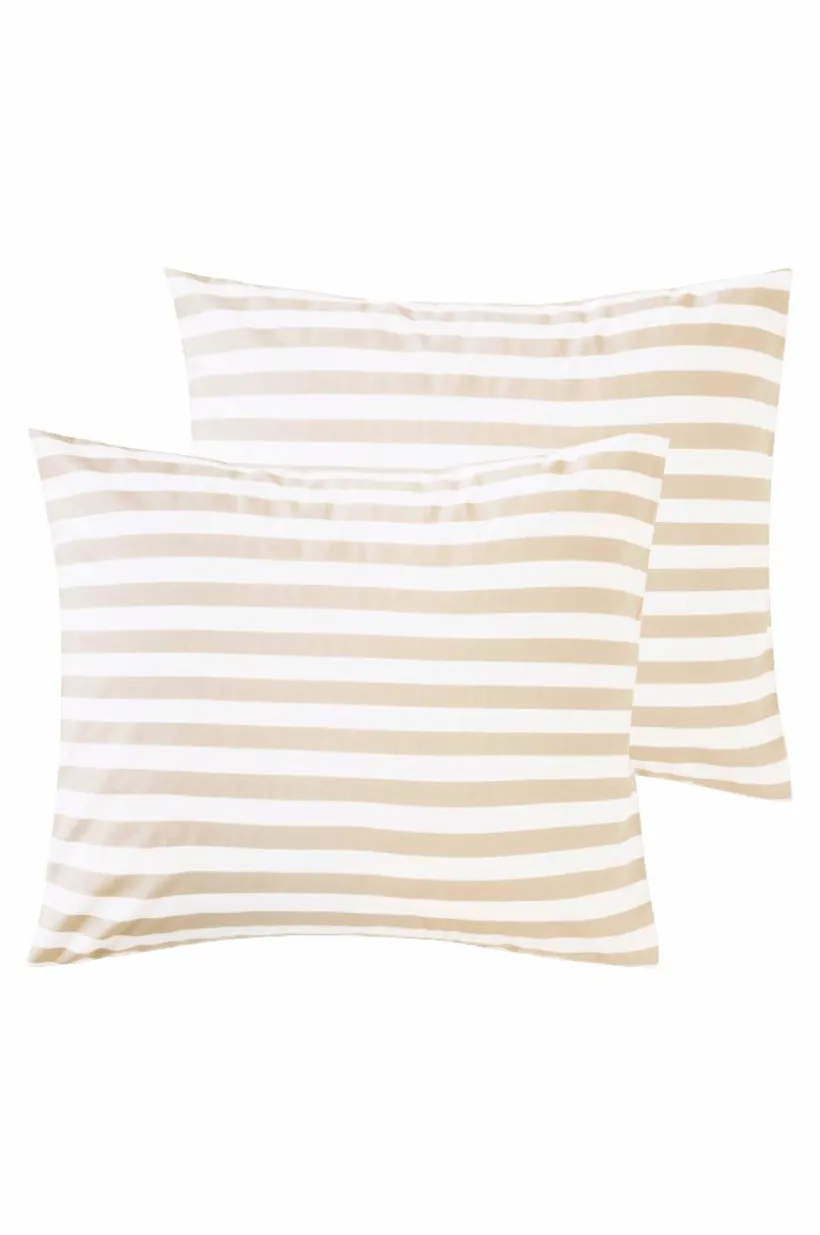 2-pack örngott av randig bomull. Den tvärgående randningen är tryckt i fräscha, somriga färger och på båda sidor av örngotten. Bomull är en mjuk och behaglig kvalité som känns sval mot huden. Trådtäthet på 144 tc. (Trådtätheten talar om antalet trådar, thread counts, per kvadrattum i ett tyg. Ju högre trådtäthet desto högre kvalité. Med undantag för linne som ofta vävs glesare för att få den rätta känslan.)