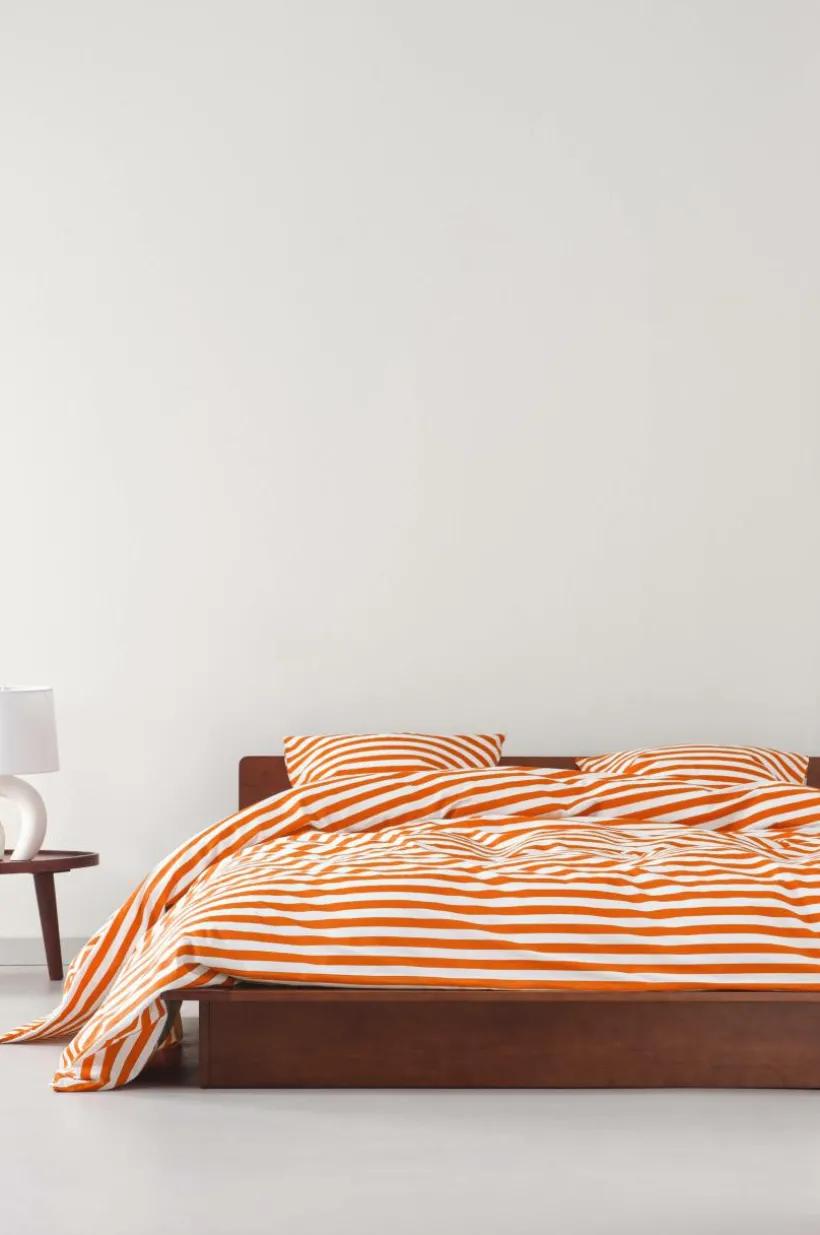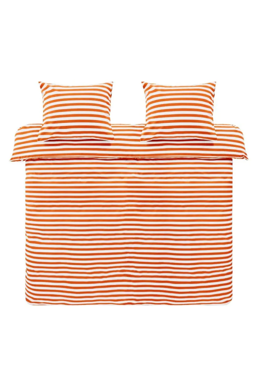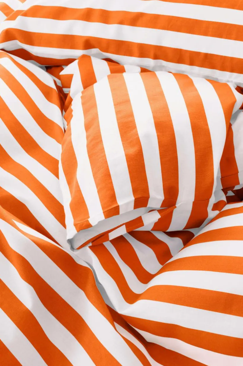 Randigt påslakanset i tre delar, ett extra brett påslakan och två örngott av bomull. Den tvärgående randningen är tryckt i fräscha, somriga färger och på båda sidor av örngott och påslakan. Bomull är en mjuk och behaglig kvalité som känns sval mot huden.