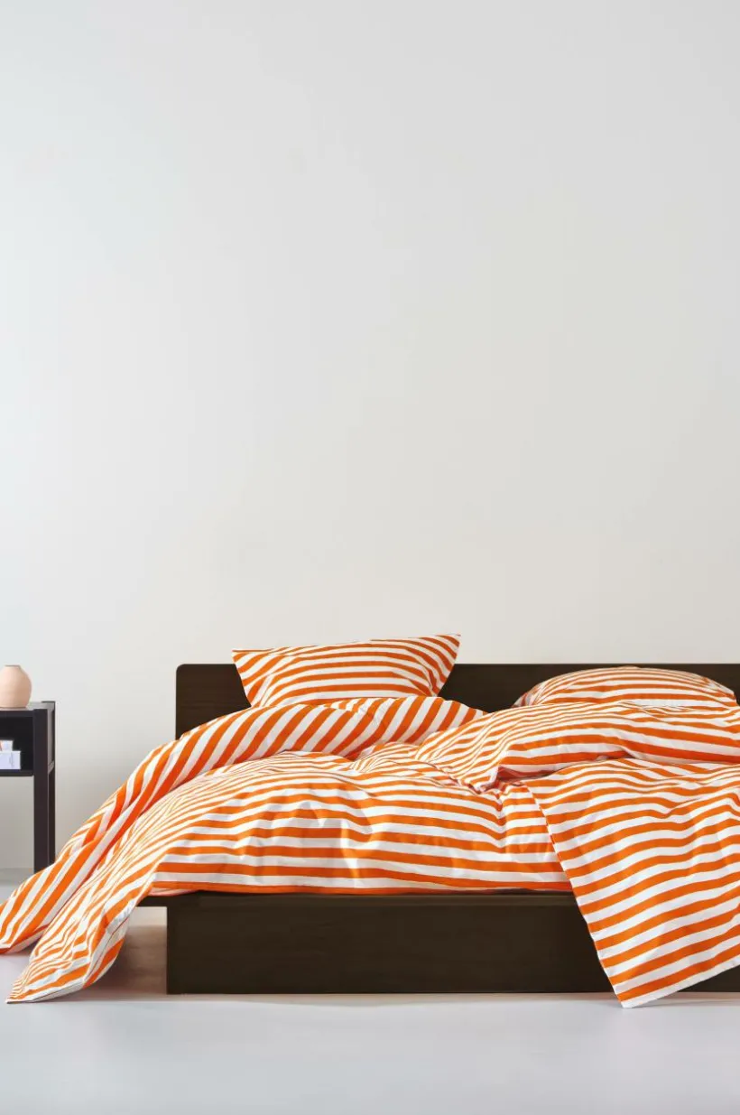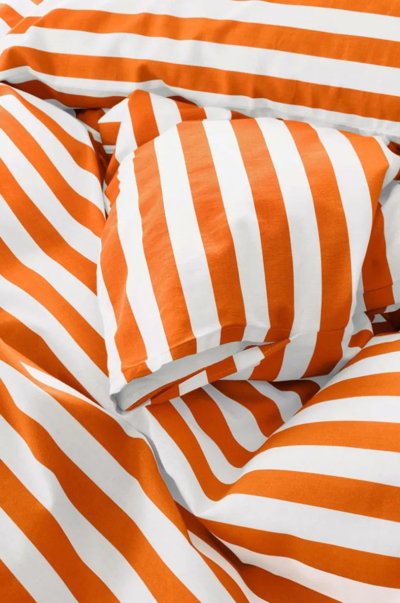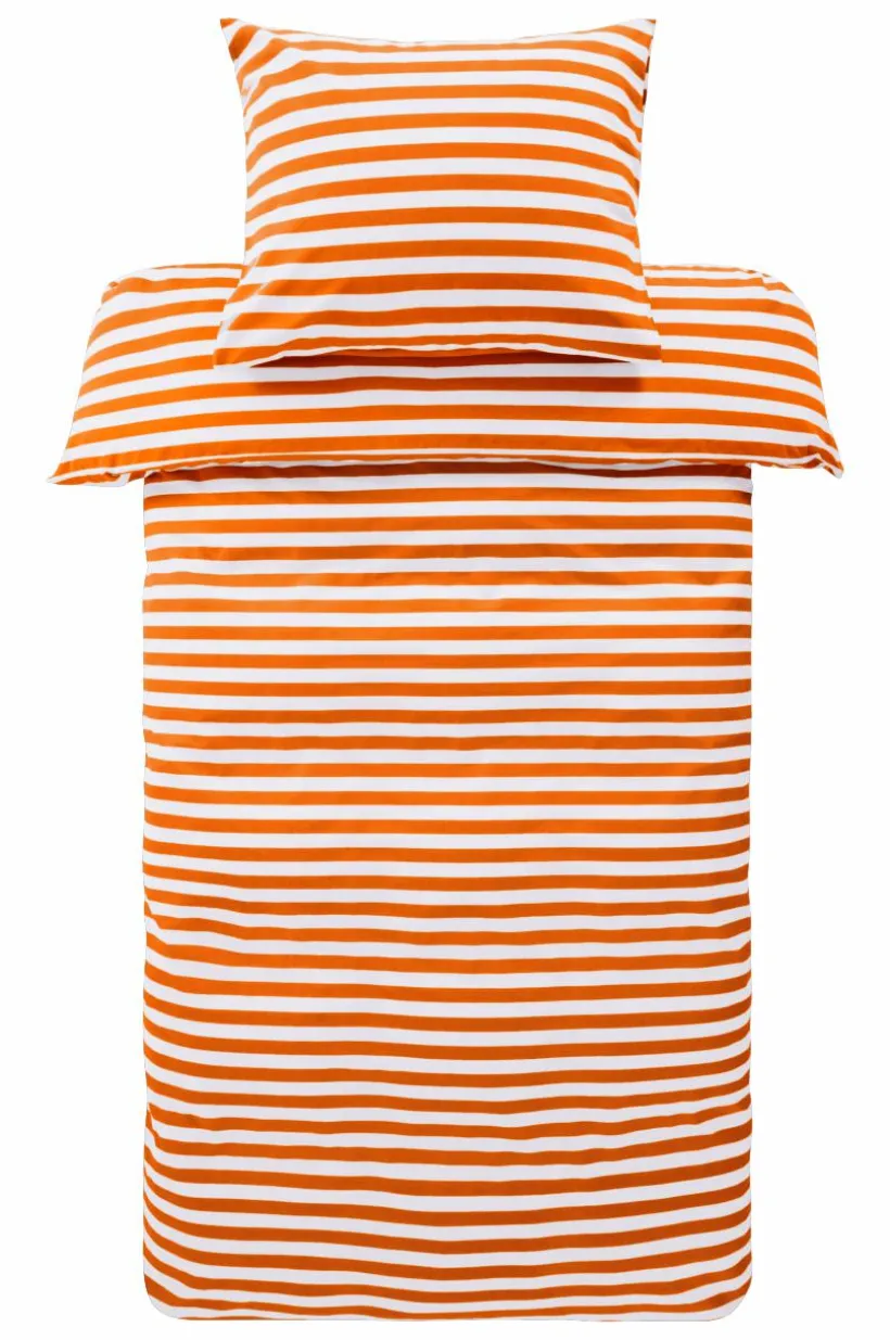 Randigt påslakanset i två delar, ett påslakan och ett örngott av bomull. Den tvärgående randningen är tryckt i fräscha, somriga färger och på båda sidor av örngott och påslakan. Bomull är en mjuk och behaglig kvalité som känns sval mot huden. Öppning i övre hörnen på påslakanet, som underlättar att trä påslakanet över täcket. Trådtäthet på 144 tc. (Trådtätheten talar om antalet trådar, thread counts, per kvadrattum i ett tyg. Ju högre trådtäthet desto högre kvalité. Med undantag för linne som ofta vävs glesare för att få den rätta känslan.)