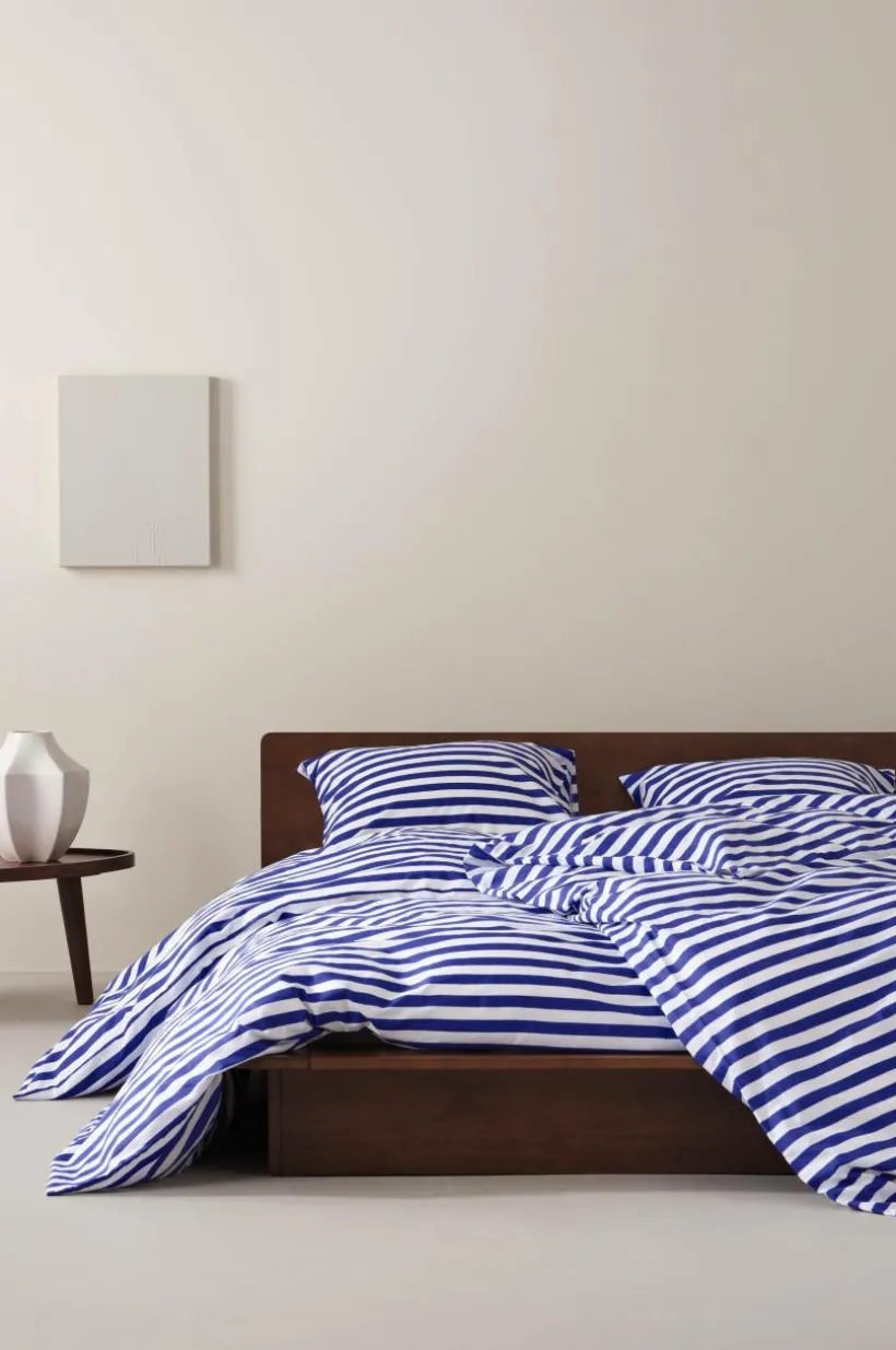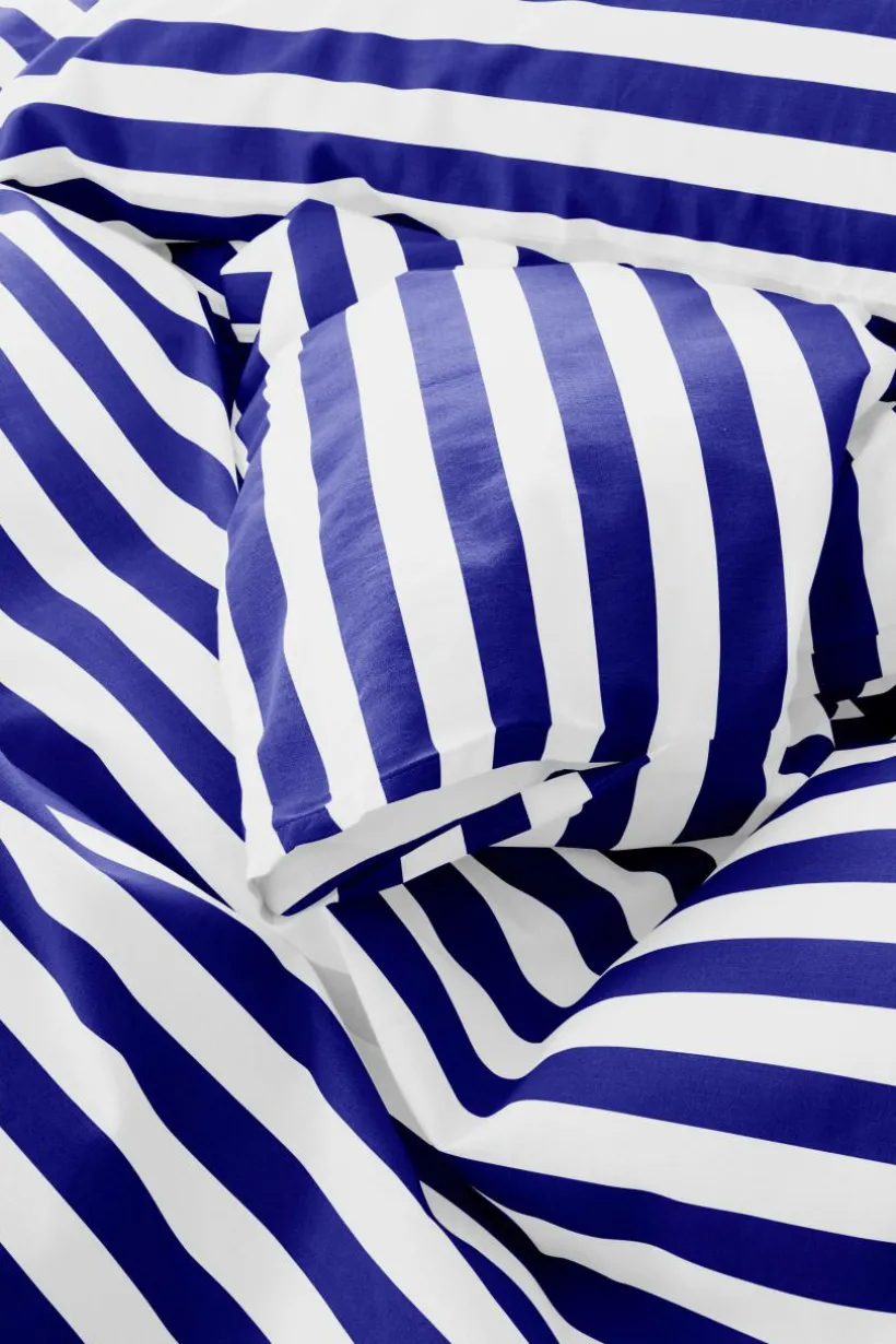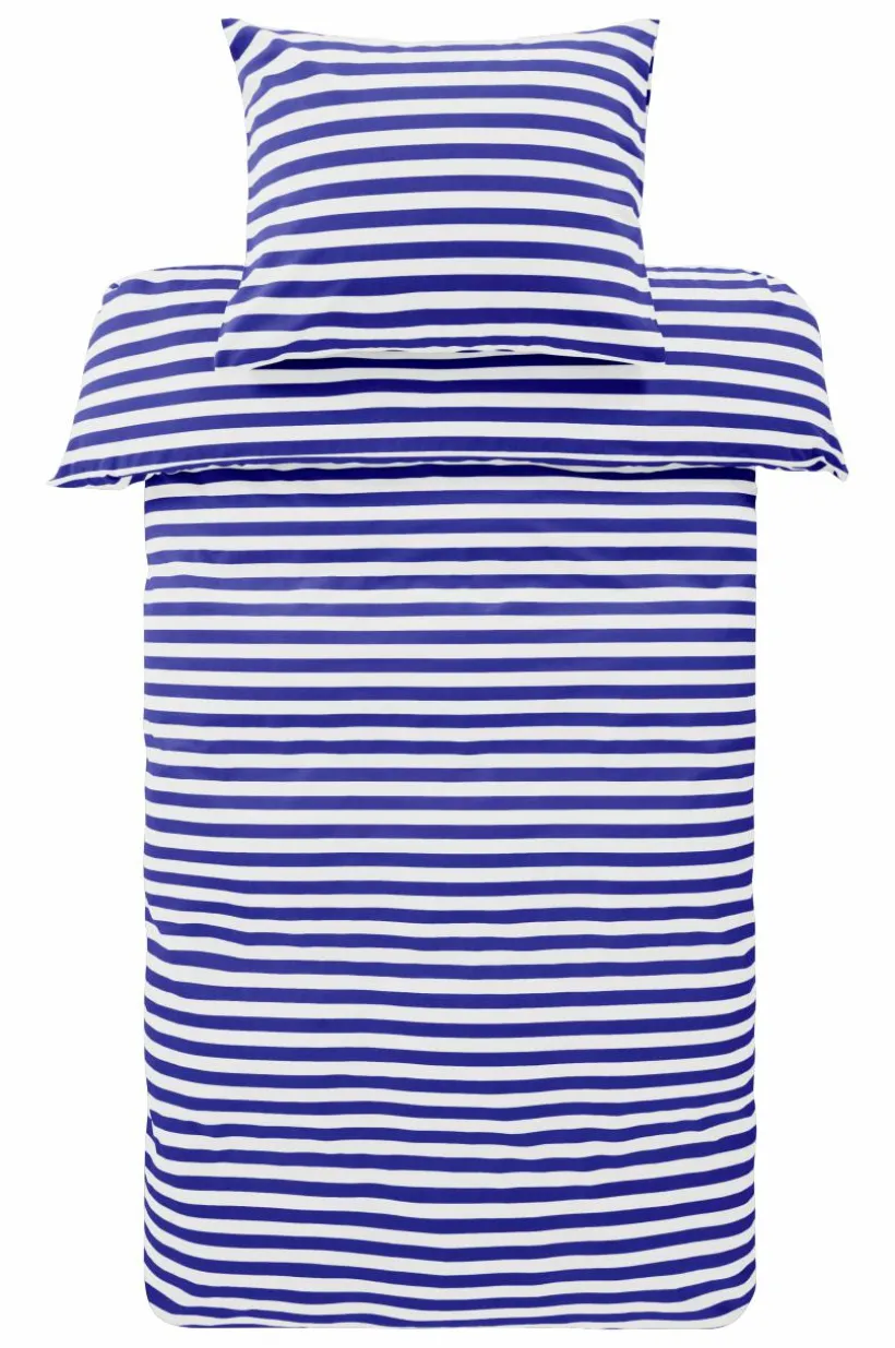 Randigt påslakanset i två delar, ett påslakan och ett örngott av bomull. Den tvärgående randningen är tryckt i fräscha, somriga färger och på båda sidor av örngott och påslakan. Bomull är en mjuk och behaglig kvalité som känns sval mot huden. Öppning i övre hörnen på påslakanet, som underlättar att trä påslakanet över täcket. Trådtäthet på 144 tc. (Trådtätheten talar om antalet trådar, thread counts, per kvadrattum i ett tyg. Ju högre trådtäthet desto högre kvalité. Med undantag för linne som ofta vävs glesare för att få den rätta känslan.)