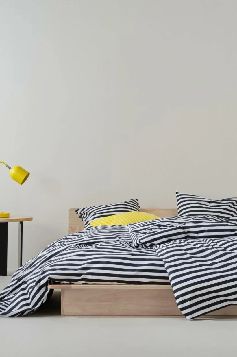 Randigt påslakanset i två delar, ett påslakan och ett örngott av bomull. Den tvärgående randningen är tryckt i fräscha, somriga färger och på båda sidor av örngott och påslakan. Bomull är en mjuk och behaglig kvalité som känns sval mot huden. Öppning i övre hörnen på påslakanet, som underlättar att trä påslakanet över täcket. Trådtäthet på 144 tc. (Trådtätheten talar om antalet trådar, thread counts, per kvadrattum i ett tyg. Ju högre trådtäthet desto högre kvalité. Med undantag för linne som ofta vävs glesare för att få den rätta känslan.)