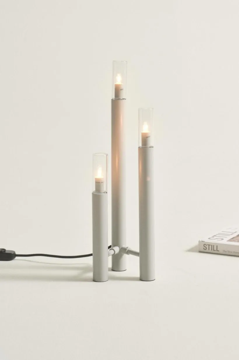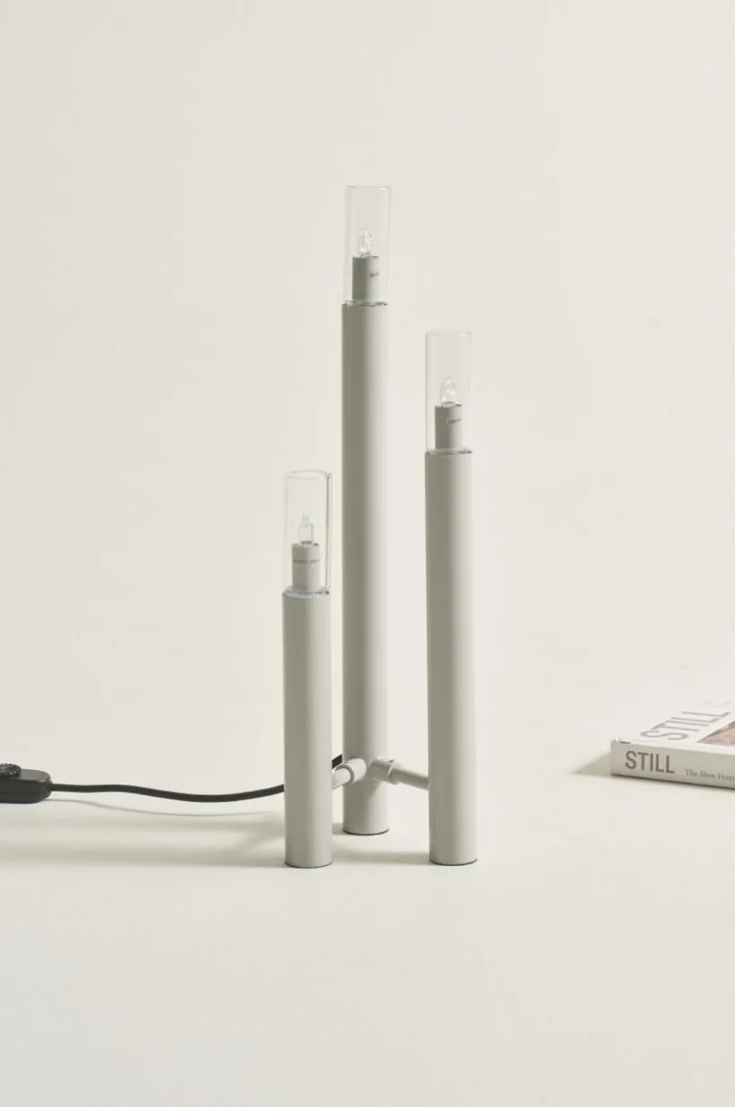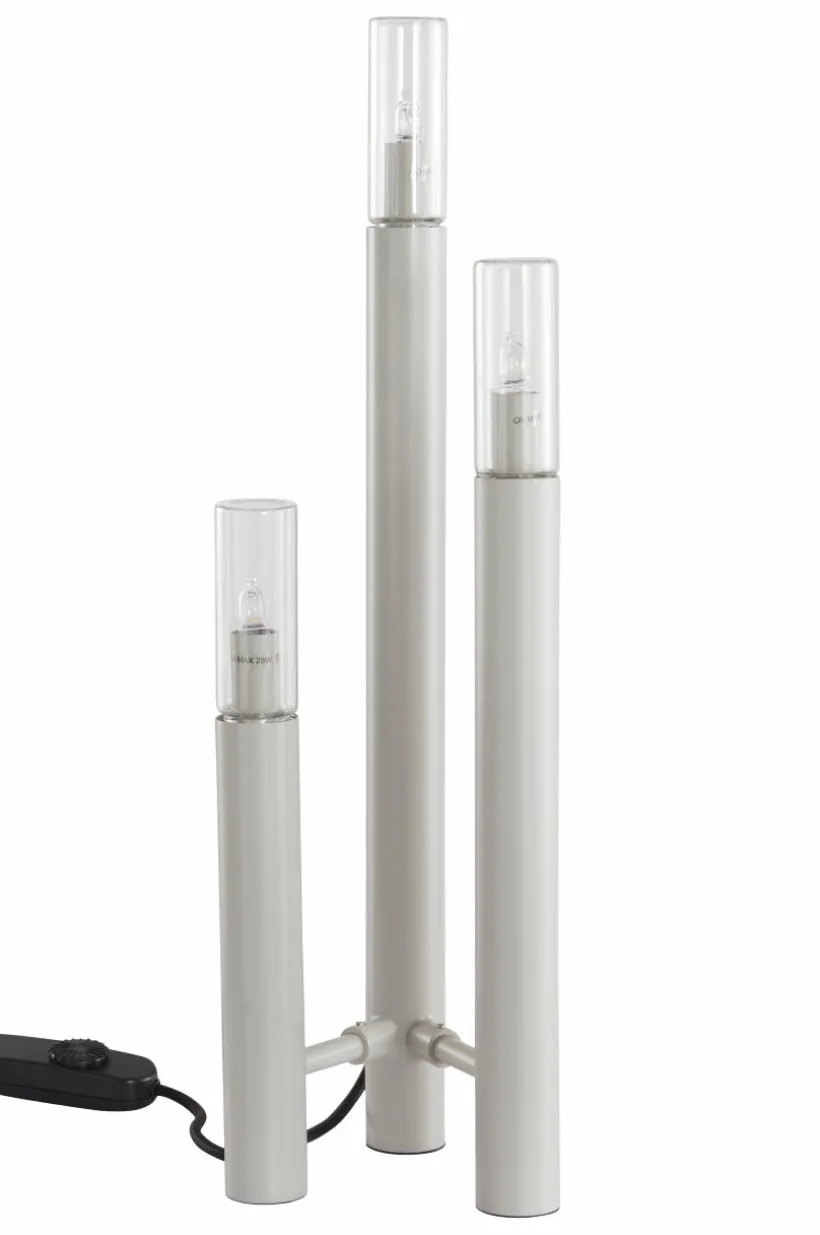 Bordslampa av järn där klarglas kombinerats med mattlackerad finish. Lampan är stilren och har tre ljuskällor som lyser fint. Strömbrytare med dimmerfunktion.