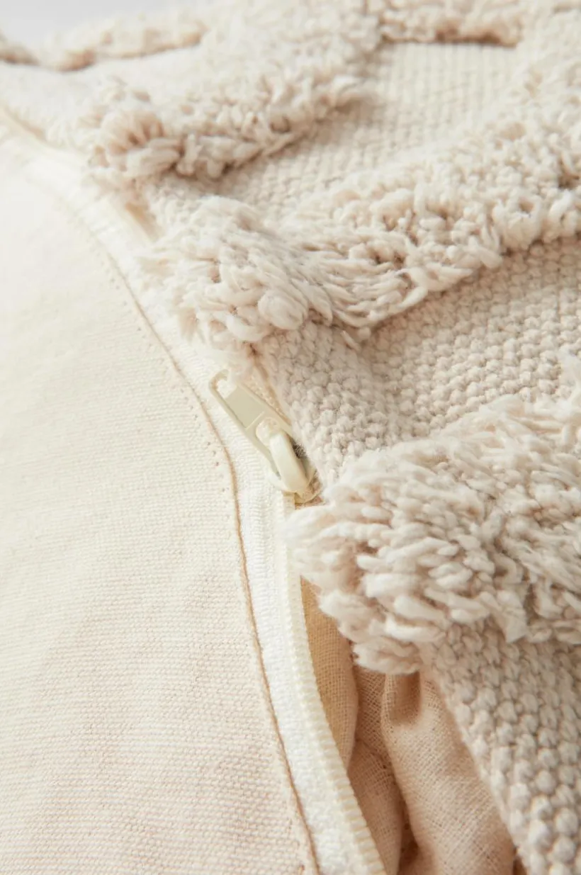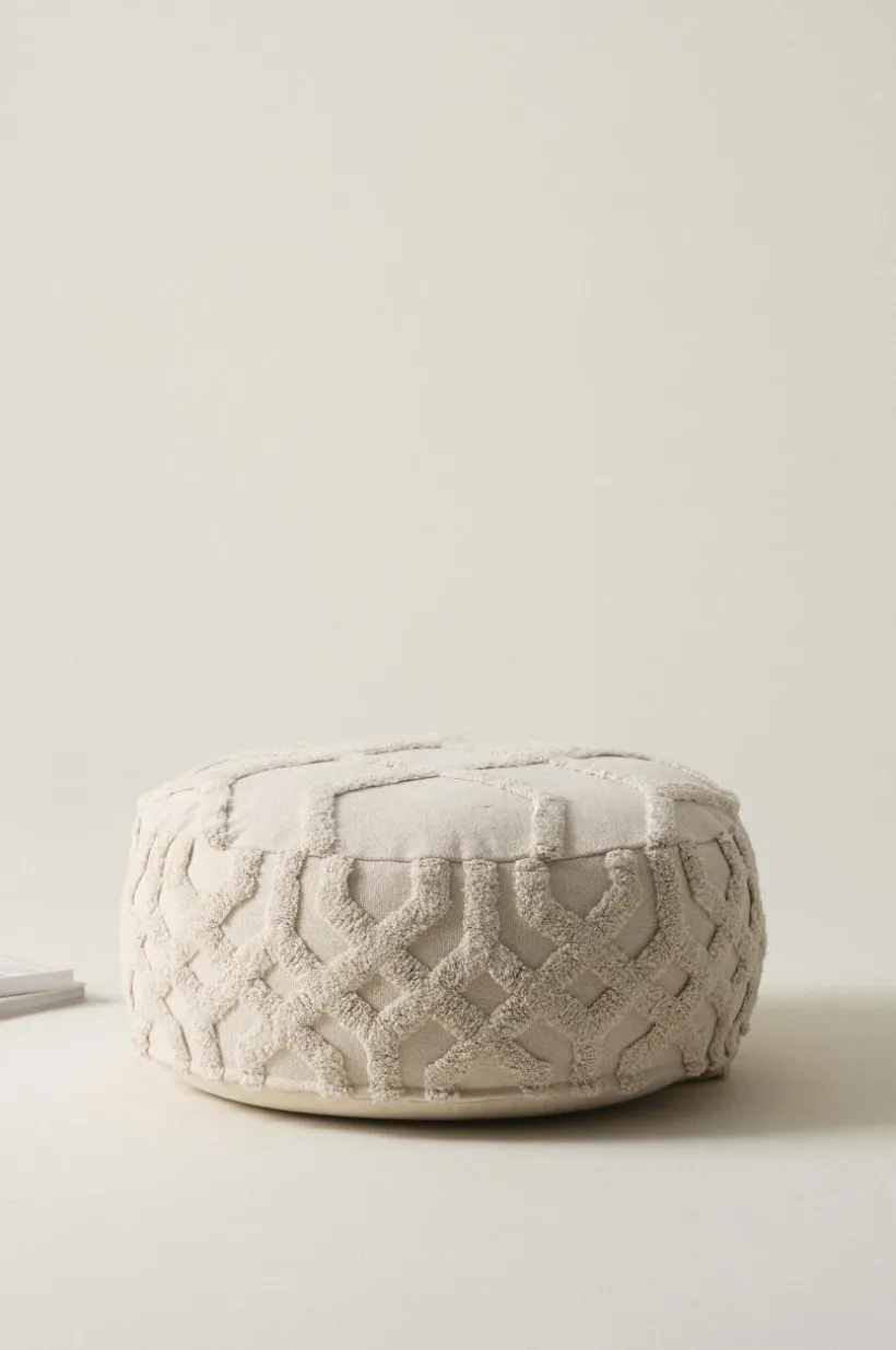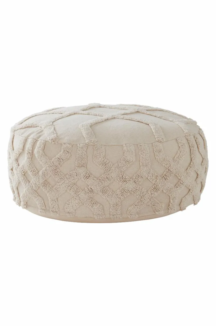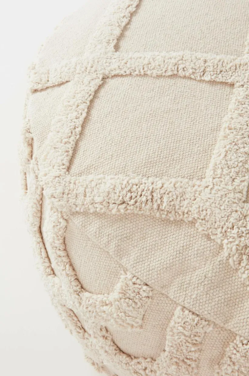 Rund puff av kraftigt, vävt tyg med tuftat mönster ton i ton, luggen bildar ett snyggt geometriskt mönster. Puffen har en innerkudde med mjuk stoppning av polystyrenkulor som formar sig bekvämt när du sitter på den. Dragkedja längs nederkanten, så du kan ta av överdraget. Lugghöjd 1 cm.