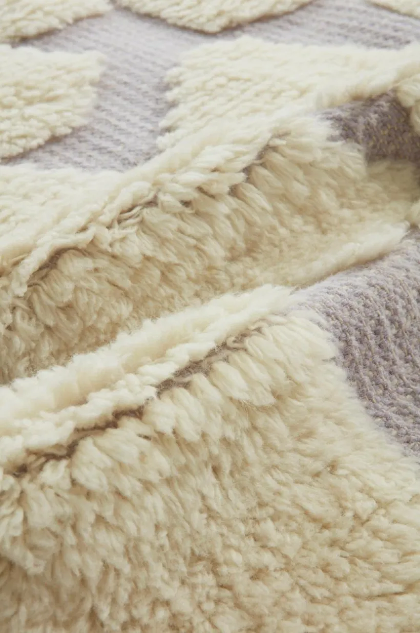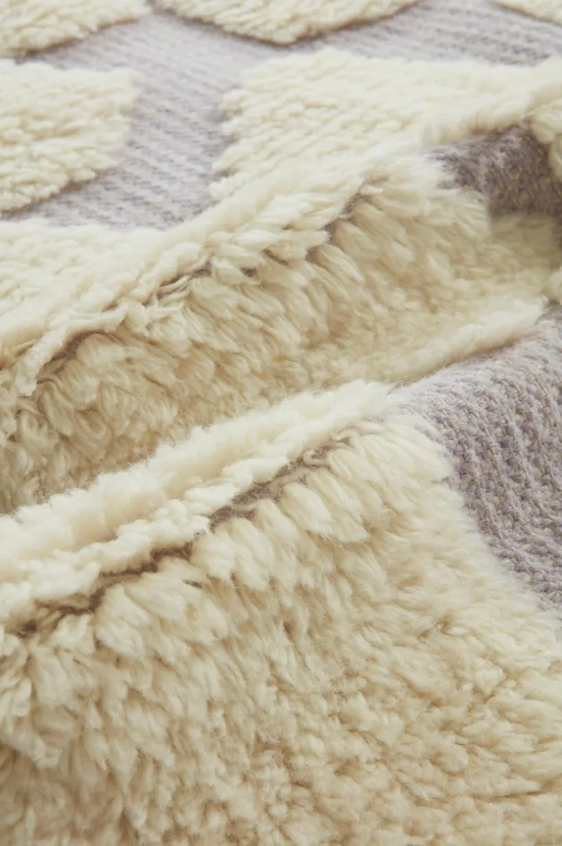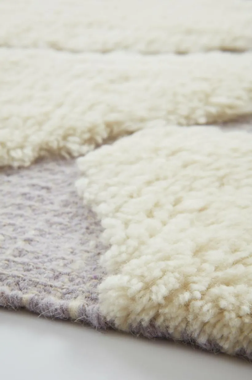 Handtuftad matta av ull med inslag av bomull. Mönstret har skapats av ljus, mjuk lugg på färgad, vävd botten. Ull ger en naturligt varm och praktiskt smutsavvisande matta. Lugghöjd 1,8-2 cm. Tjocklek 2-2,2 cm. 1400-1600 g/m².