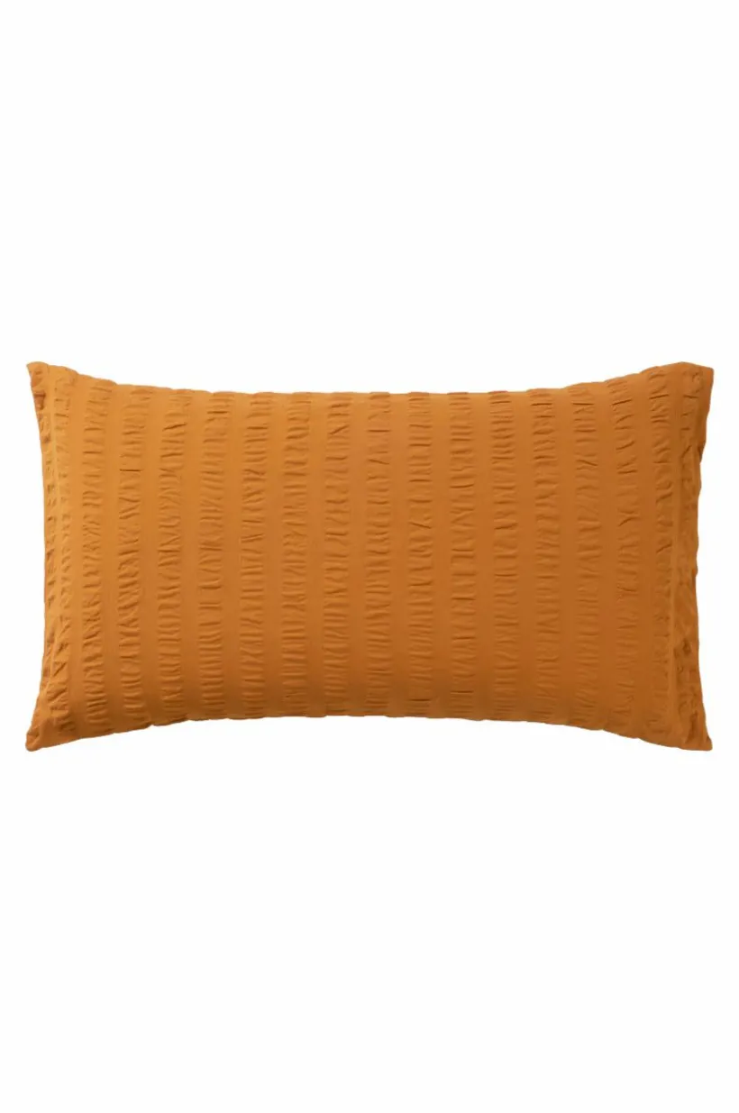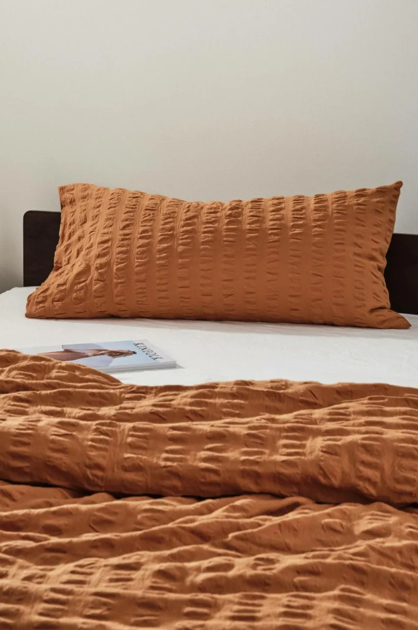 Örngott i skön bäckebölja av certifierad, ekologisk bomull. Bäckebölja är en luftig kvalité och det bubbliga tyget känns svalt och andas behagligt. Serien KIMMI är enfärgad och samtidigt randig. Varannan rand är slätt, vävt tyg och varannan rand är i bäckebölja. Tyget är garnfärgat och tvättat för att få en mjukare känsla. Trådtäthet på 120 tc. (Trådtätheten talar om antalet trådar, thread counts, per kvadrattum i ett tyg. Ju högre trådtäthet desto högre kvalité.)