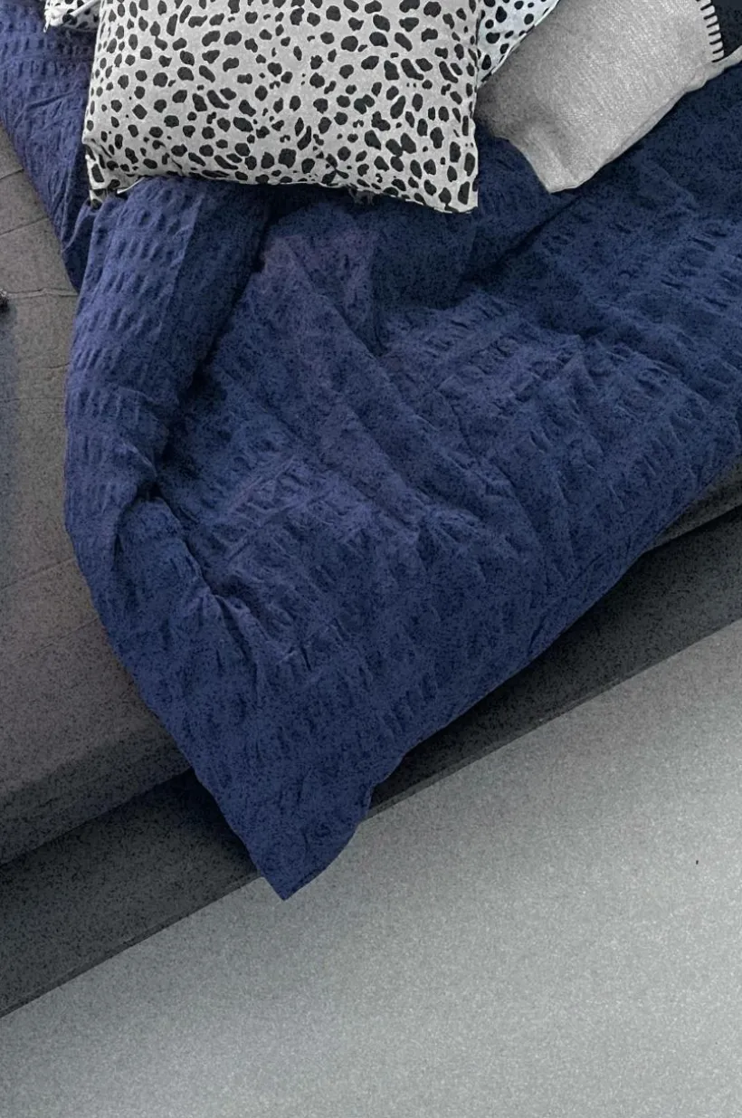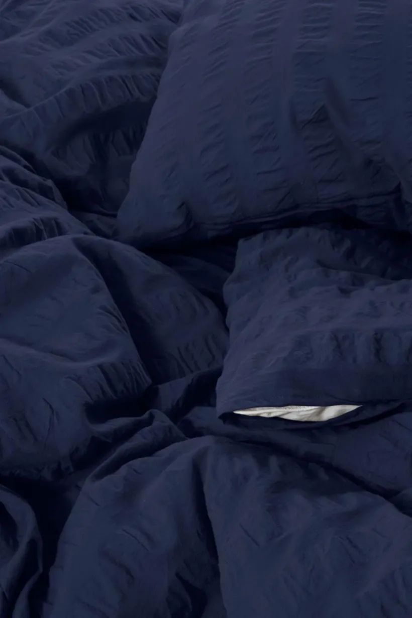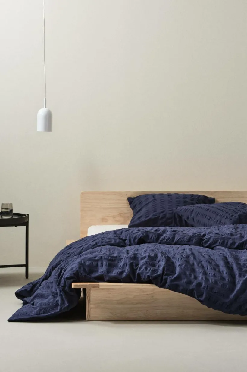 Påslakanset med ett extra brett påslakan och två örngott i skön bäckebölja av certifierad, ekologisk bomull. Bäckebölja är en luftig kvalité och det bubbliga tyget känns svalt och andas behagligt. Serien KIMMI är enfärgad och samtidigt randig. Varannan rand är slätt, vävt tyg och varannan rand är i bäckebölja. Tyget är garnfärgat och tvättat för att få en mjukare känsla. Öppning i övre hörnen på påslakanet, som underlättar att trä påslakanet över täcket. Trådtäthet på 120 tc. (Trådtätheten talar om antalet trådar, thread counts, per kvadrattum i ett tyg. Ju högre trådtäthet desto högre kvalité.)