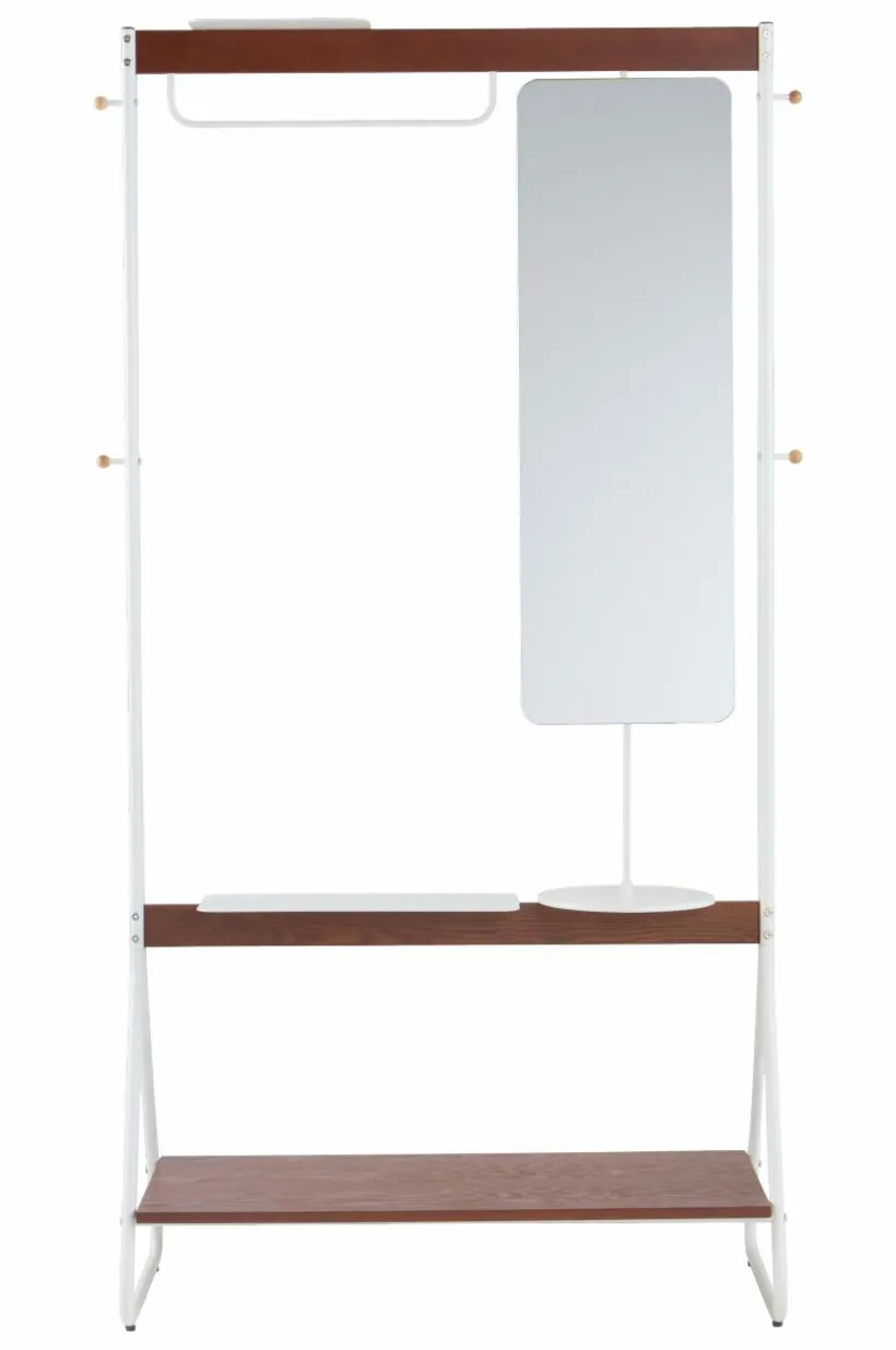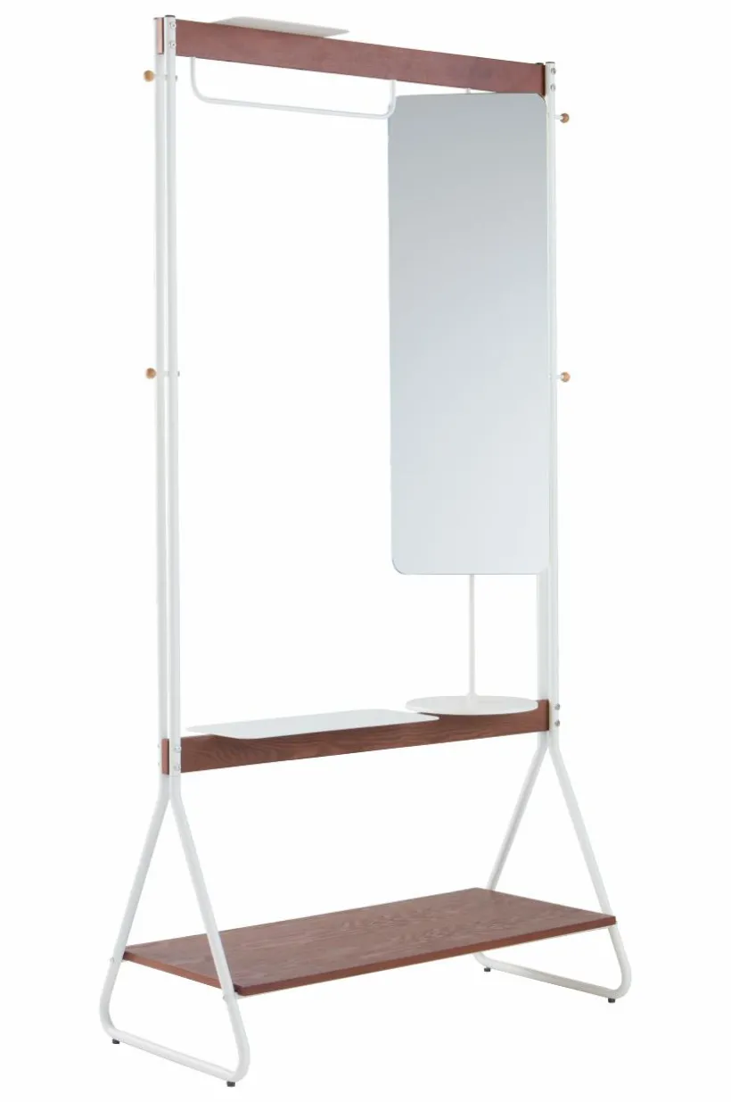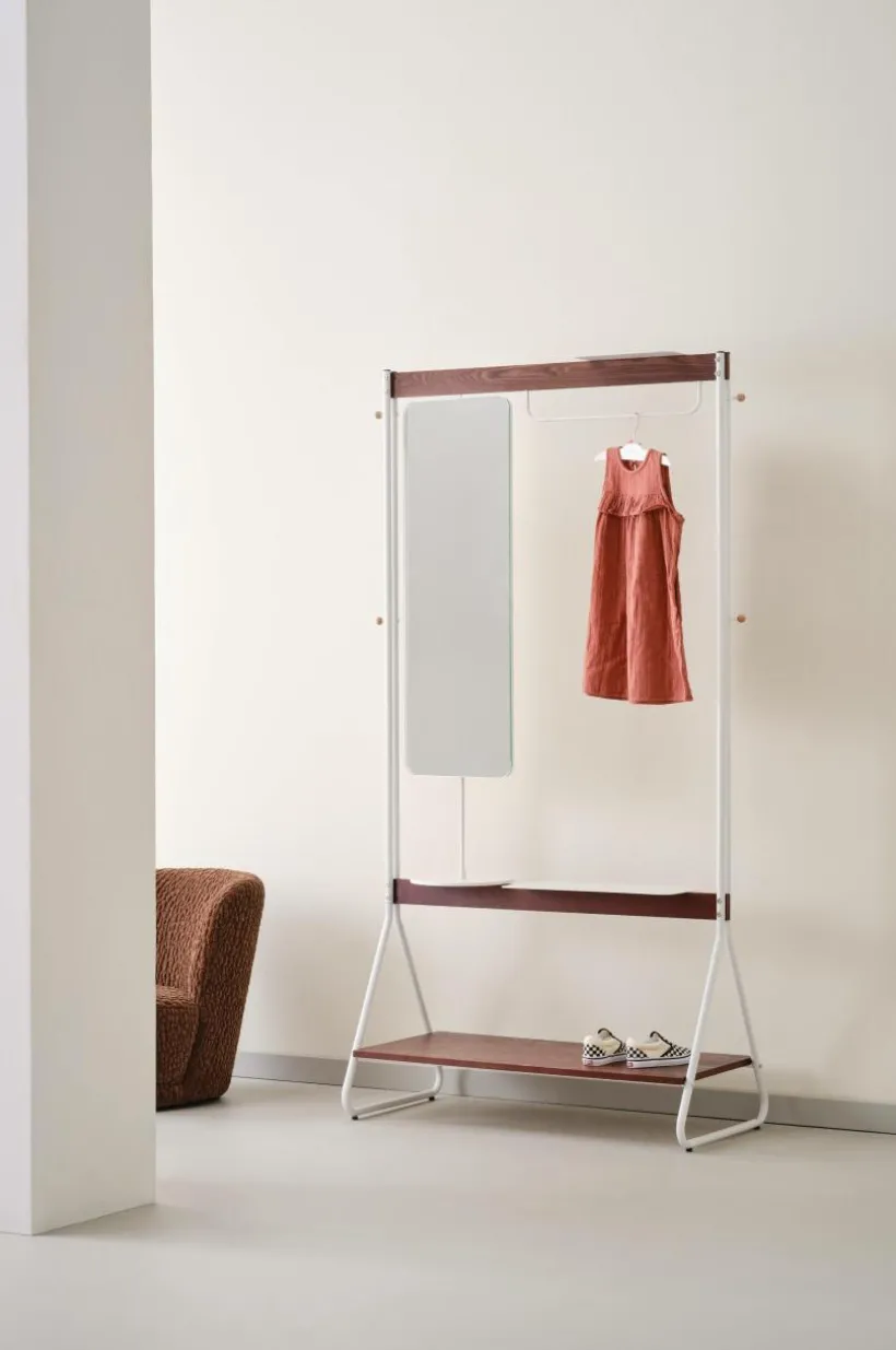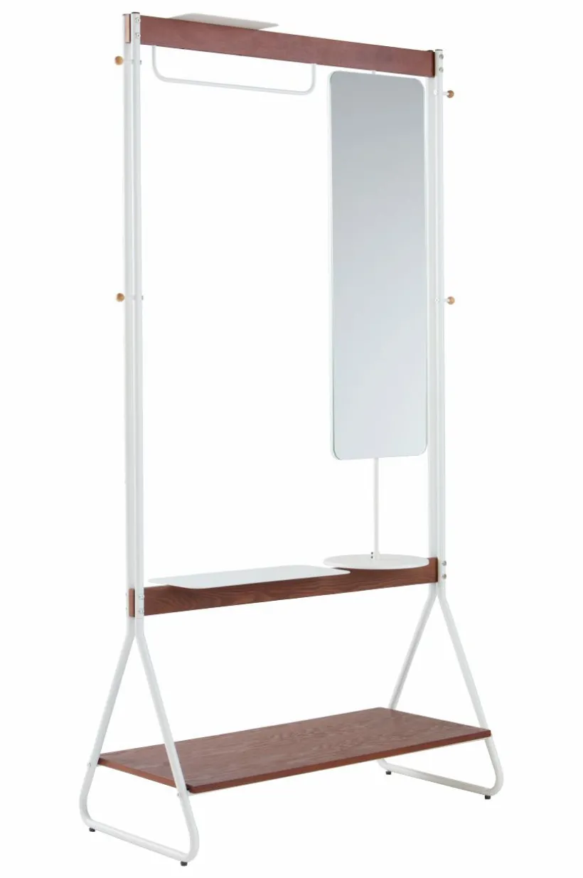 Klädhängare för det moderna barnrummet. Den har en stång, en stor hylla och en spegel. Mindre hyllor för småsaker. Tillverkad av järn med matt vit pulverlackering. Hyllorna är tillverkade av MDF med brun askfanér.