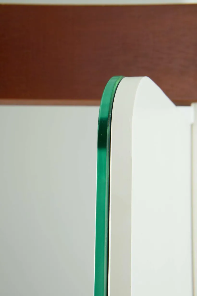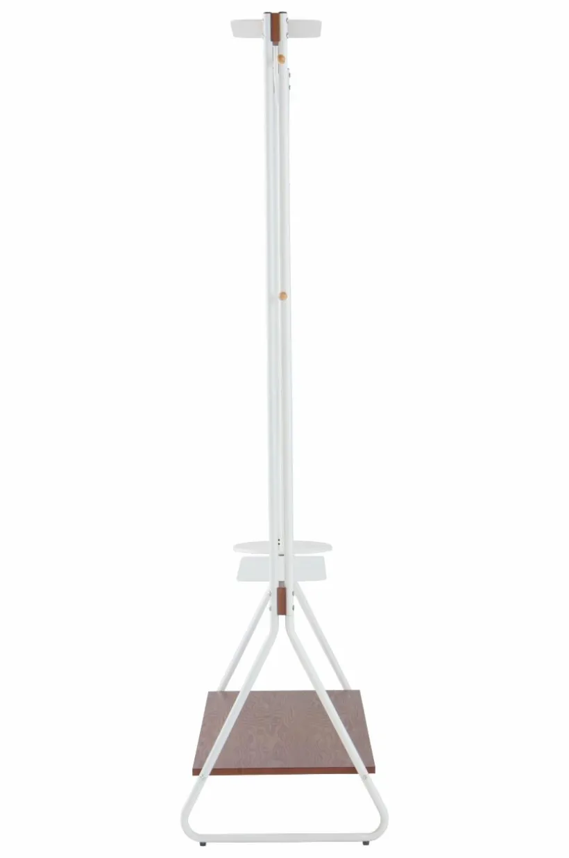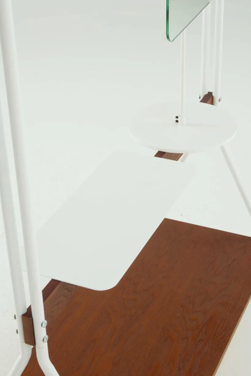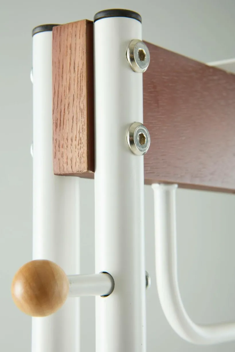 Klädhängare för det moderna barnrummet. Den har en stång, en stor hylla och en spegel. Mindre hyllor för småsaker. Tillverkad av järn med matt vit pulverlackering. Hyllorna är tillverkade av MDF med brun askfanér.