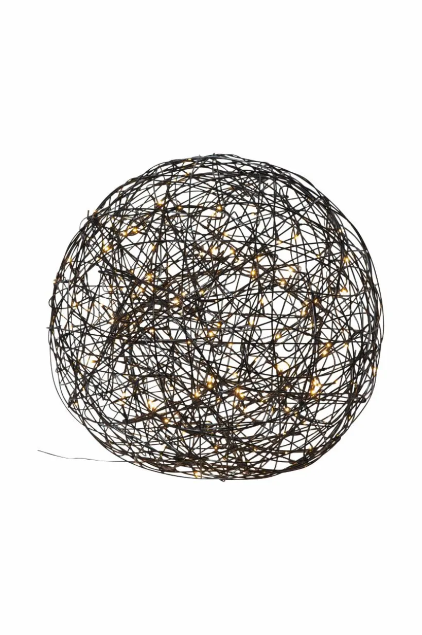 Dekorativ svart version av Trasselbollen för både inom- och utomhusbruk. I metall och aluminium. Inuti dekorationen finns en LED-ljusslinga med 150 LED som avger ett varmvitt sken. Höjd 50 cm, anslutningskabelns längd är 5 m. Designad av Charlotte Falck.