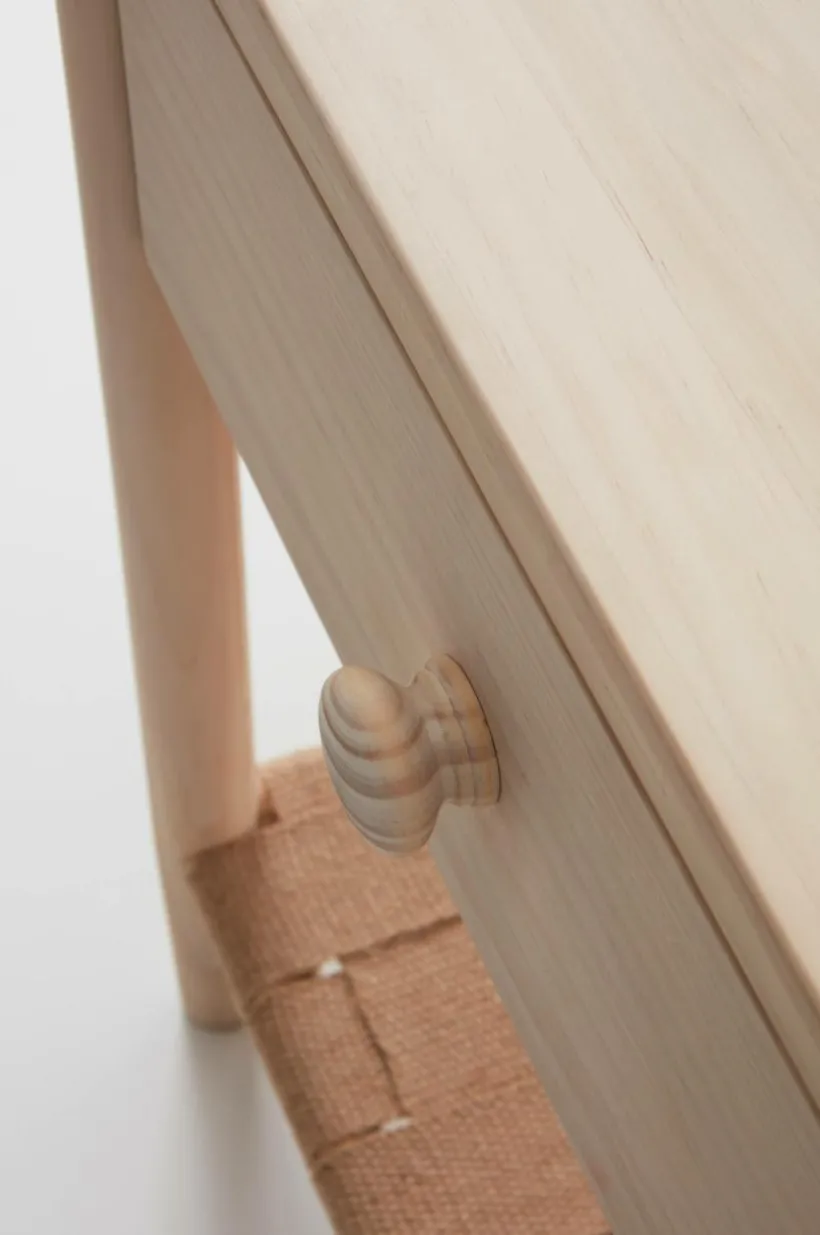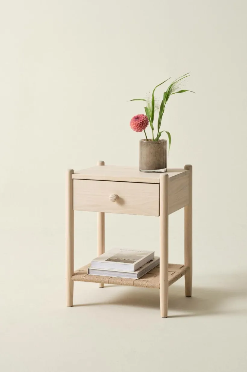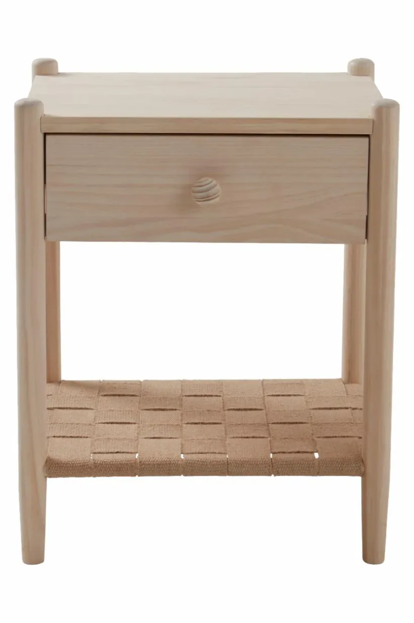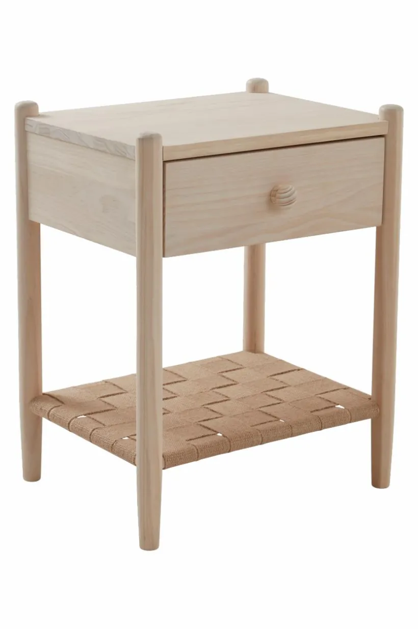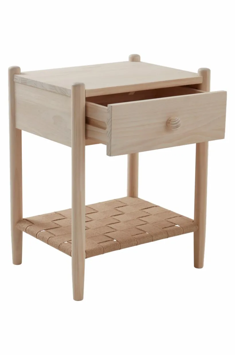KÖPENHAMN är ett sängbord med rena linjer och tidlös formgivning i sann nordisk anda. Den lätta och luftiga möbeln är tillverkad av jute och FSC-certifierad furu, fantastiska naturmaterial. Sängbordet har en praktisk låda upptill, som glider lätt. Hyllan under är flätad i vävda band av jute. Ytan på sängbordet är såpad.