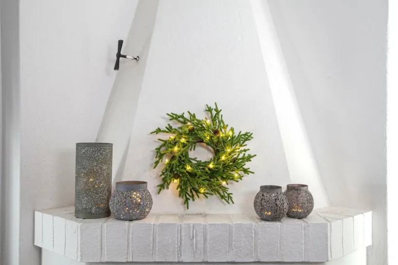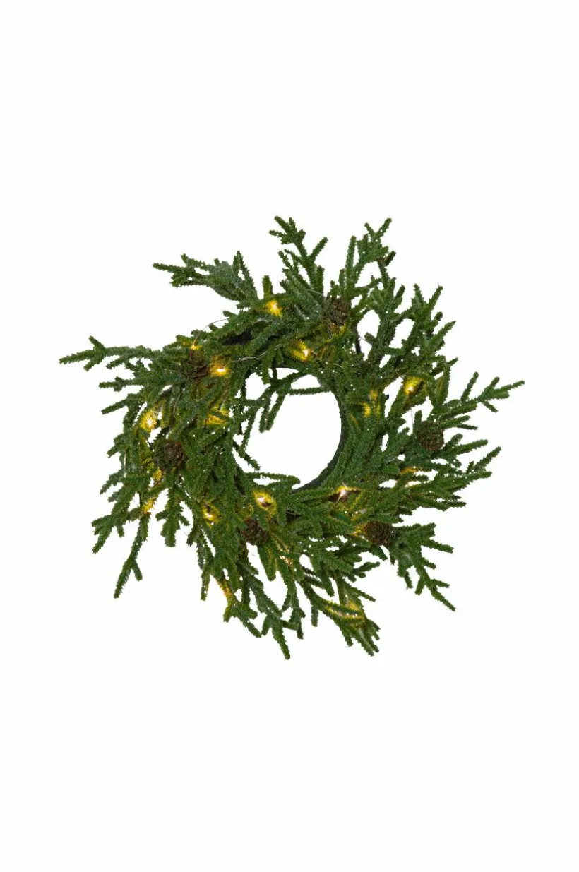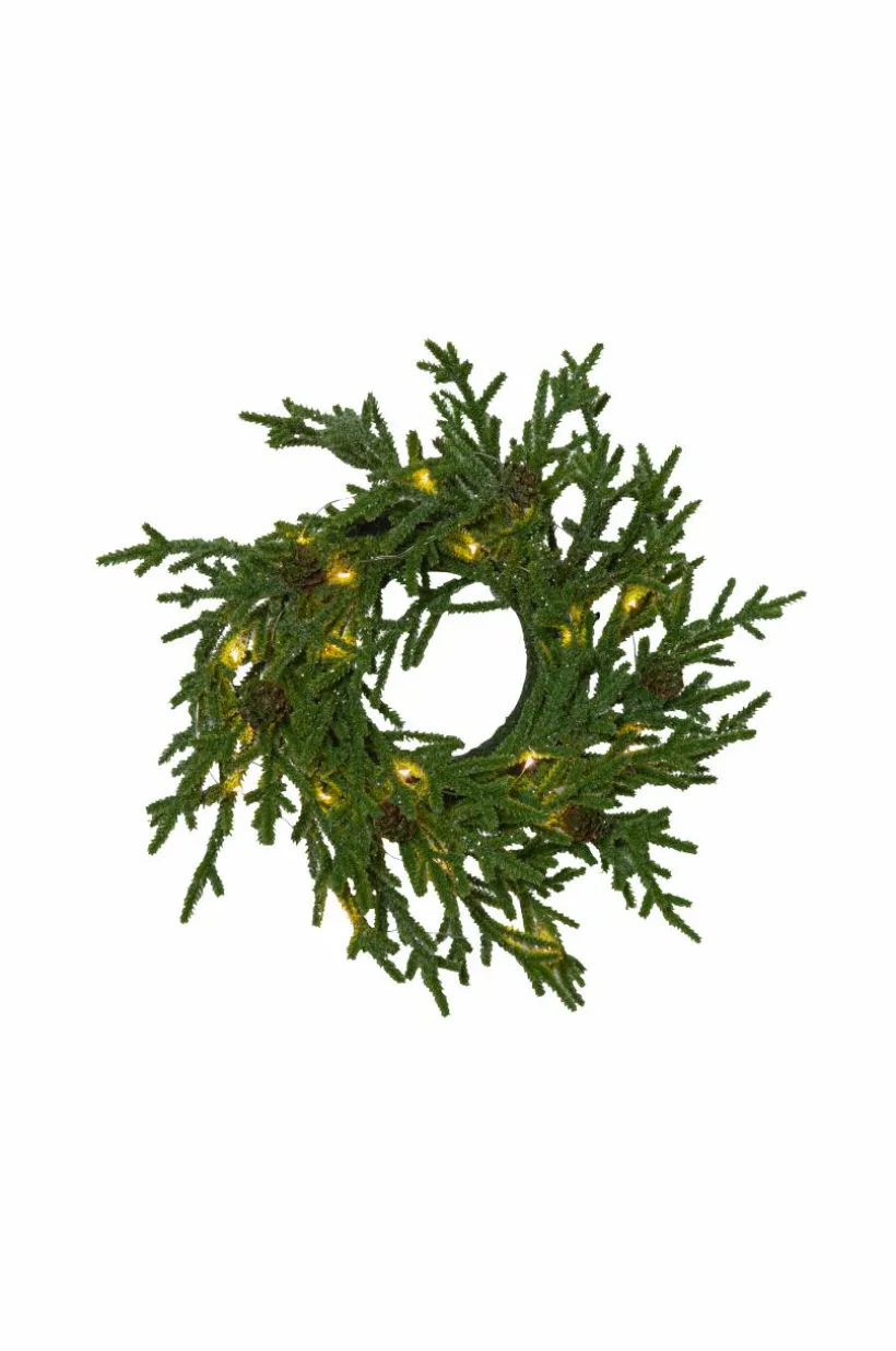 Krans i PE material med lite glitter och små kottar. Lyser upp med 20 varma dewdrops. Diameter 38 cm. Drivs med 3 batterier AAA (ingår ej). Lampans spänning 3V. Volt 4,5V.